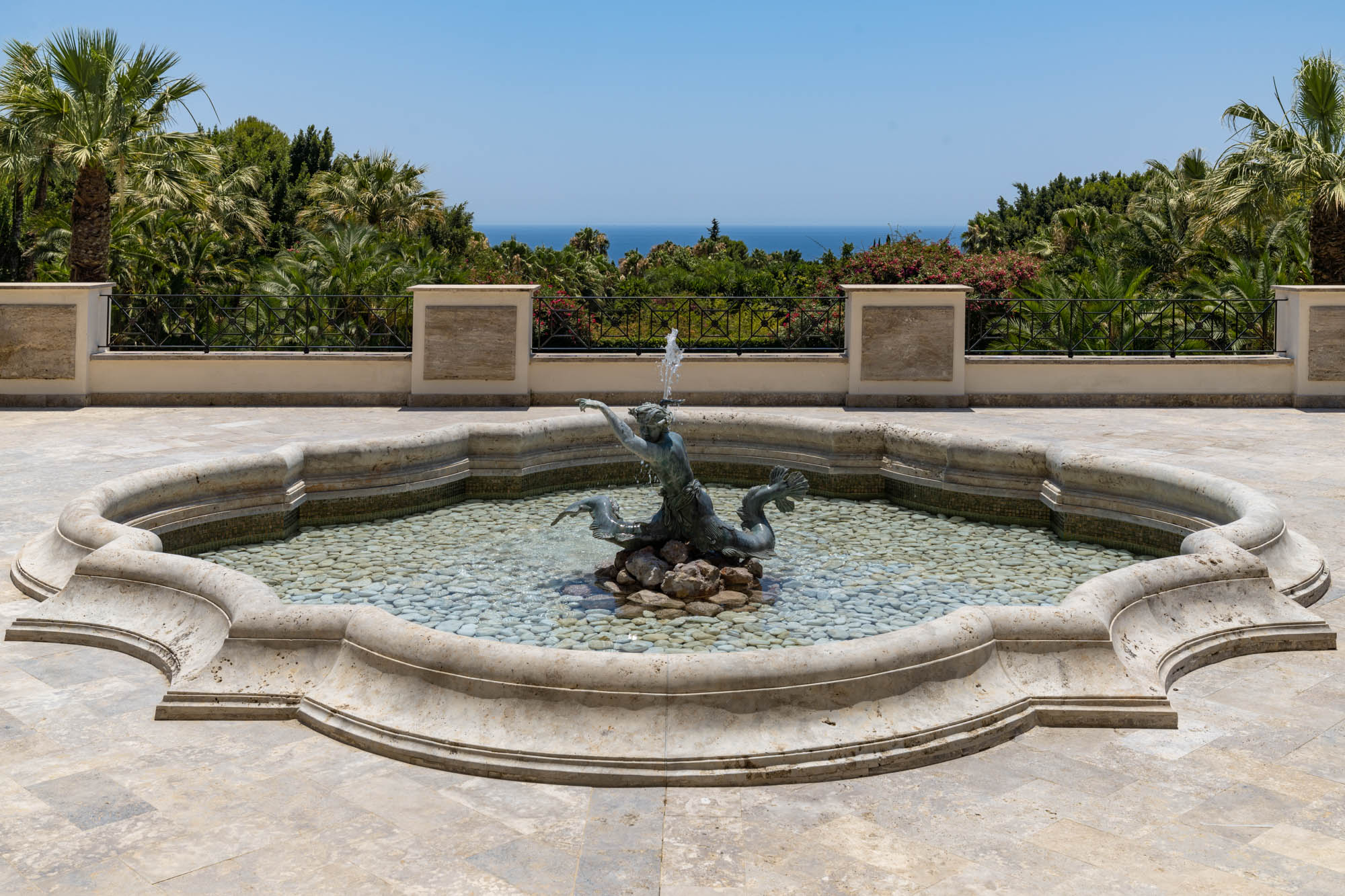 The gardens of Villa Cristaux bring to mind a stately home: stretching beyond vast terraces with ornamental fountains and manicured olive trees, green lawns unfold amongst palm trees and clipped fir hedges, culminating in far-reaching sea views.