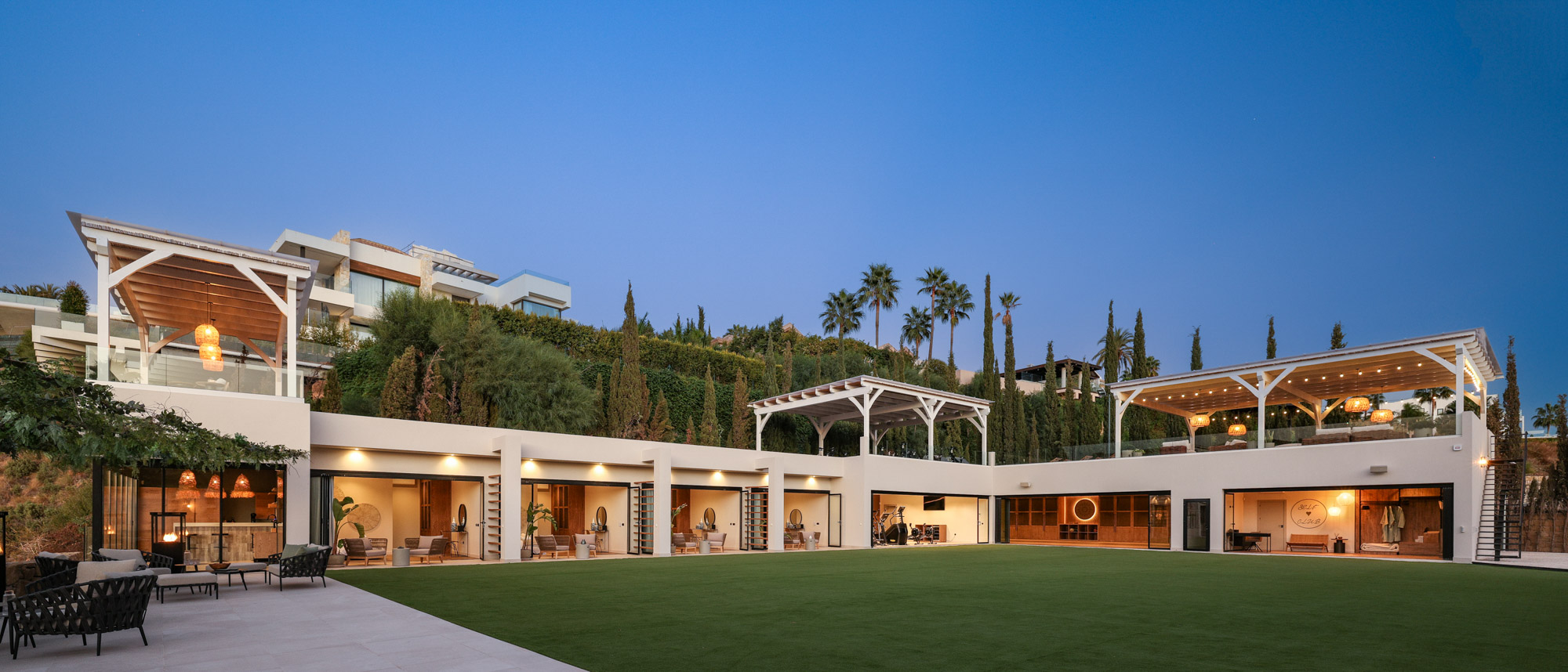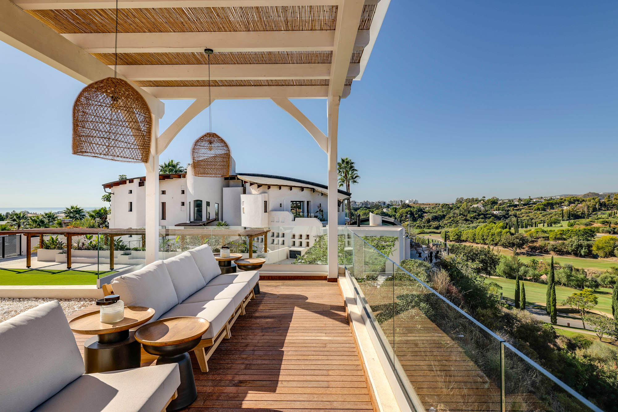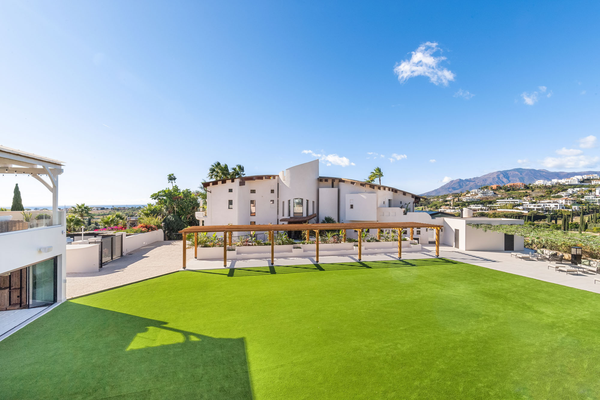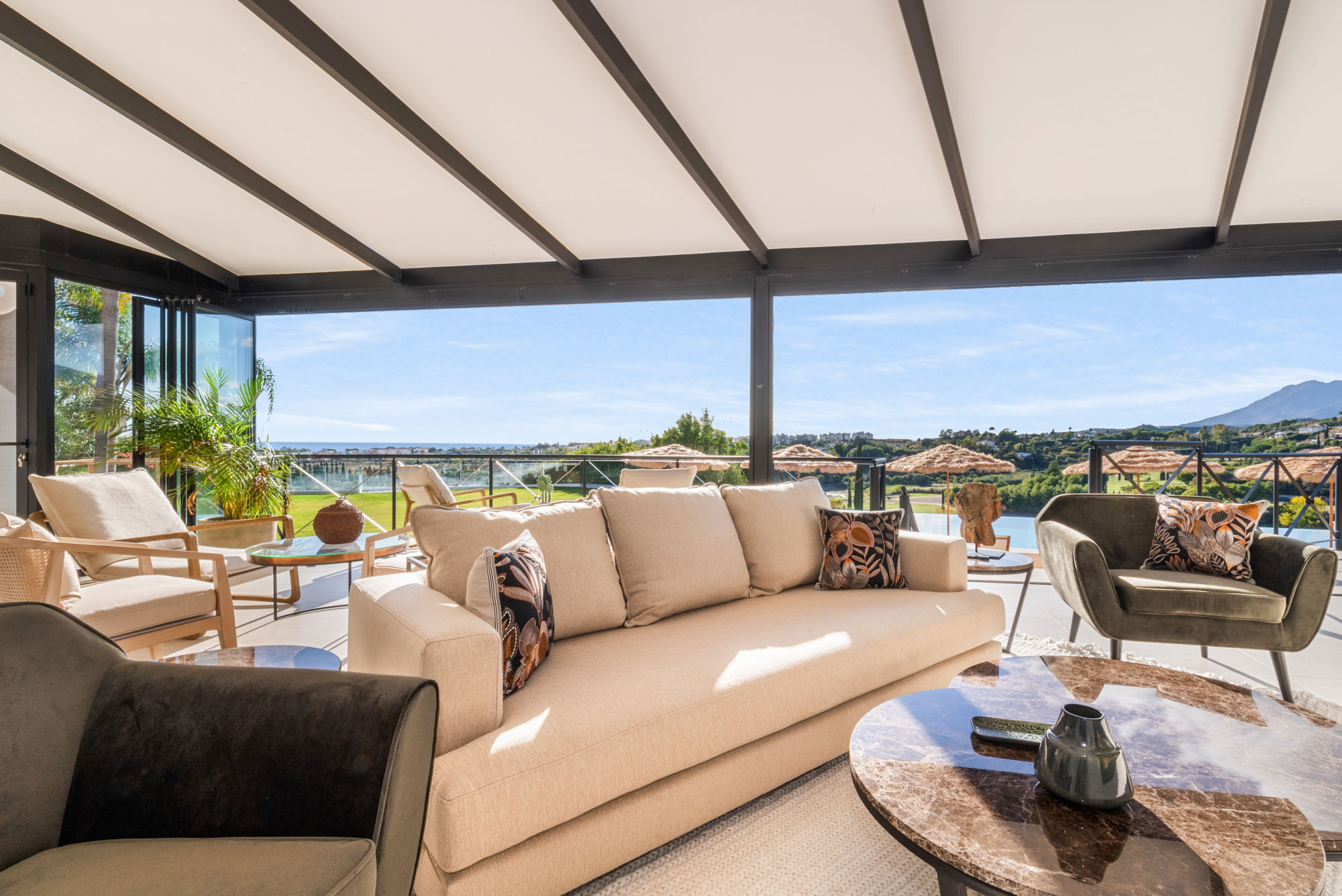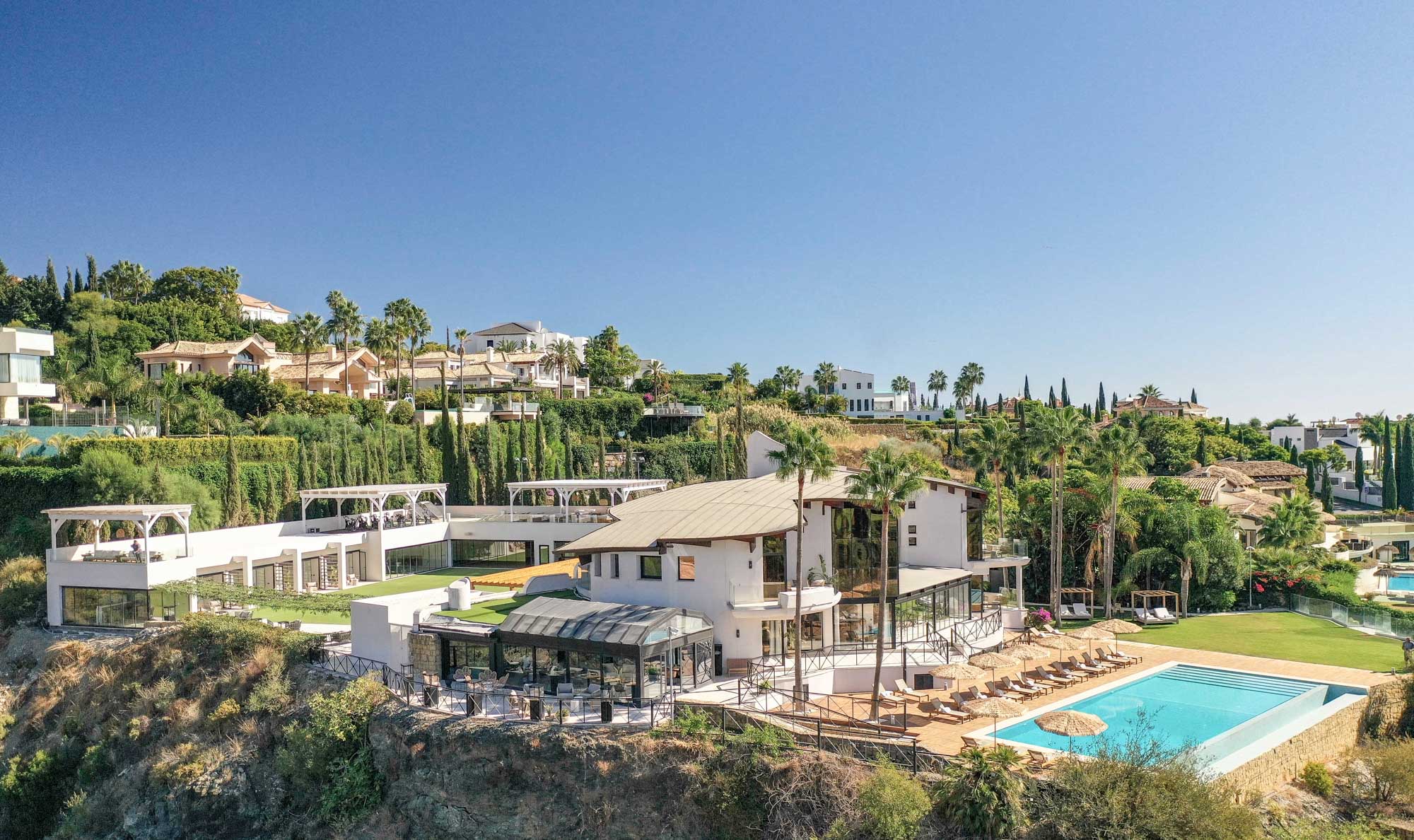 Framed by manicured gardens and towering palms, the villa’s position is discreet without feeling isolated. From its sun-drenched terraces and rooftop chillout zones, far-reaching views encompass verdant golf courses and the shimmering Med. In the distance across the straits of Gibraltar, the coastline of Morocco stands proud on a clear day.