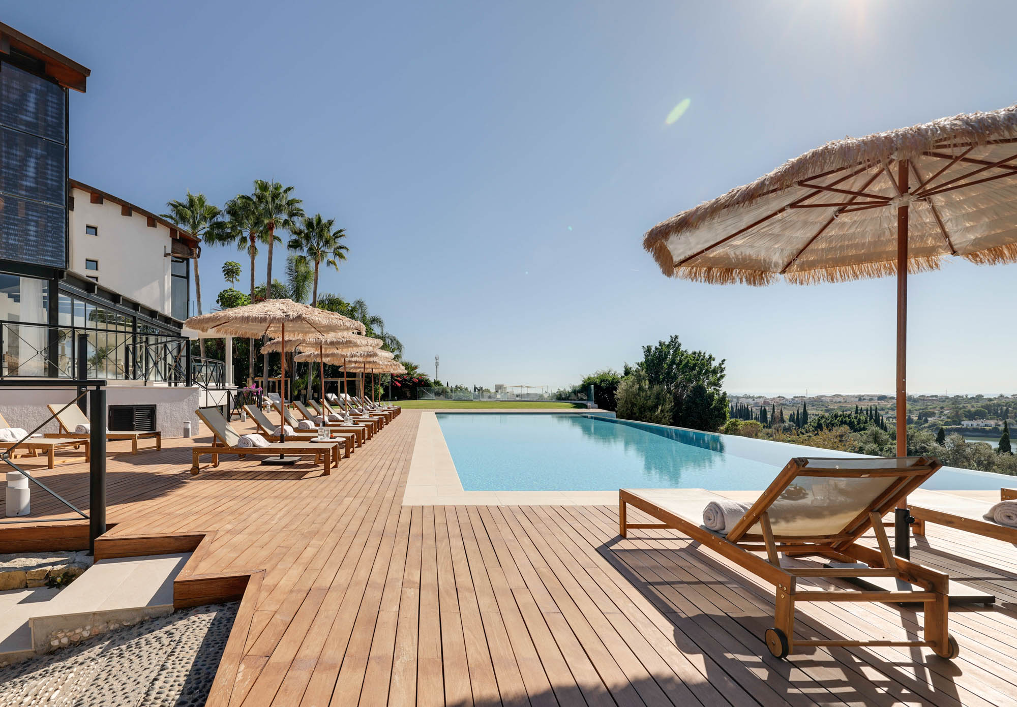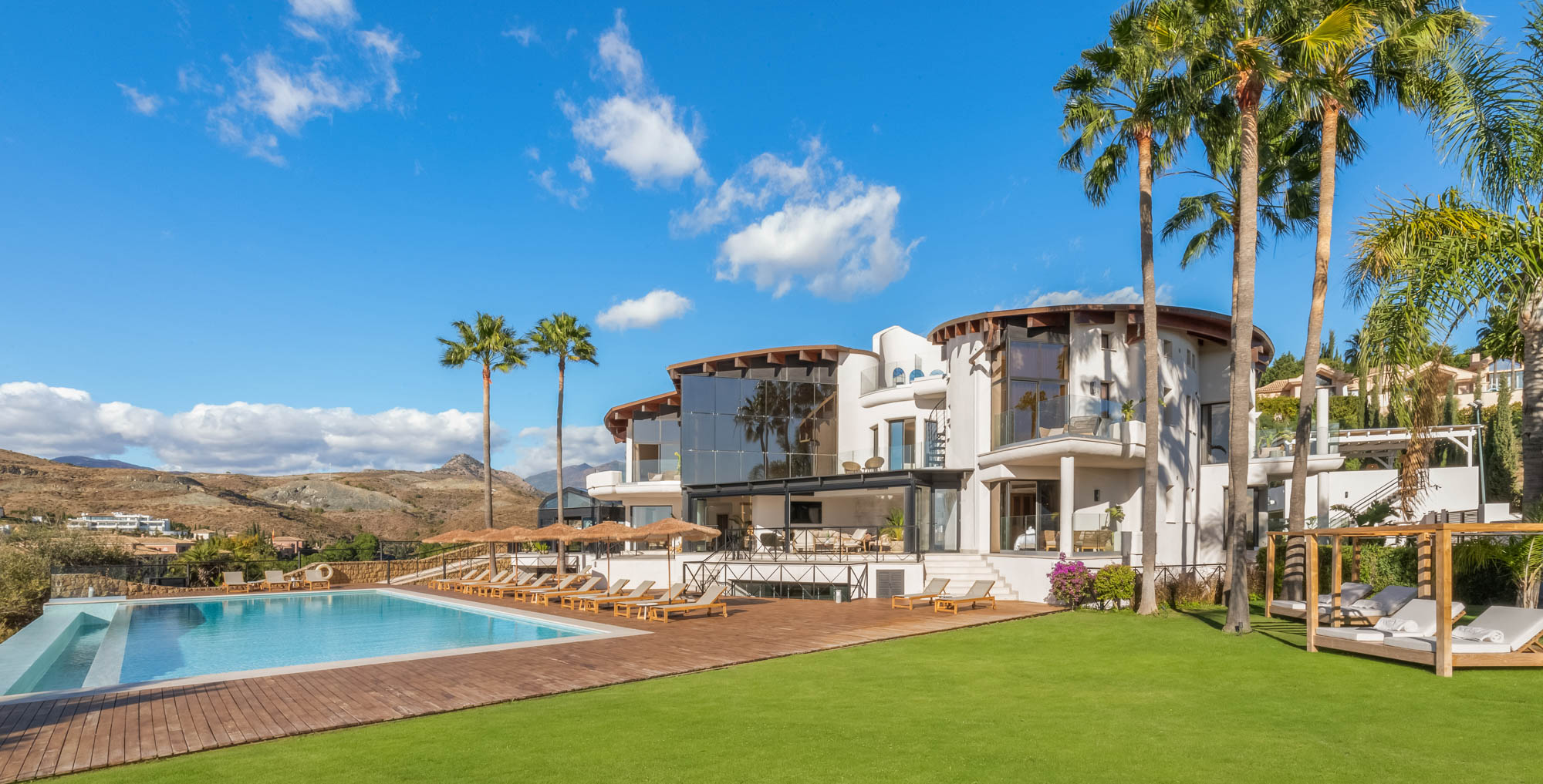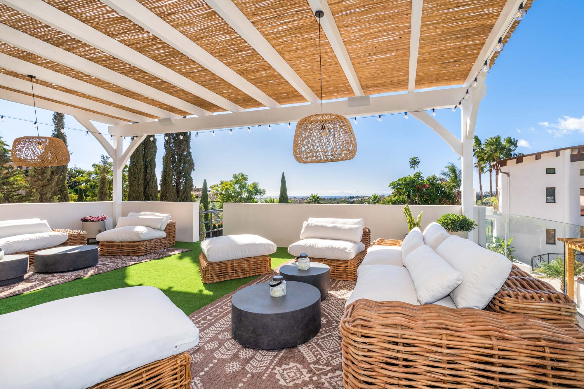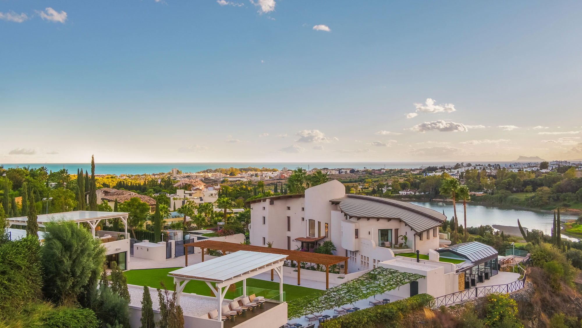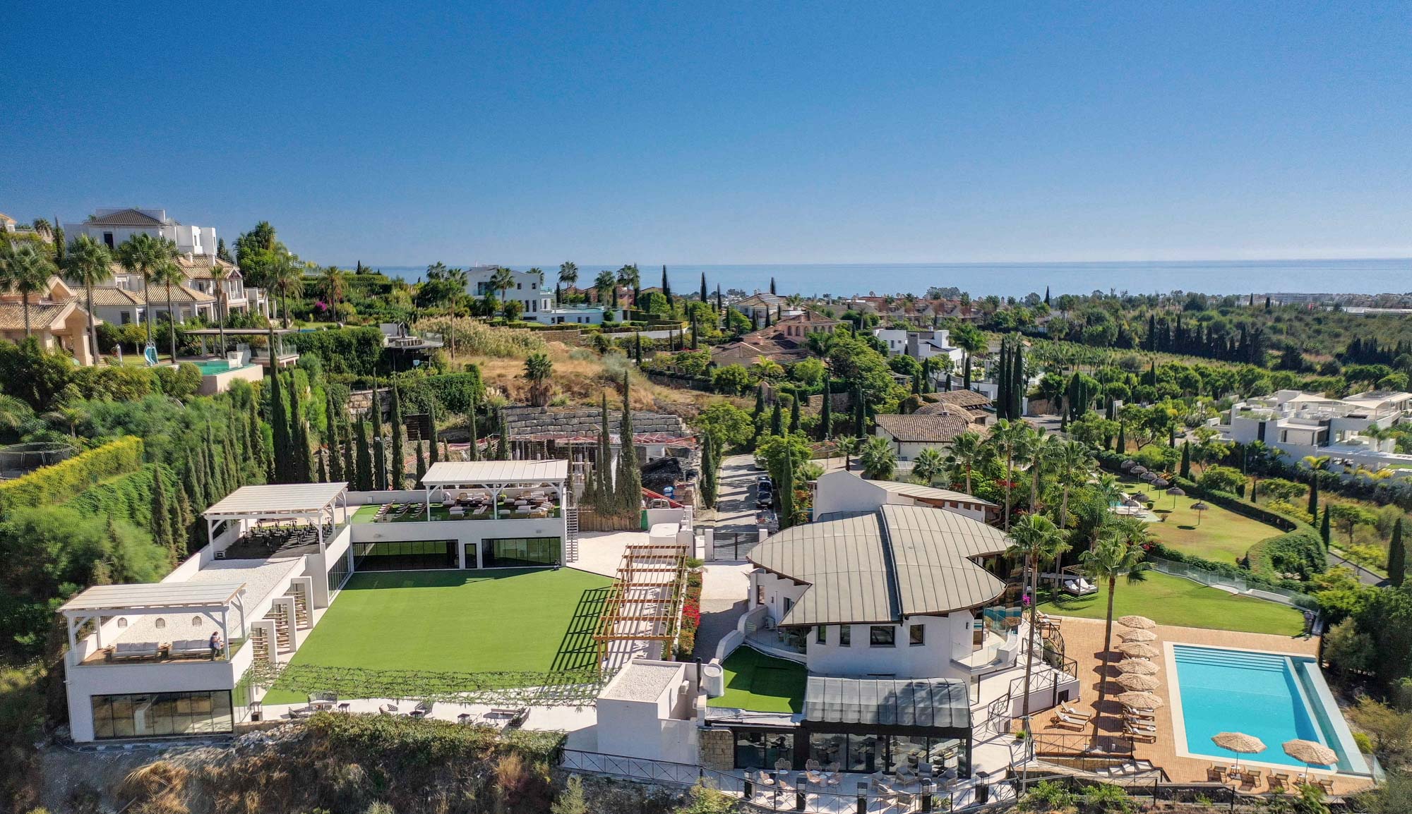 Framed by manicured gardens and towering palms, the villa’s position is discreet without feeling isolated. From its sun-drenched terraces and rooftop chillout zones, far-reaching views encompass verdant golf courses and the shimmering Med. In the distance across the straits of Gibraltar, the coastline of Morocco stands proud on a clear day.