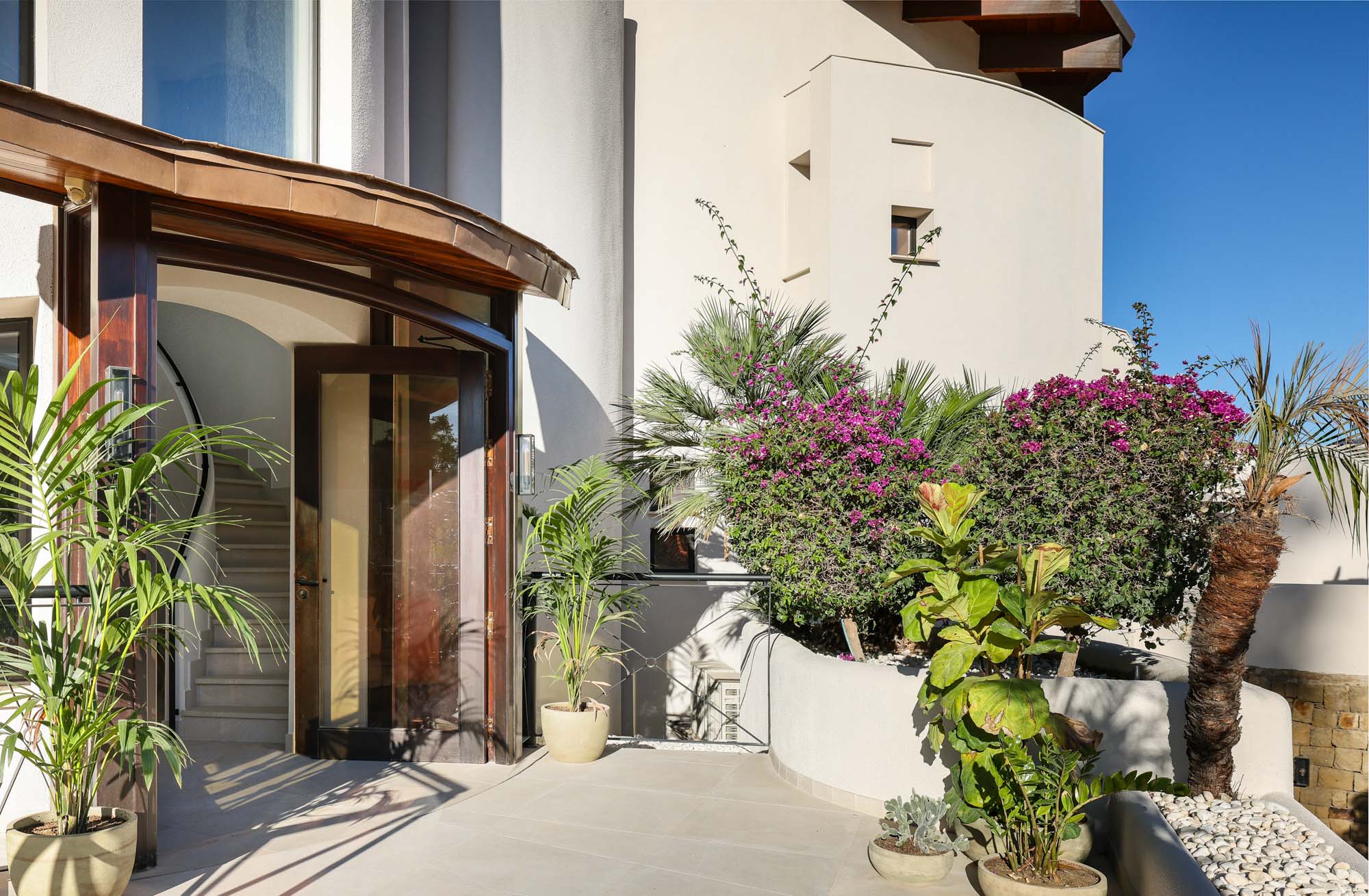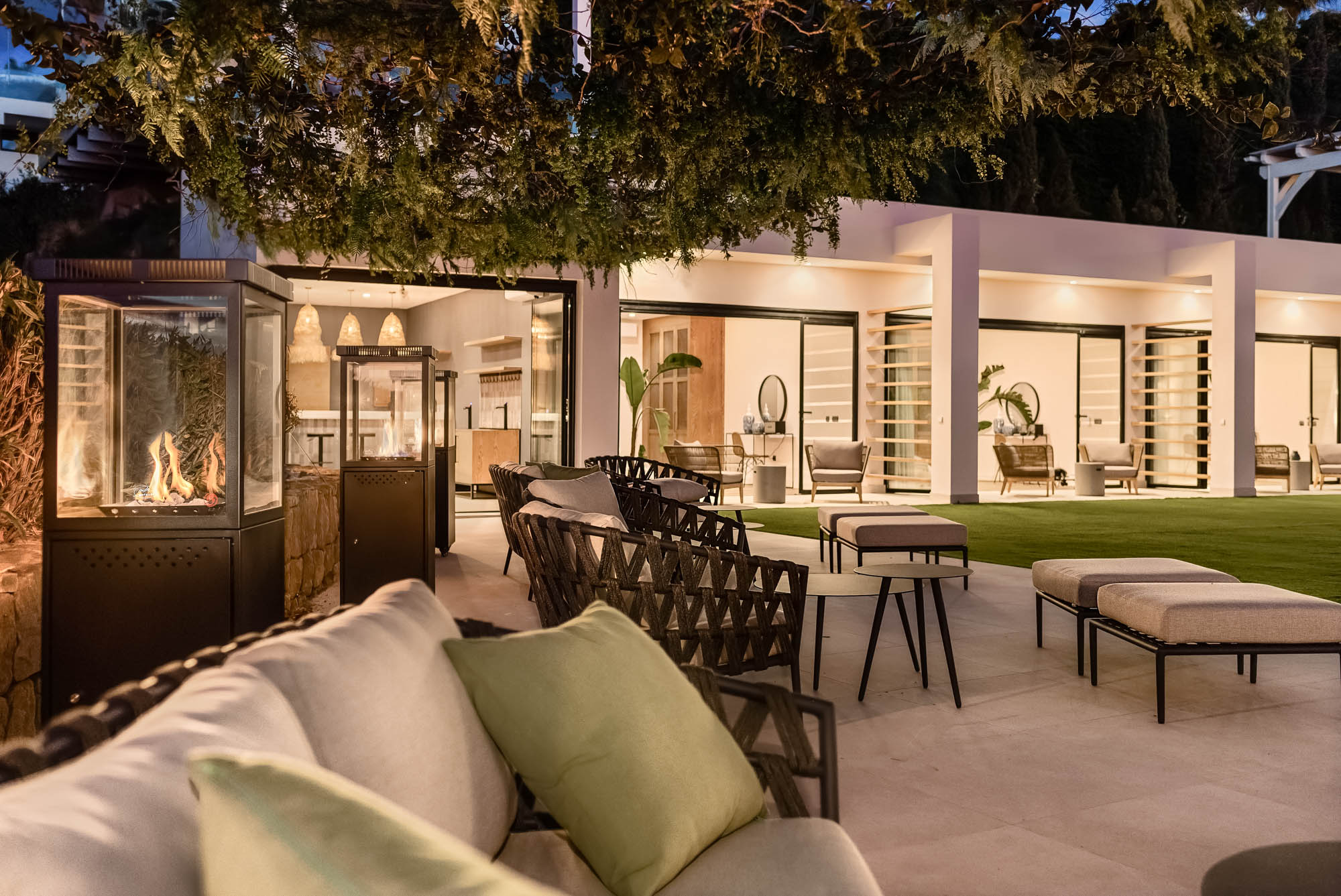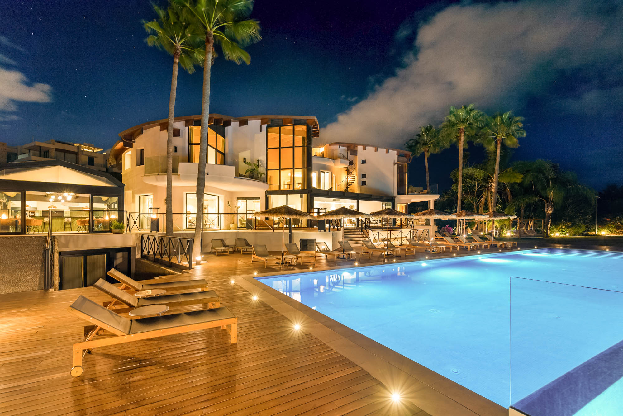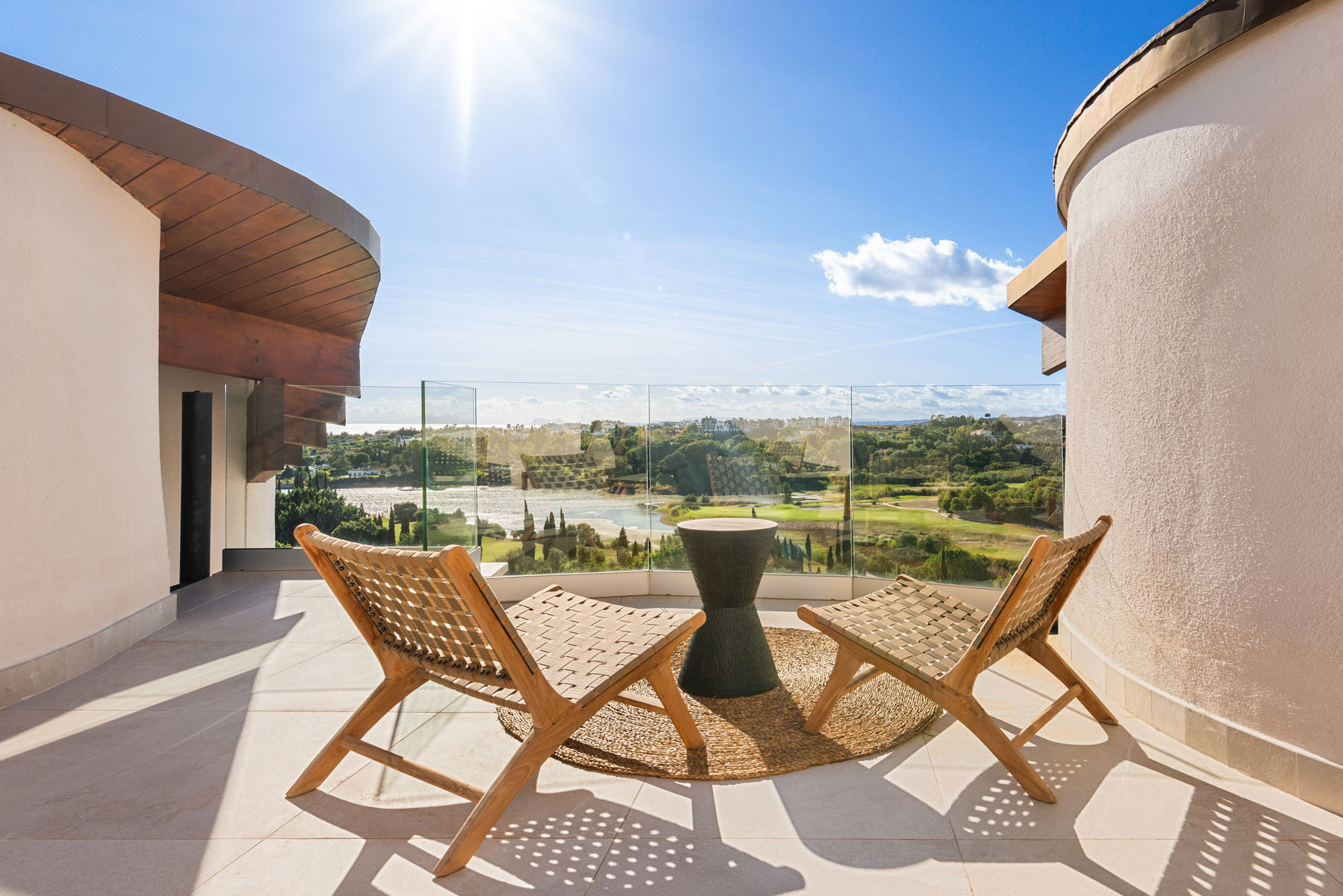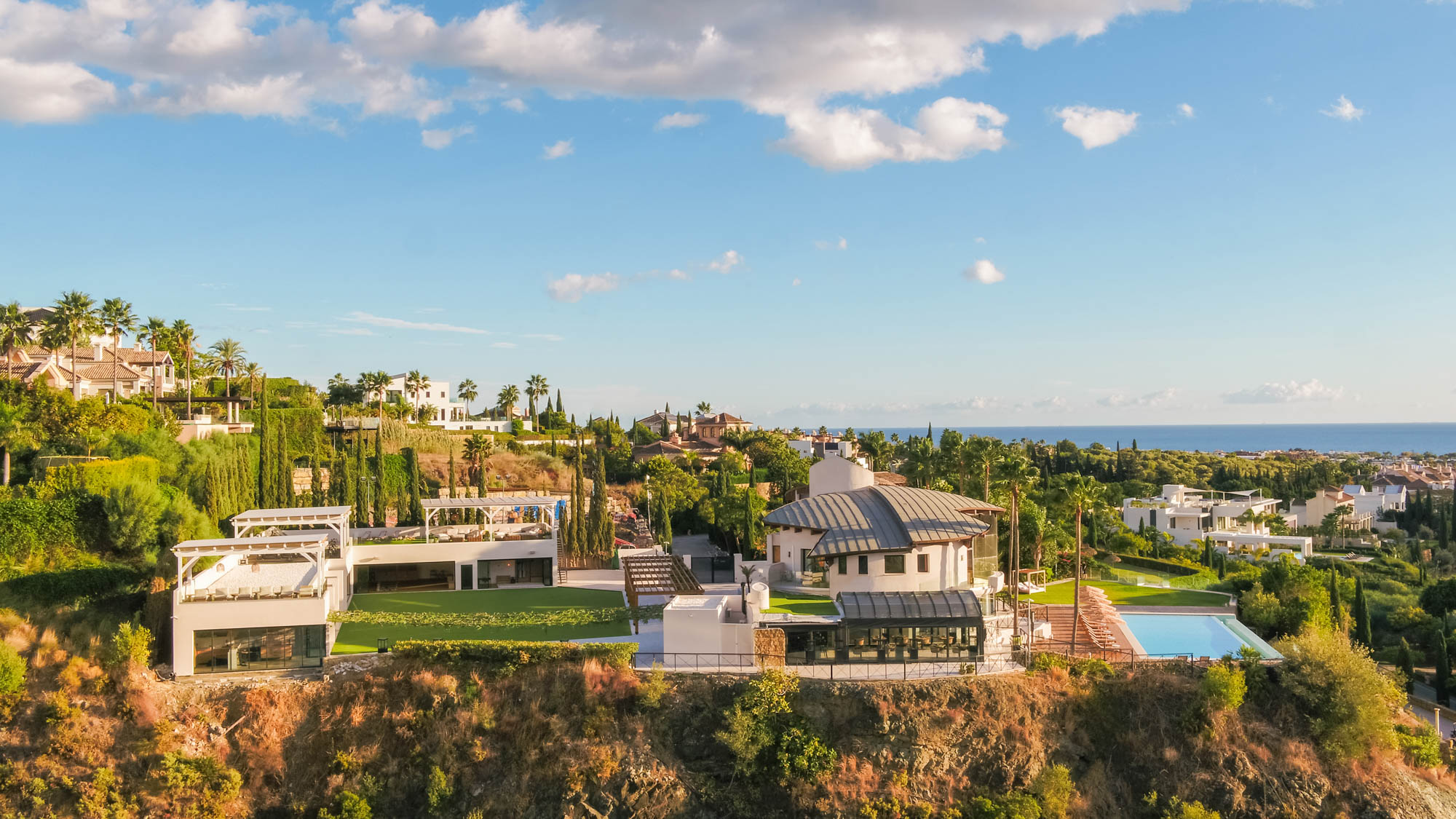 Framed by manicured gardens and towering palms, the villa’s position is discreet without feeling isolated. From its sun-drenched terraces and rooftop chillout zones, far-reaching views encompass verdant golf courses and the shimmering Med. In the distance across the straits of Gibraltar, the coastline of Morocco stands proud on a clear day.
