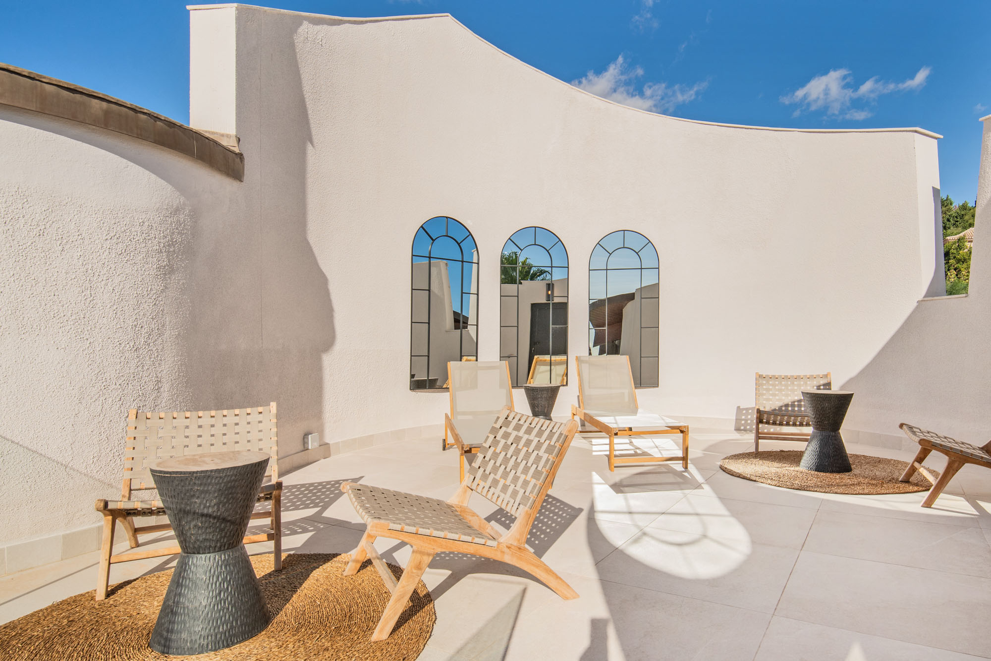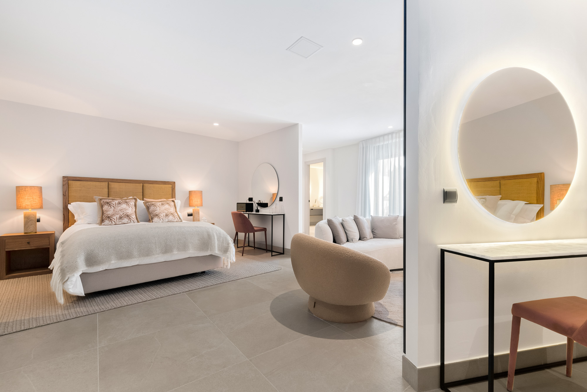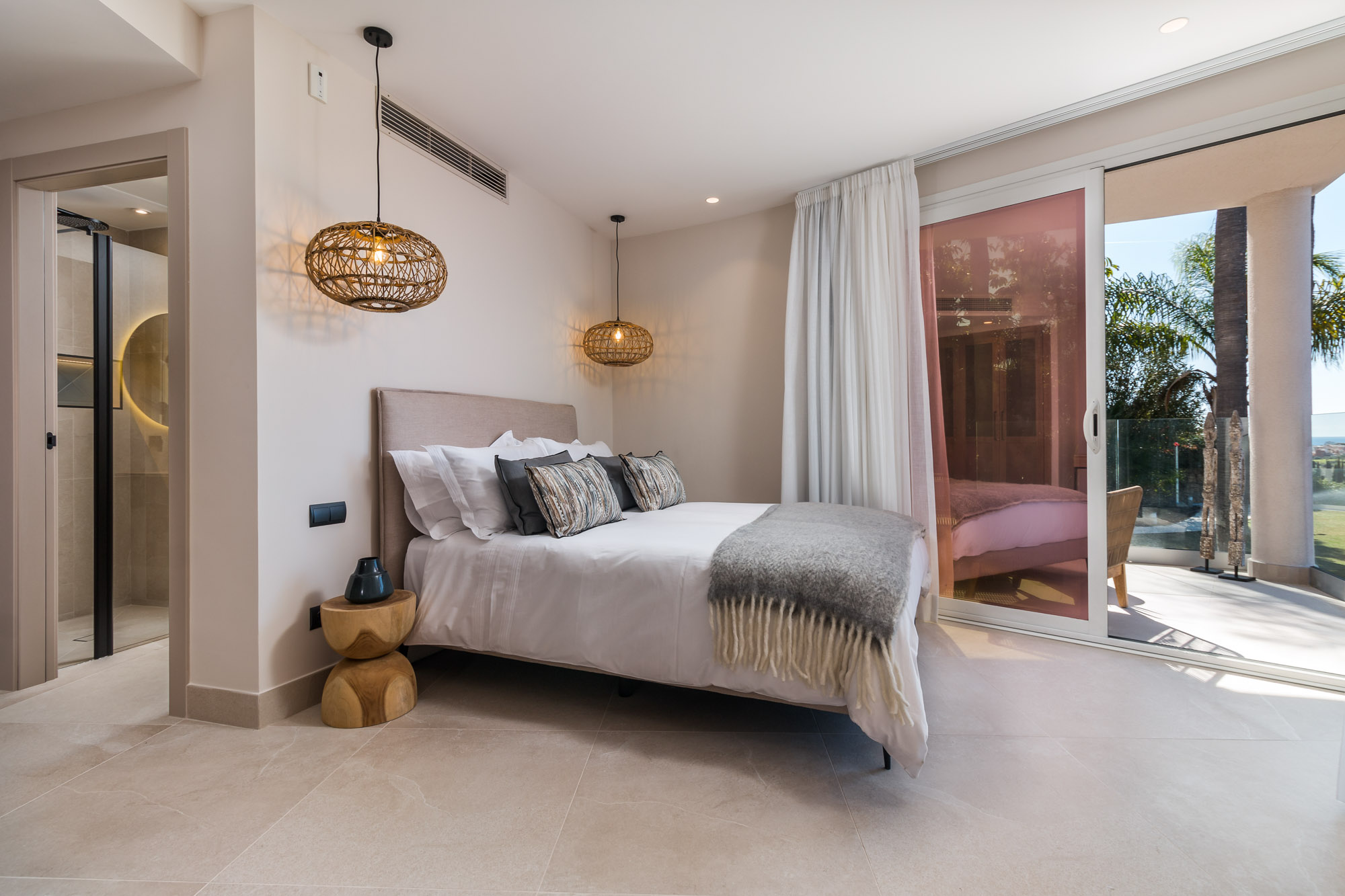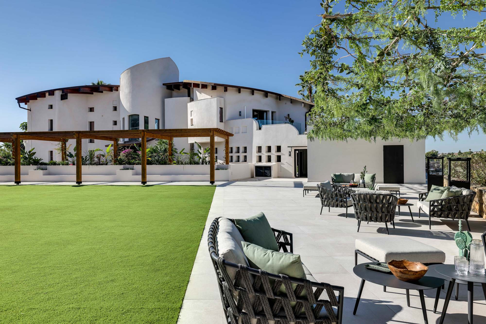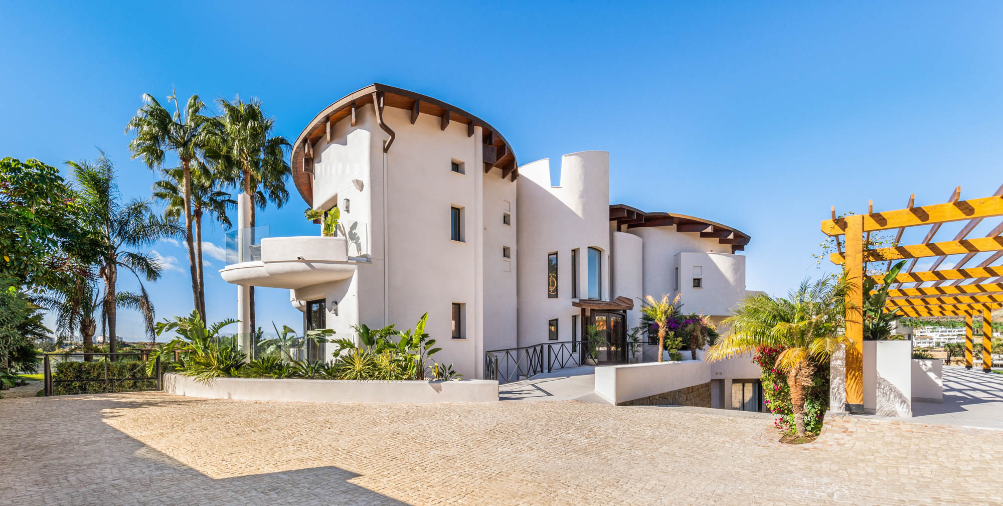 Framed by manicured gardens and towering palms, the villa’s position is discreet without feeling isolated. From its sun-drenched terraces and rooftop chillout zones, far-reaching views encompass verdant golf courses and the shimmering Med. In the distance across the straits of Gibraltar, the coastline of Morocco stands proud on a clear day.