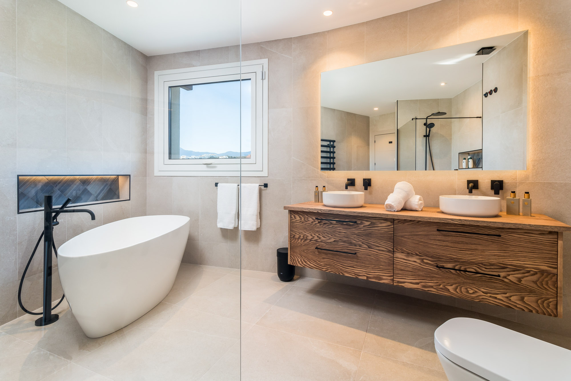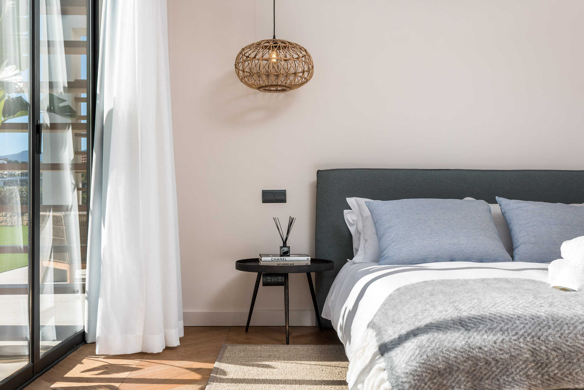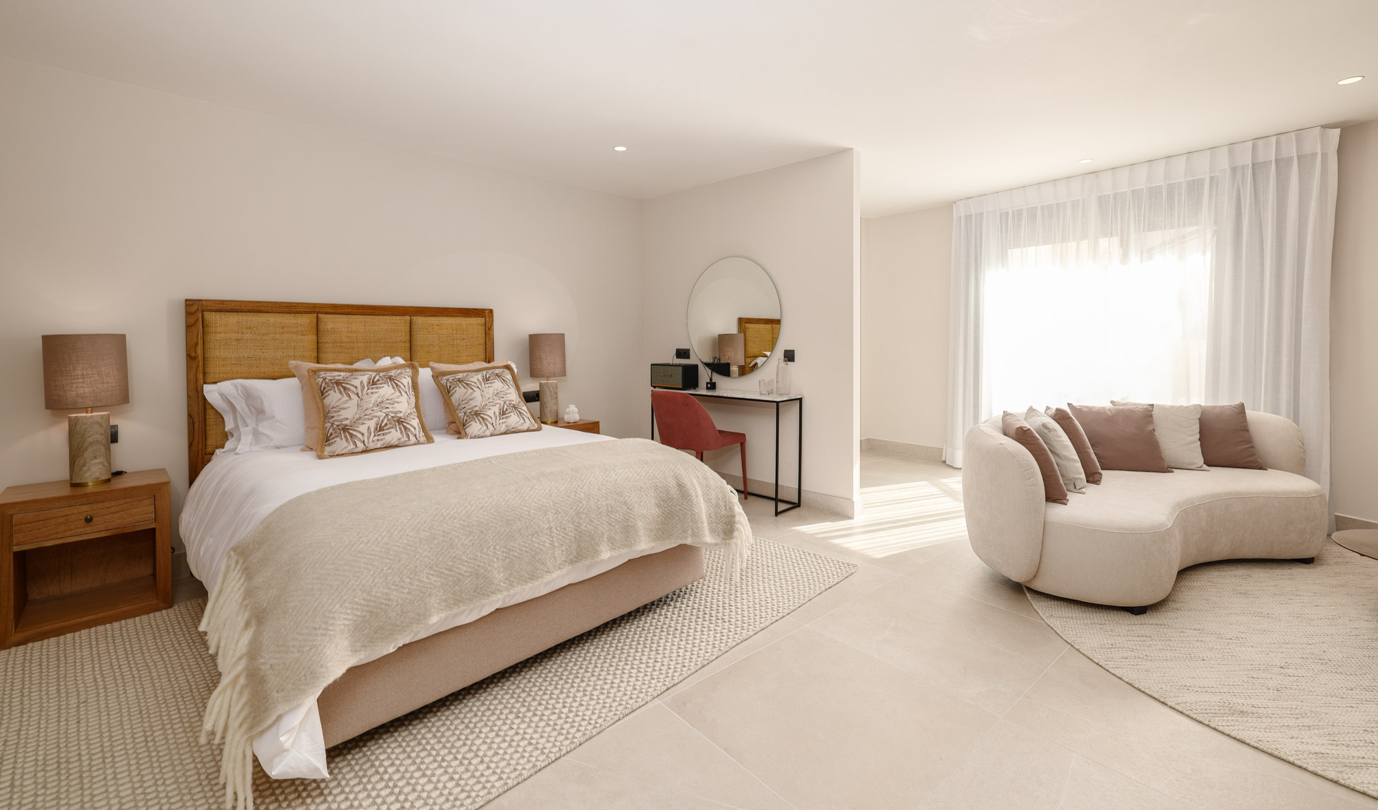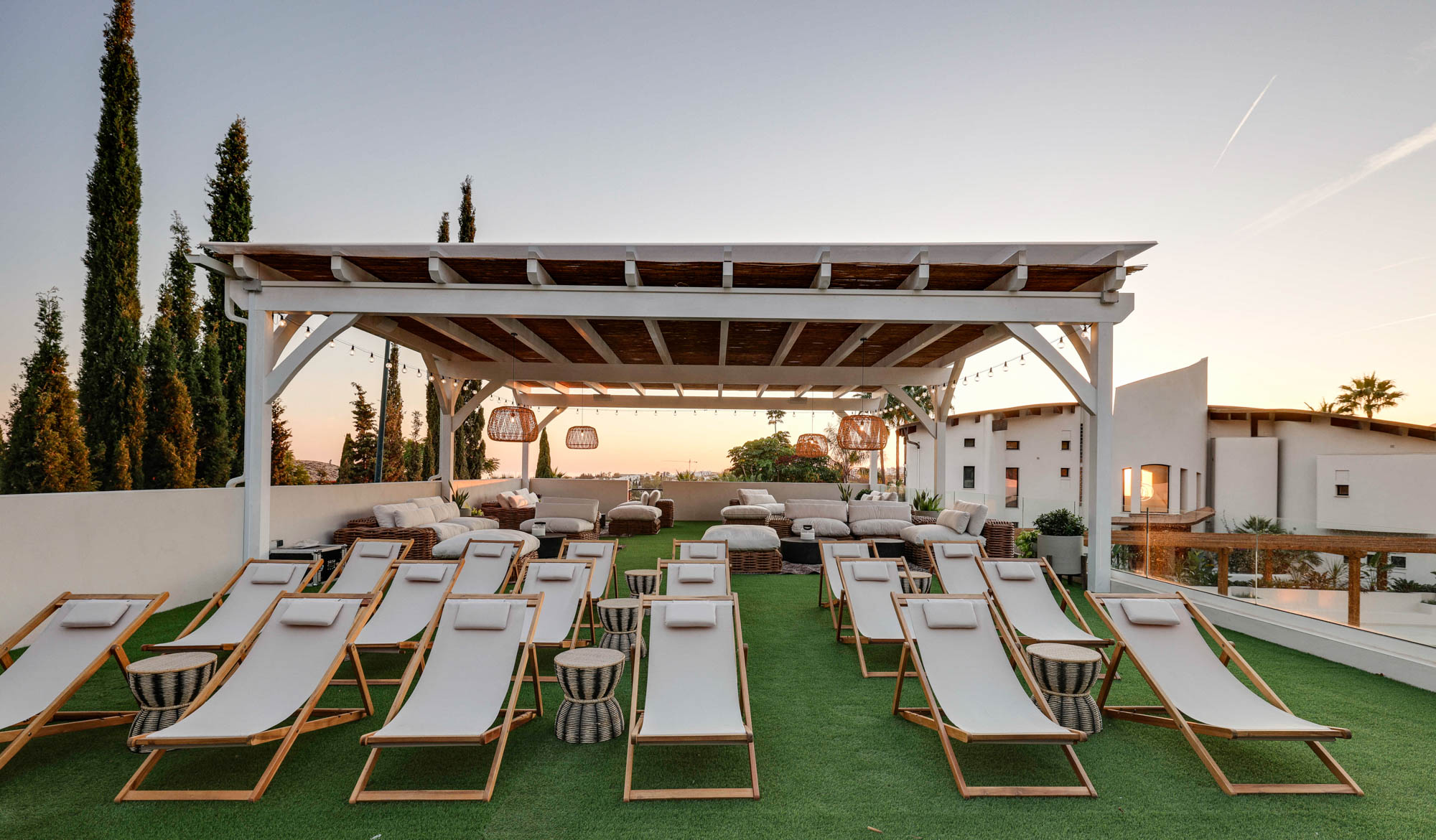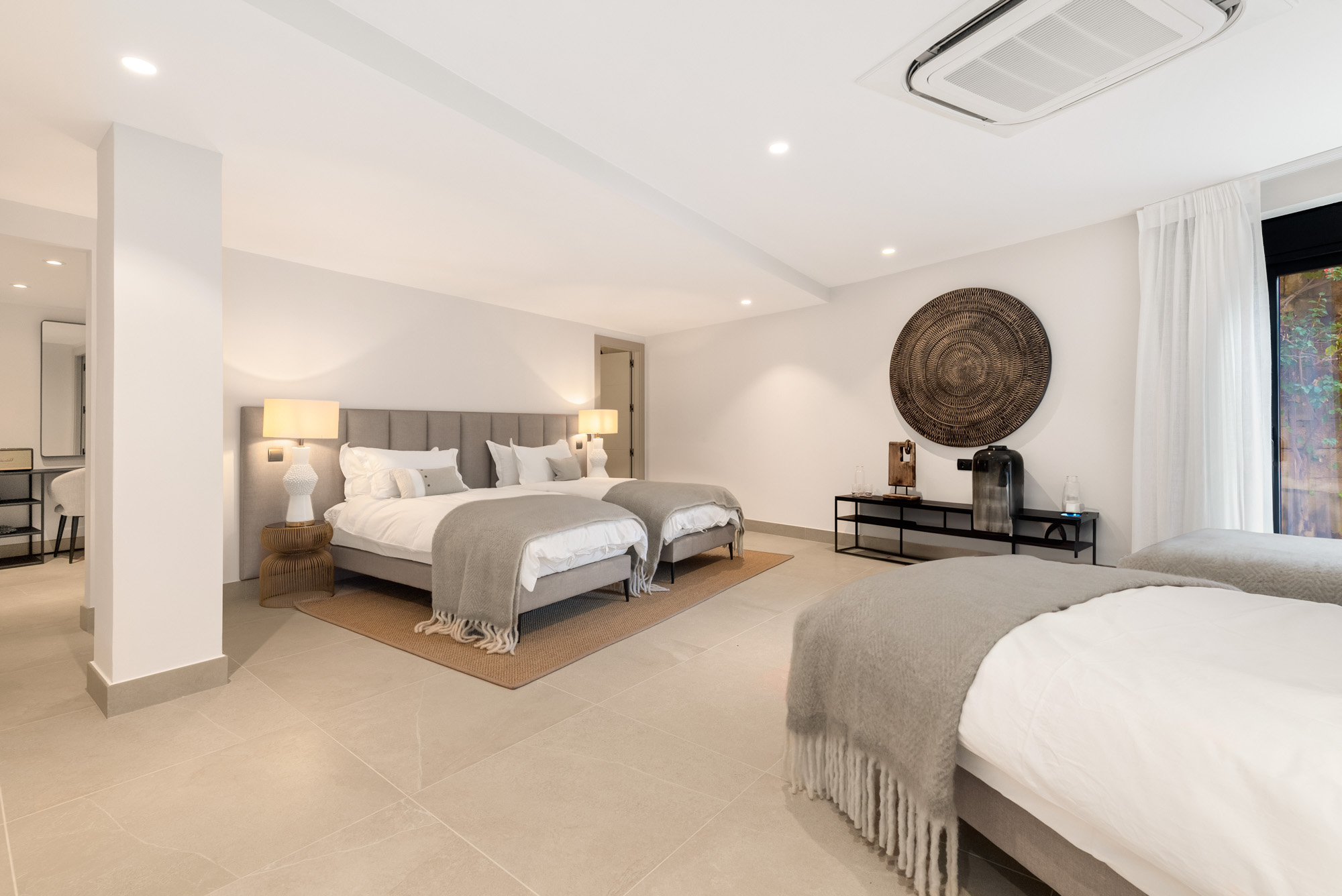 Framed by manicured gardens and towering palms, the villa’s position is discreet without feeling isolated. From its sun-drenched terraces and rooftop chillout zones, far-reaching views encompass verdant golf courses and the shimmering Med. In the distance across the straits of Gibraltar, the coastline of Morocco stands proud on a clear day.