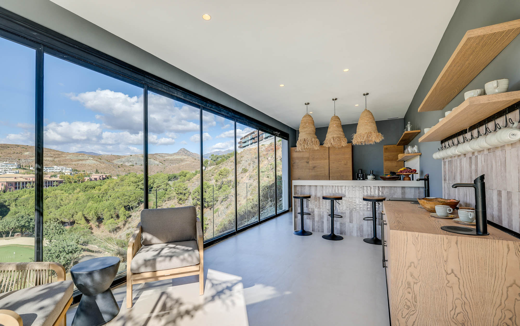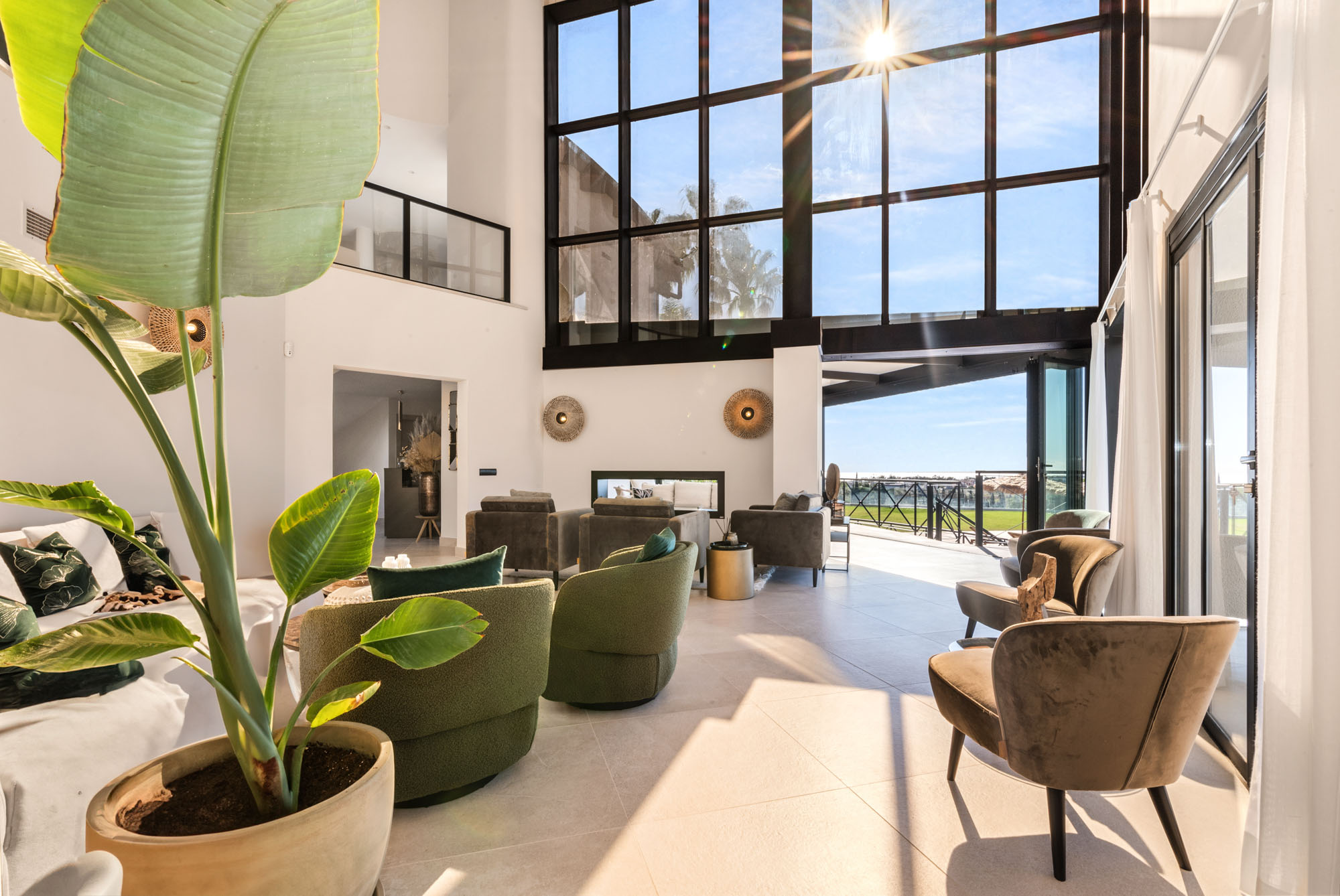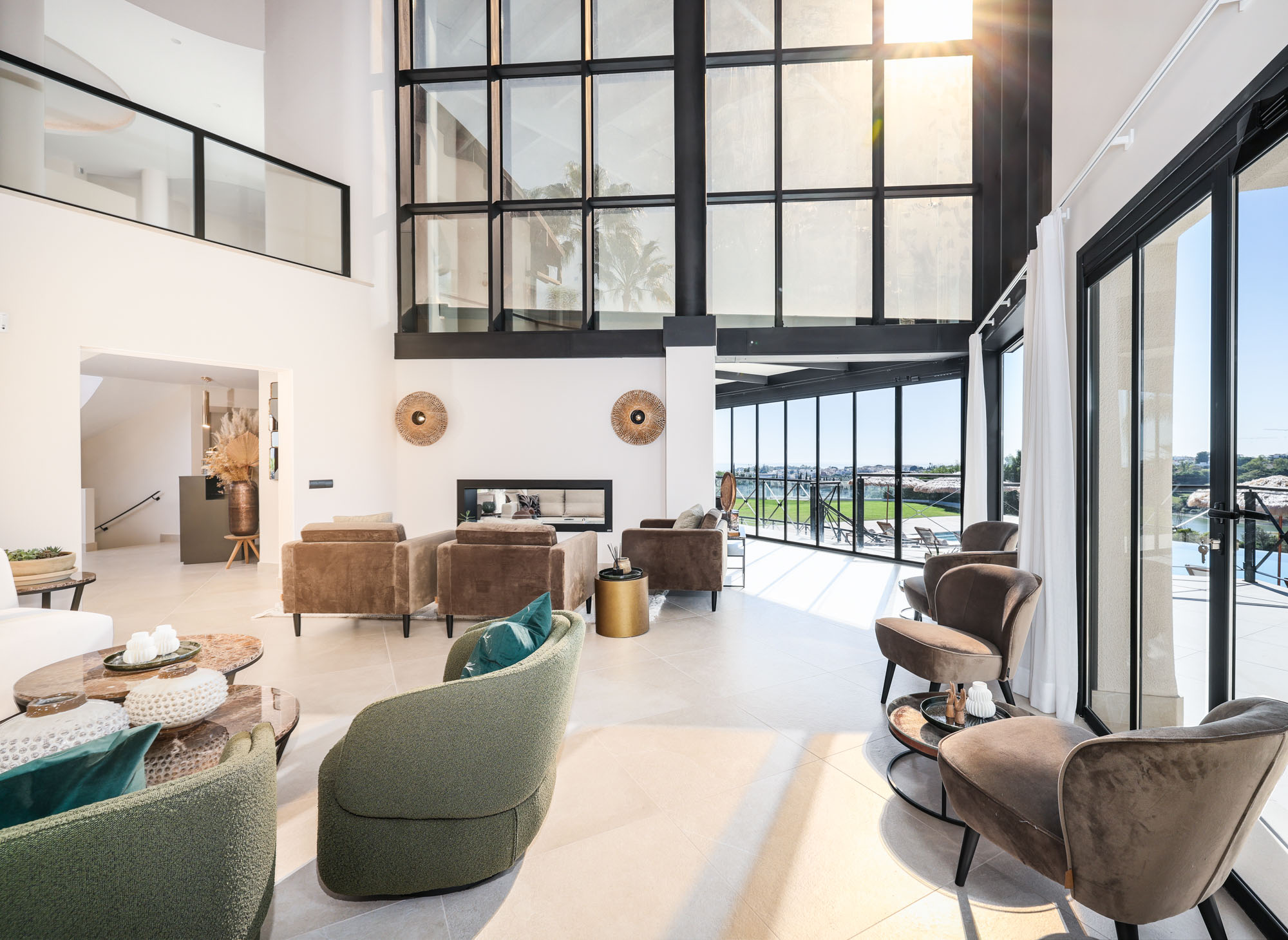 The main house centres around a vast, double height living room, divided into three relaxed seating zones. Floor-to-ceiling windows frame uninterrupted views across the pool and golf course, drawing in natural light throughout the day.
