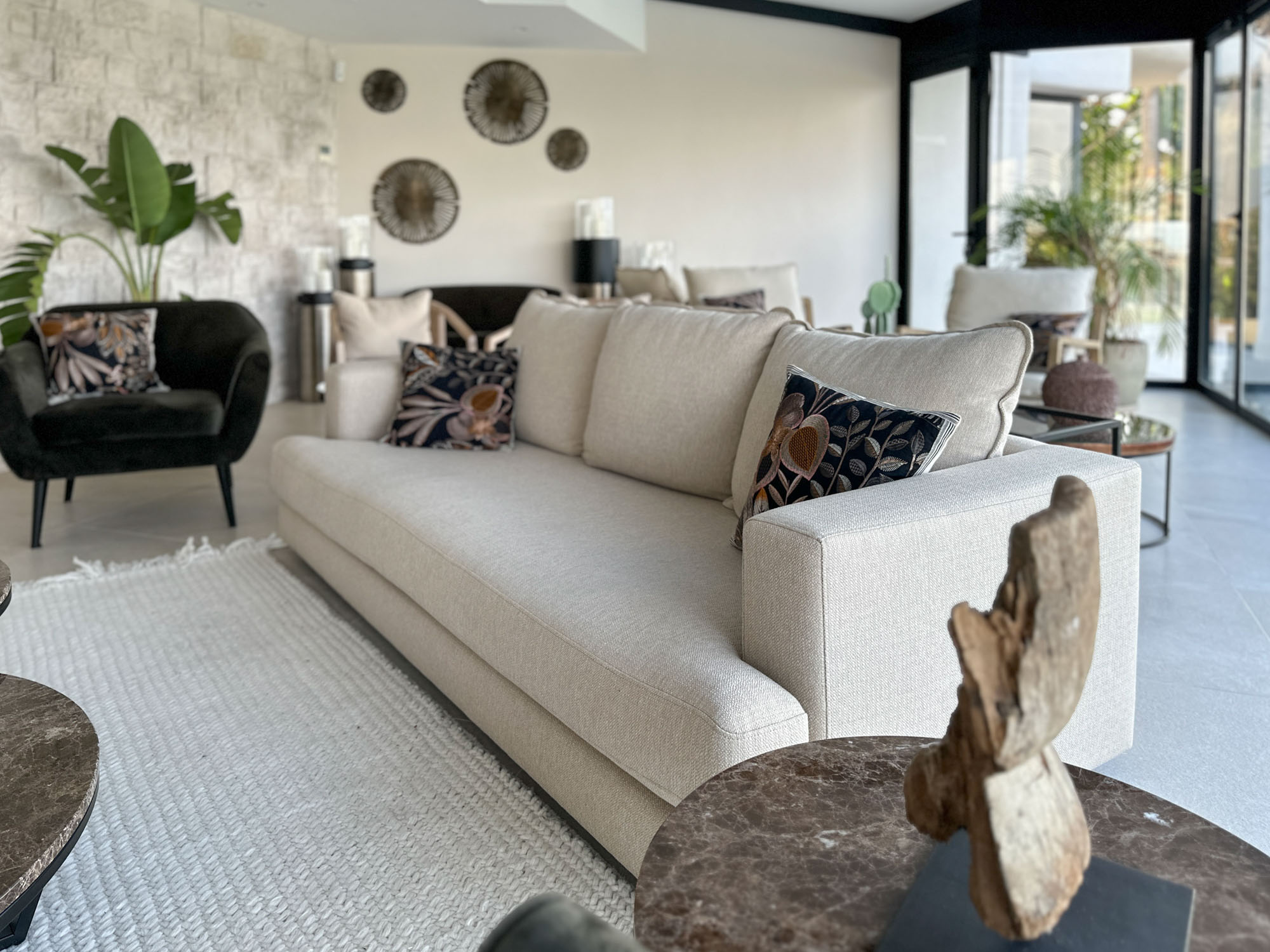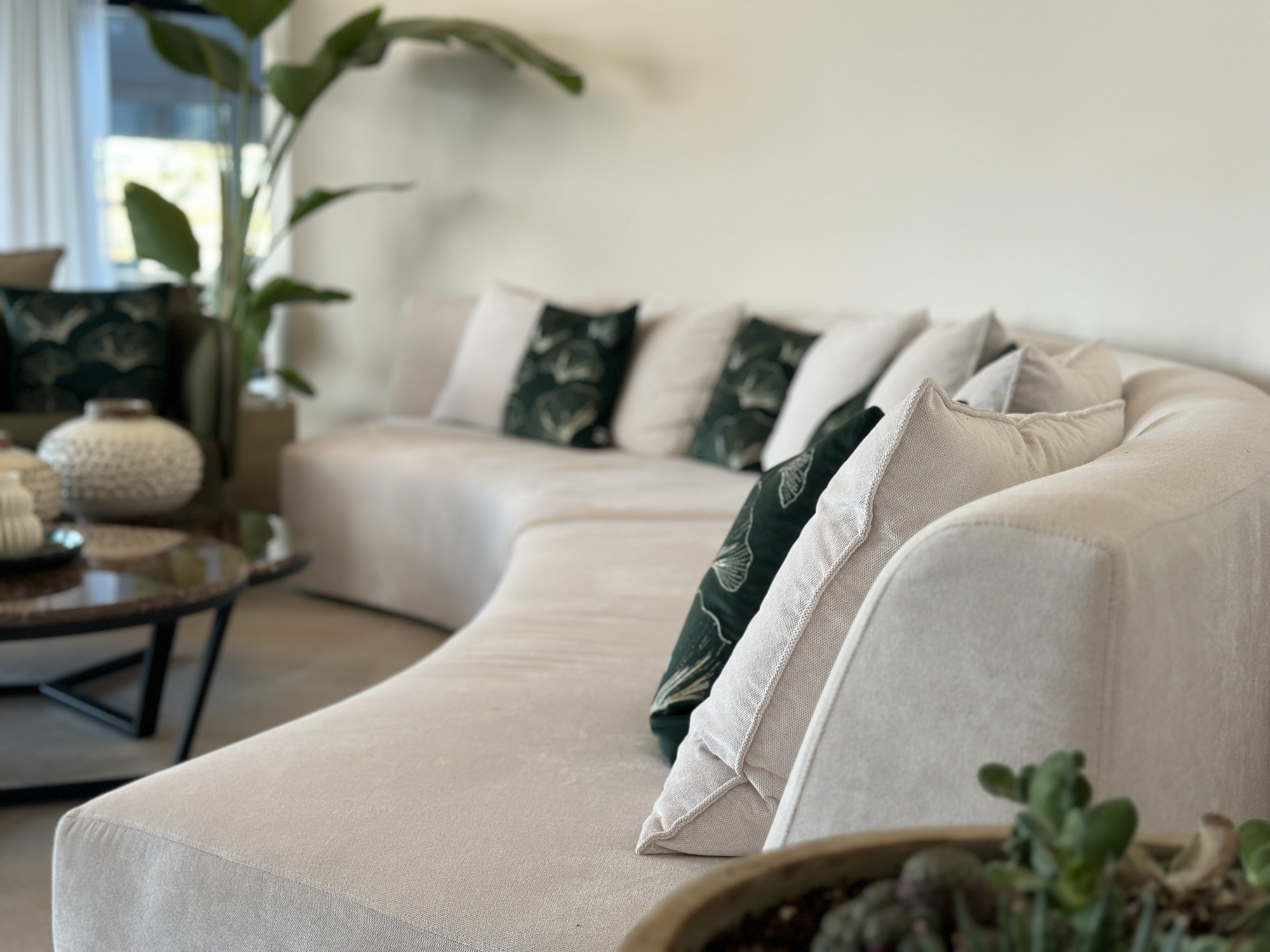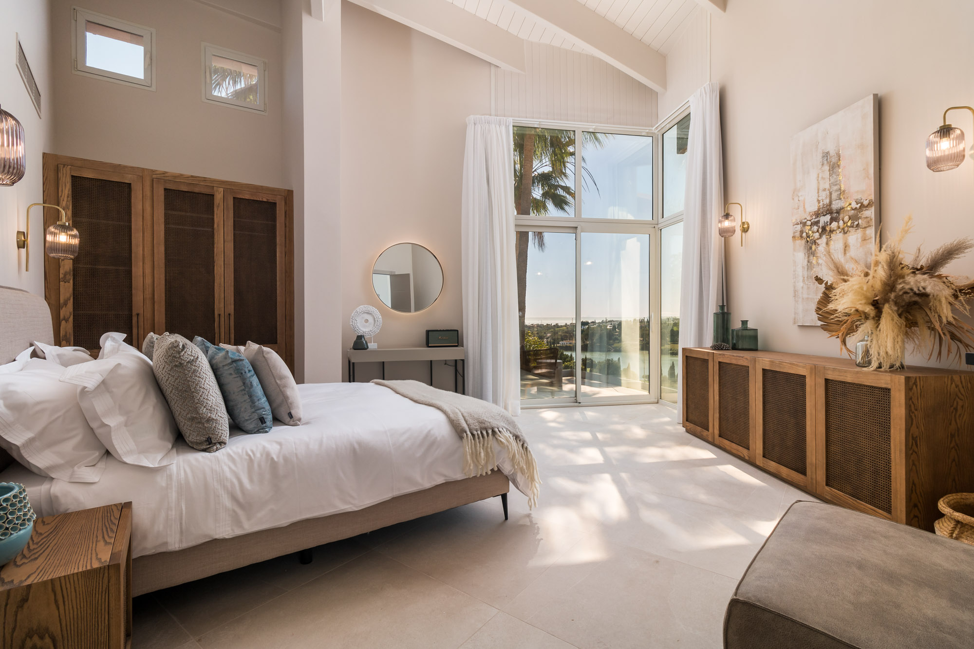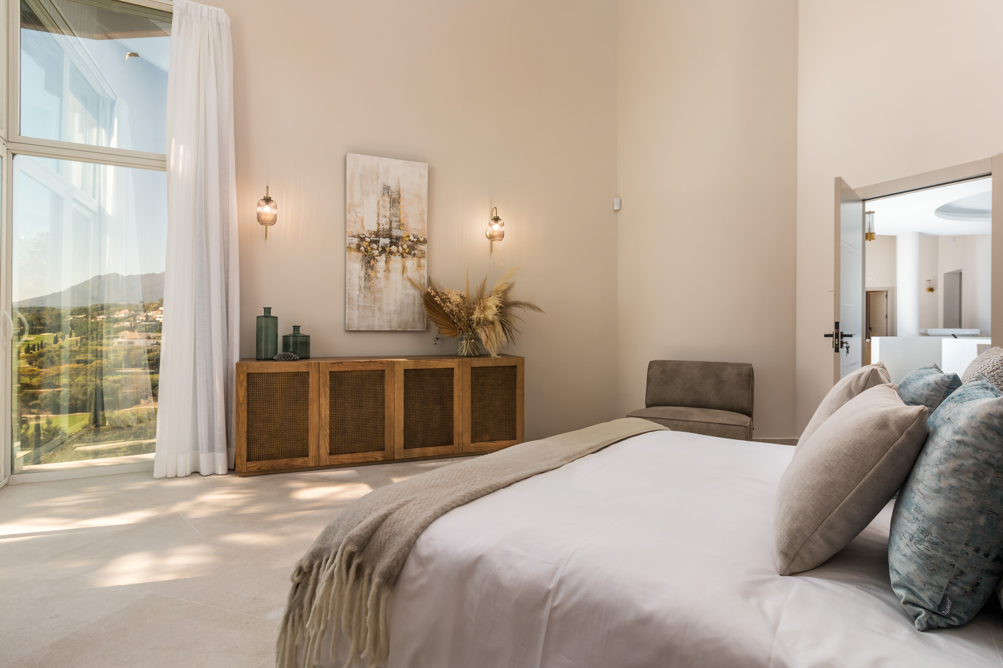 The main house centres around a vast, double height living room, divided into three relaxed seating zones. Floor-to-ceiling windows frame uninterrupted views across the pool and golf course, drawing in natural light throughout the day.