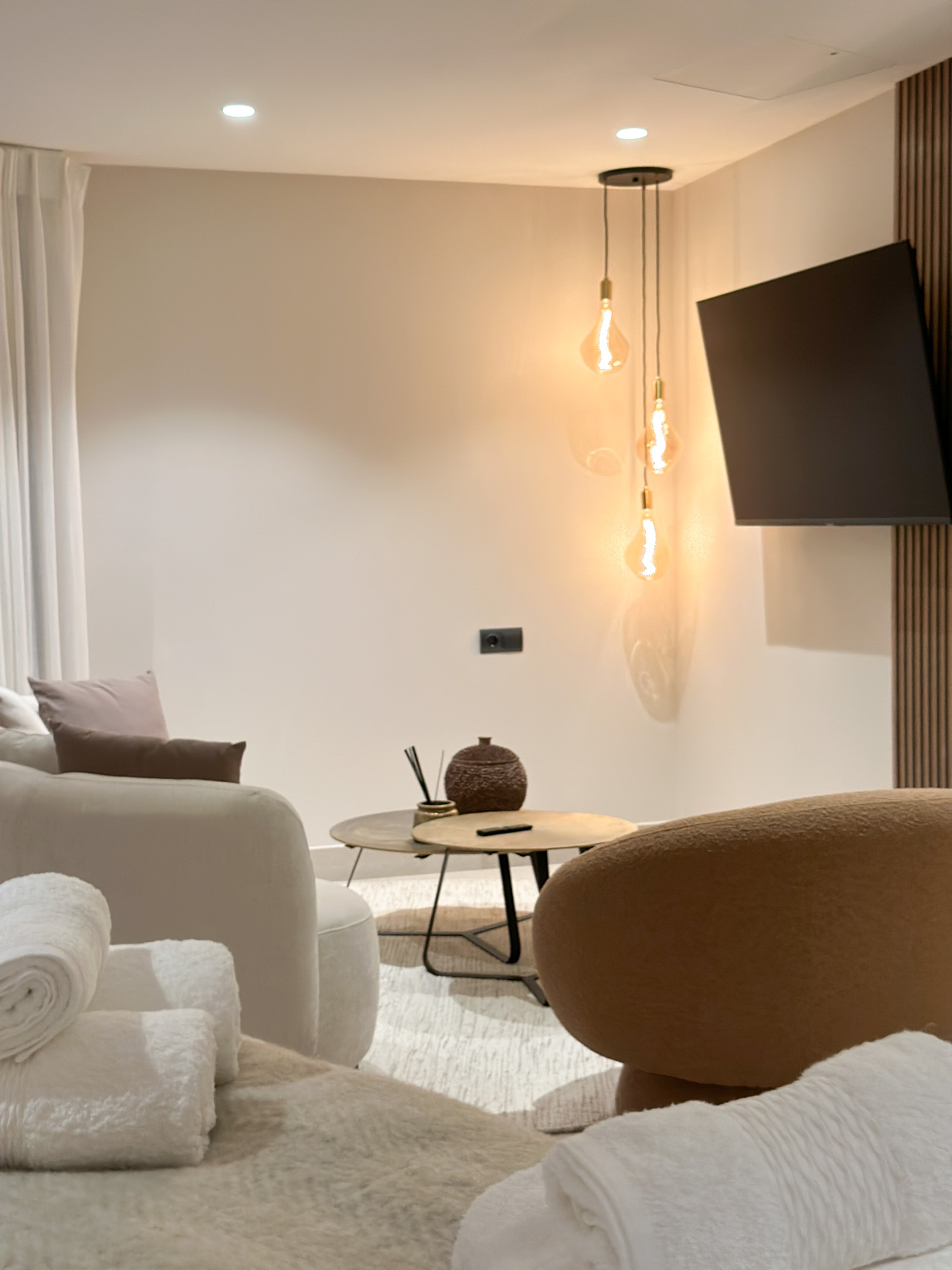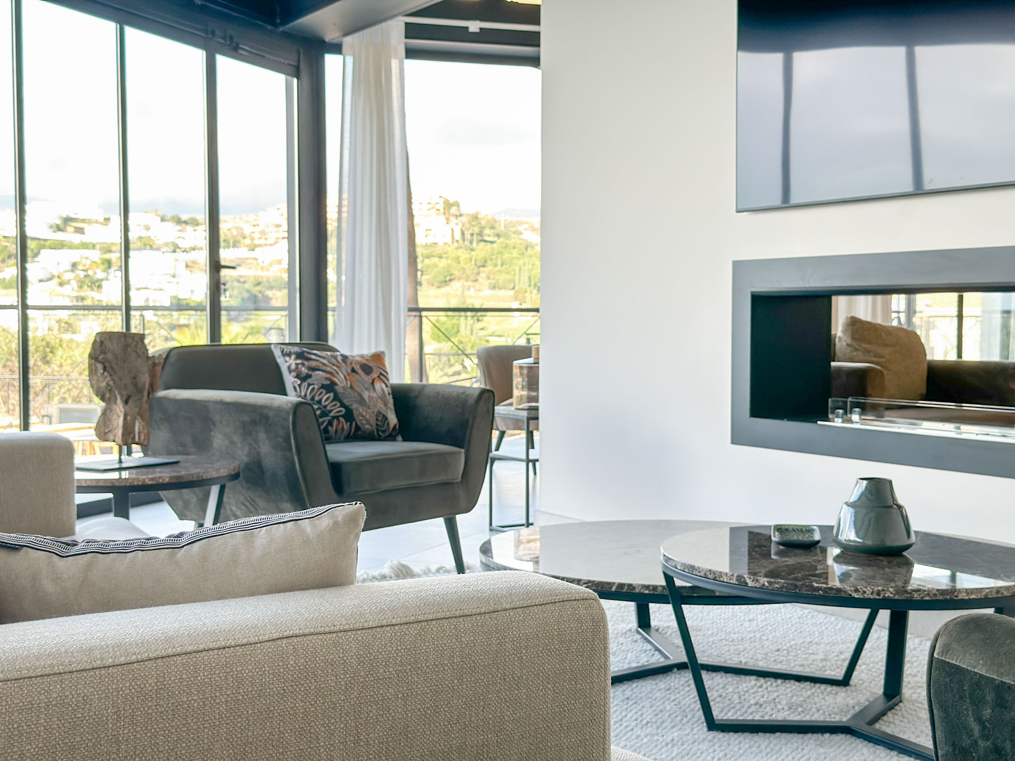 Elsewhere, a large grey sofa faces a discreet wall-mounted TV and modern fireplace, creating a cosy, media-ready corner. In another zone, a pair of armchairs are positioned to take full advantage of the view, perfect for quiet reading or evening drinks.