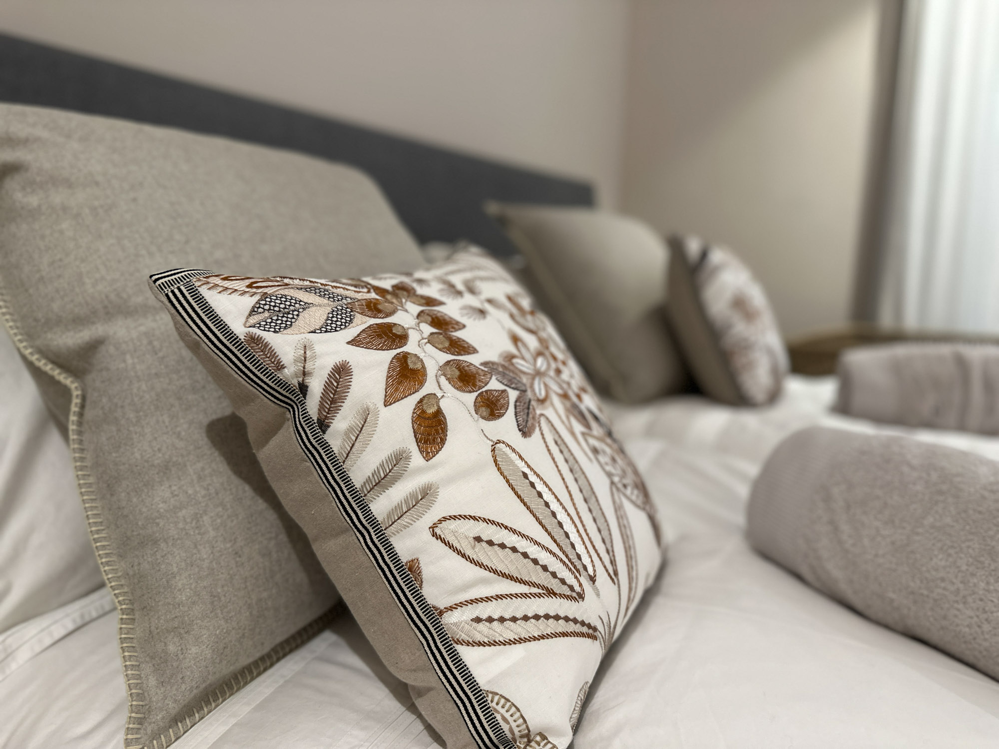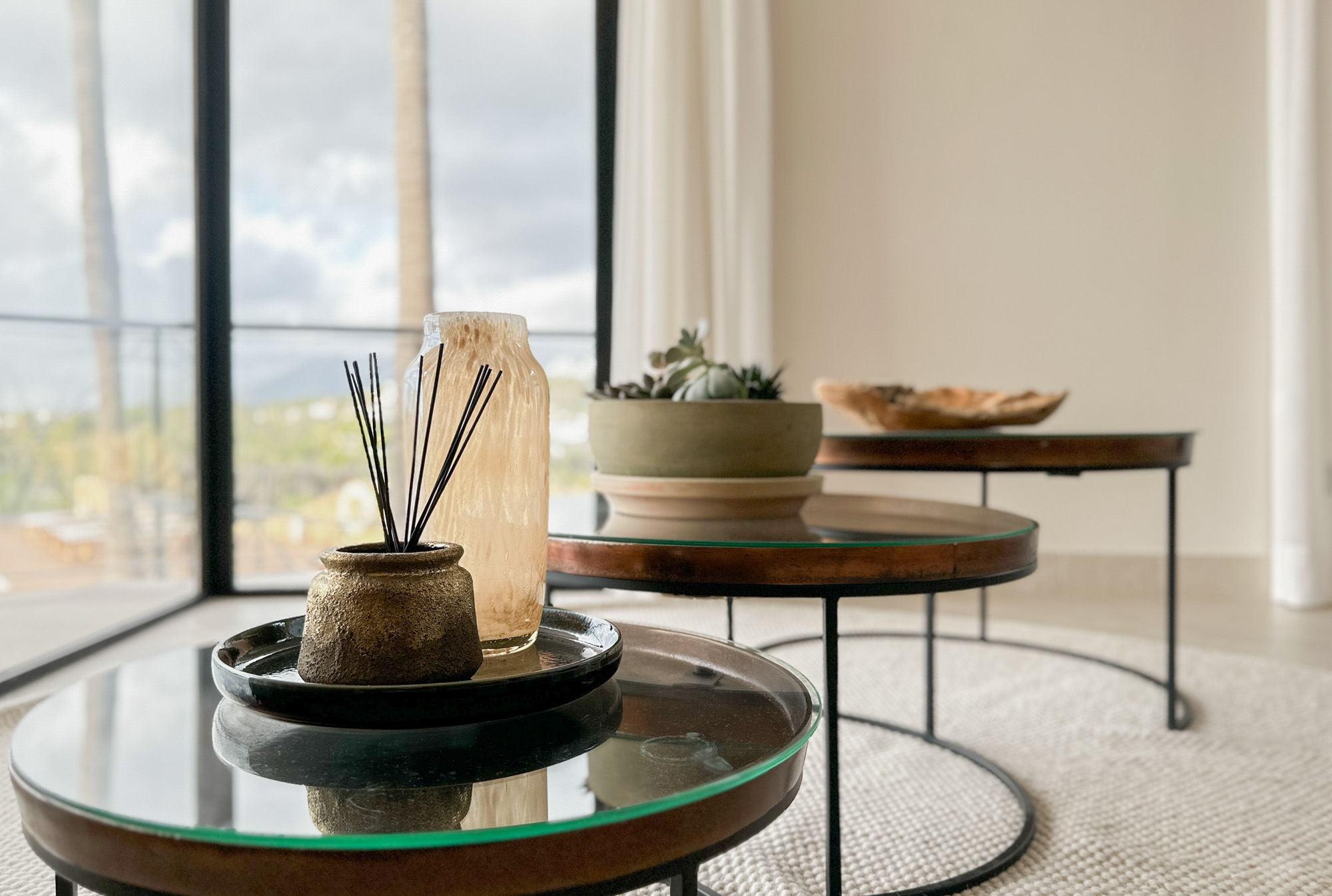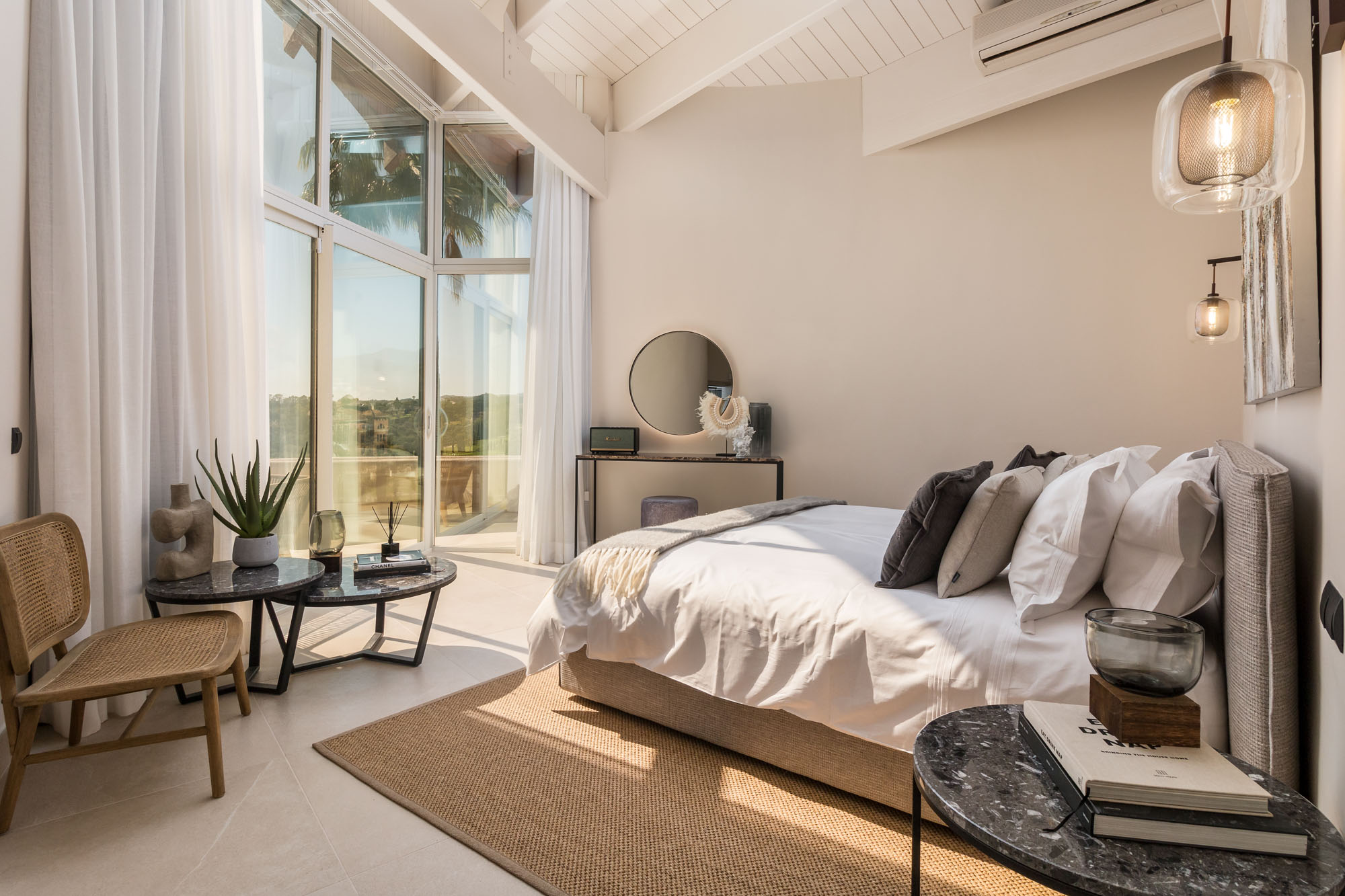 At every turn, floor-to-ceiling glass walls frame magnificent views, while the designer has introduced a thoughtful blend of textures and soothing tones to anchor the space in a palette of calm.