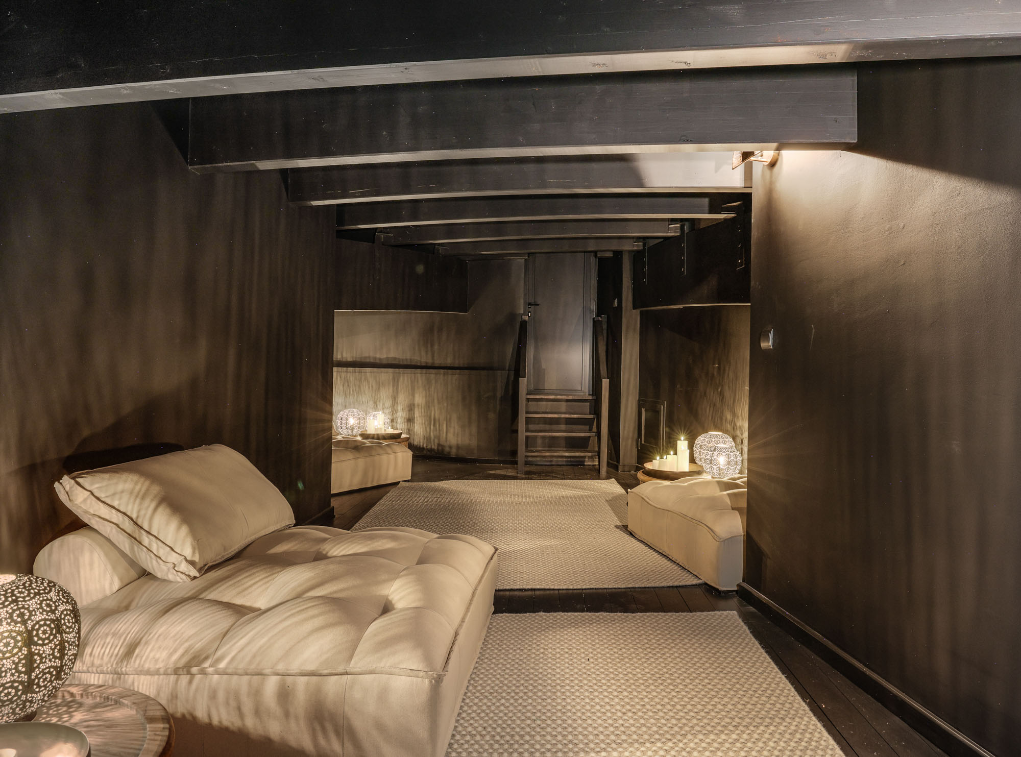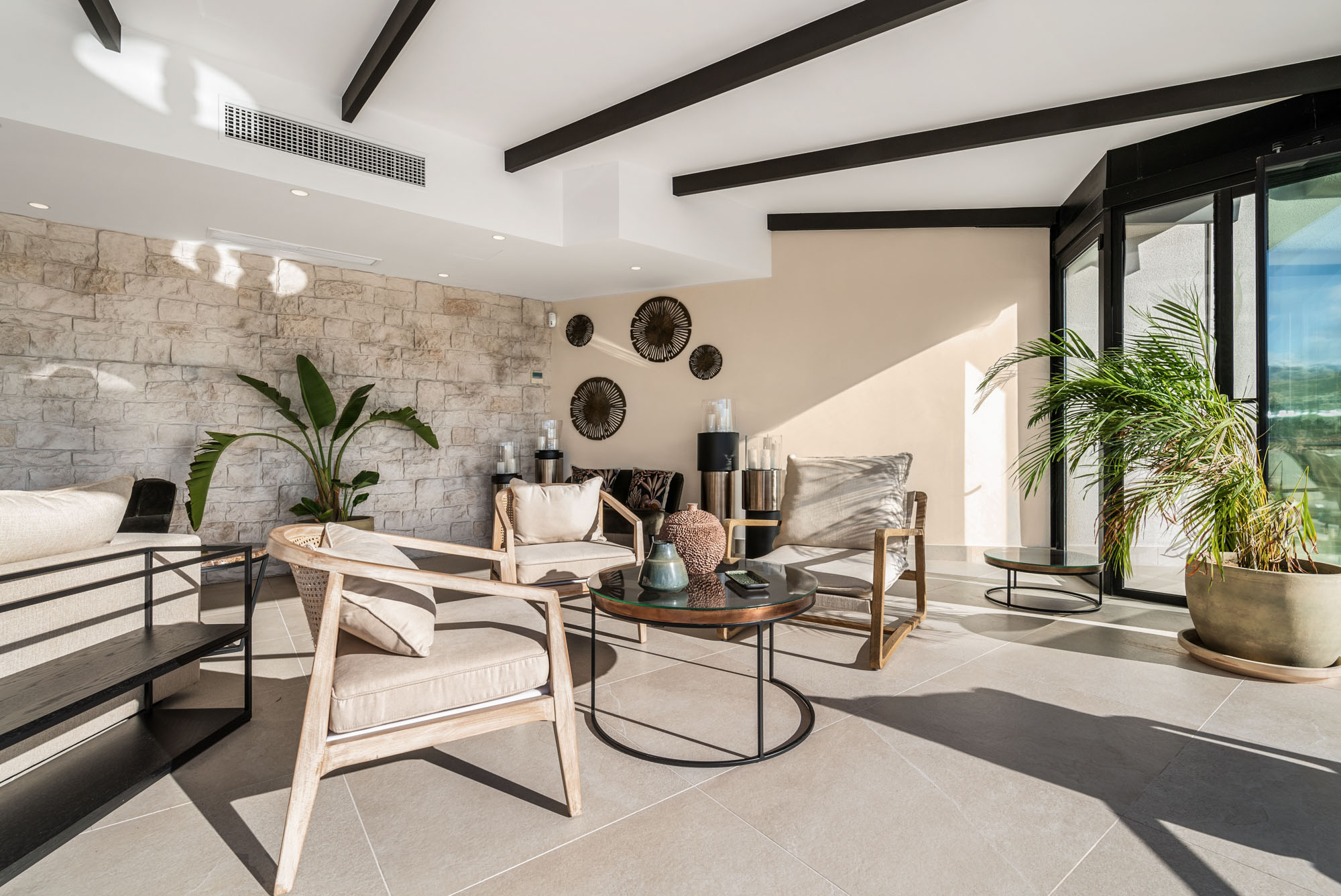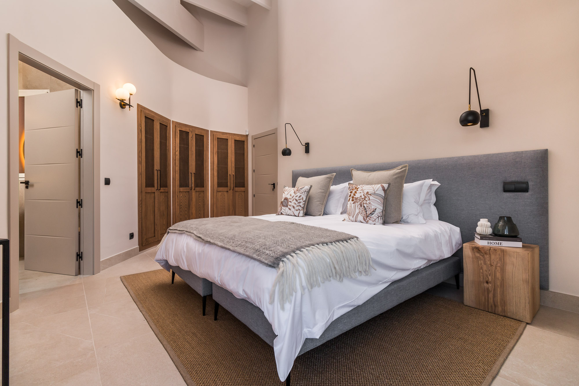 Neutral tones and raw textures -linen, velvet, stone, and wood- set a calm, contemporary mood. Overhead, exposed beams add warmth while the gallery-style mezzanine above offers a striking architectural detail.