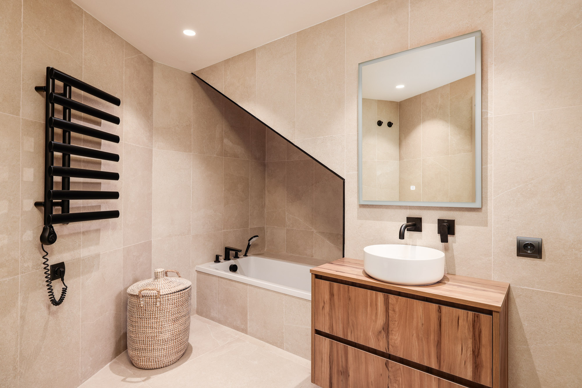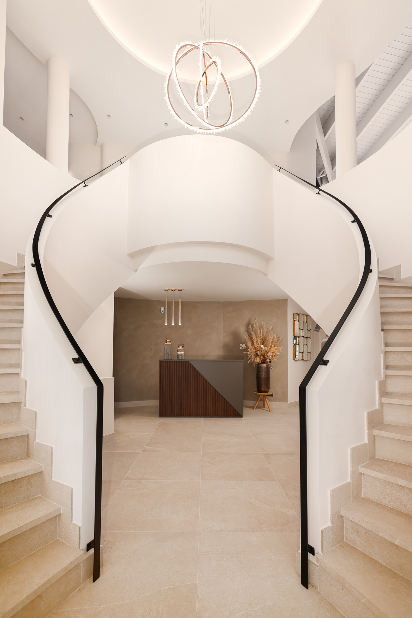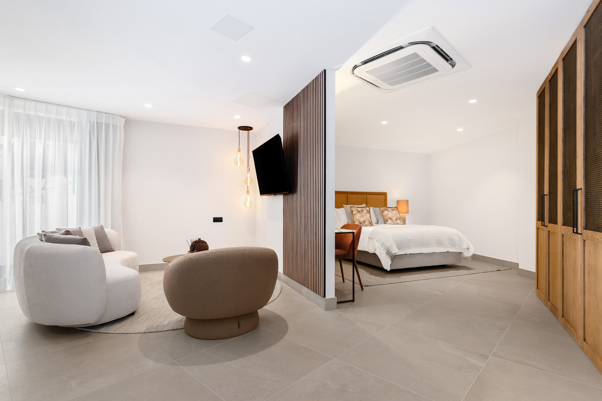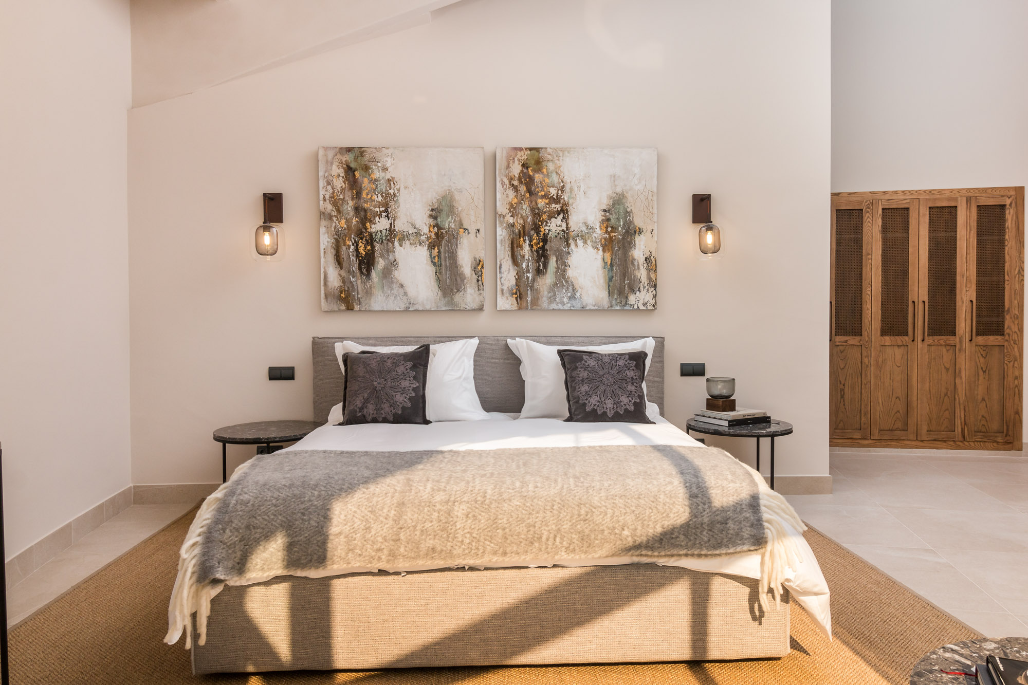 Neutral tones and raw textures -linen, velvet, stone, and wood- set a calm, contemporary mood. Overhead, exposed beams add warmth while the gallery-style mezzanine above offers a striking architectural detail.