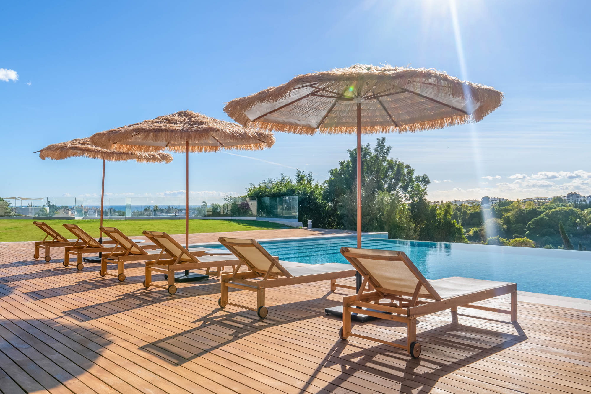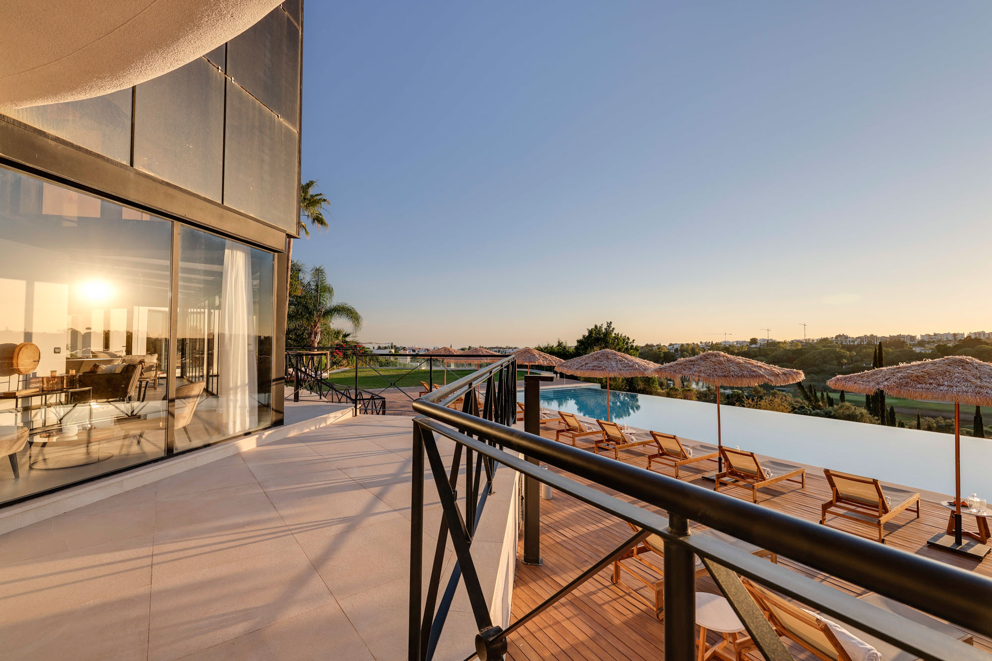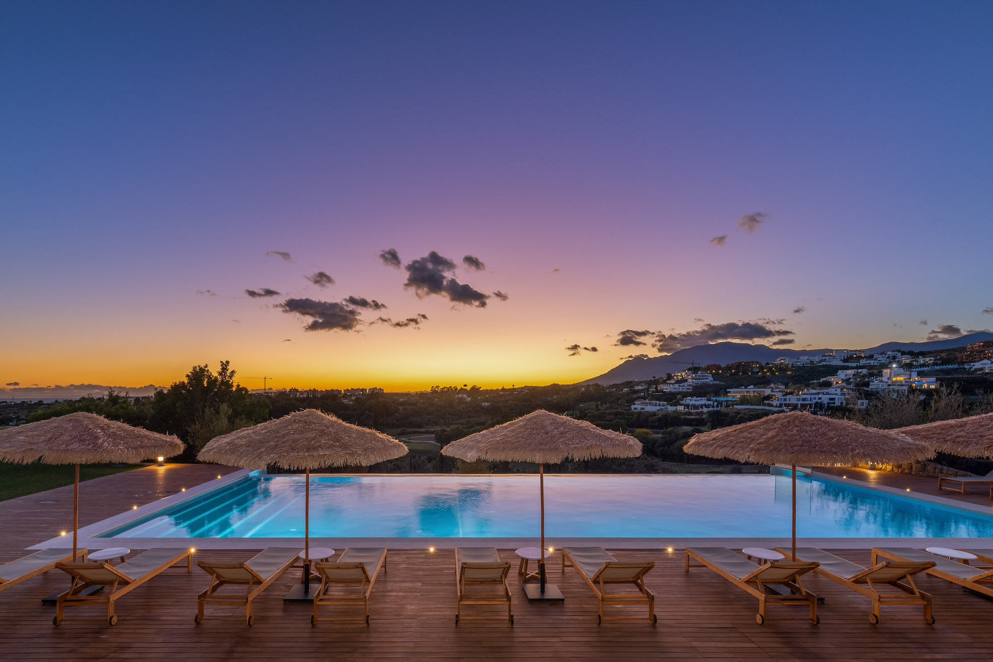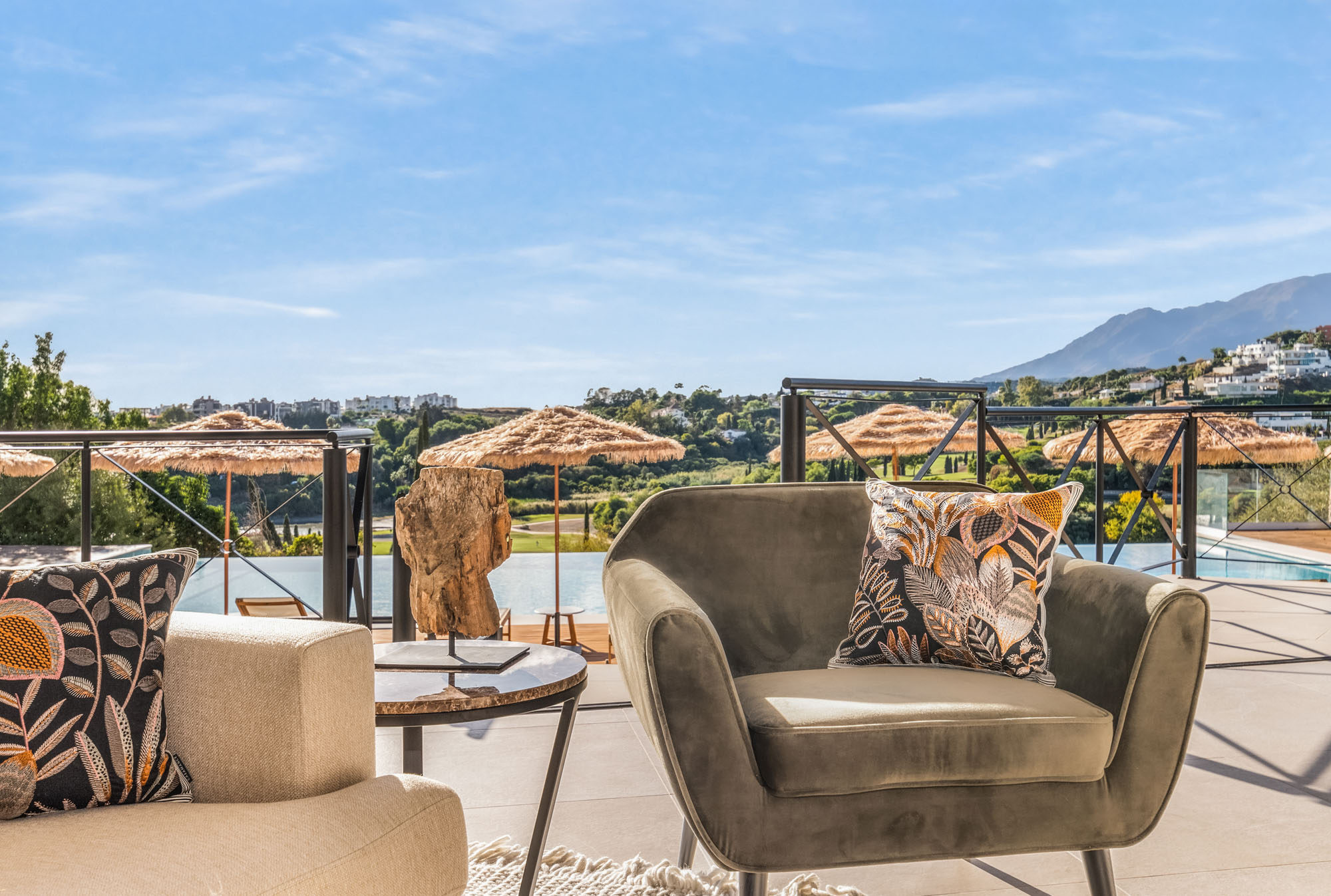 Villa Eirena’s outdoor areas unfold like an exclusive private resort: a magnificent infinity-edge pool set above the golf course, numerous shaded seating areas scattered across the gardens and a sprawling a rooftop terrace positioned for nightly sunsets over Gibraltar.