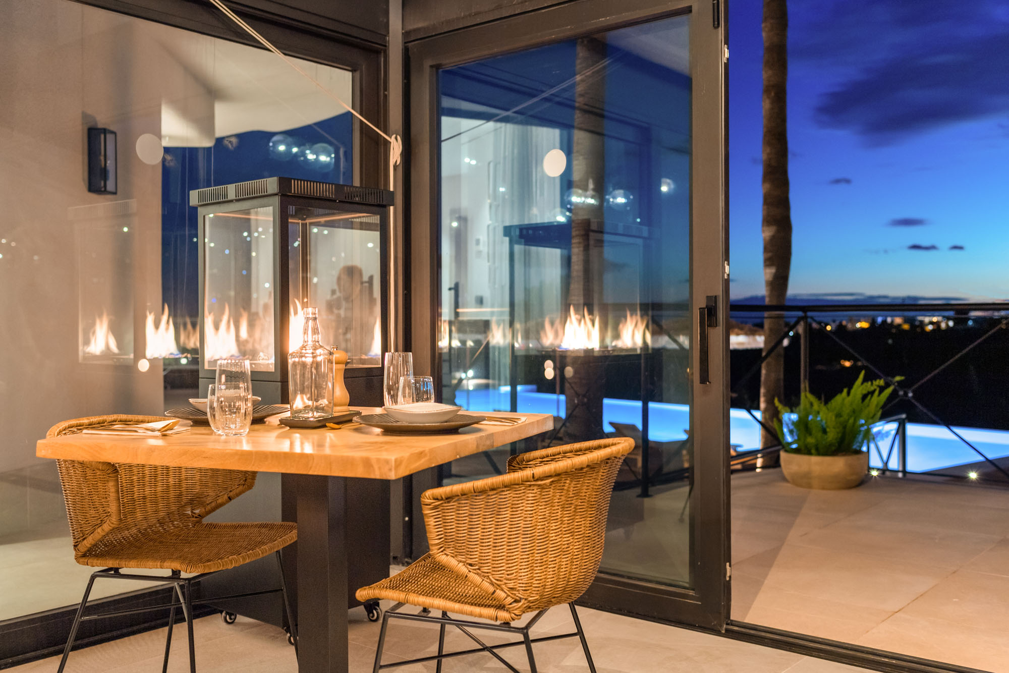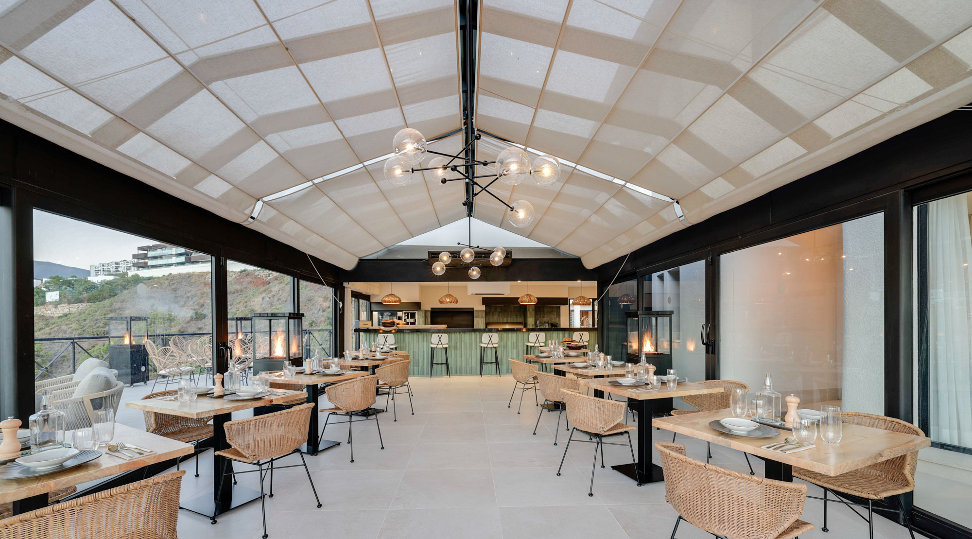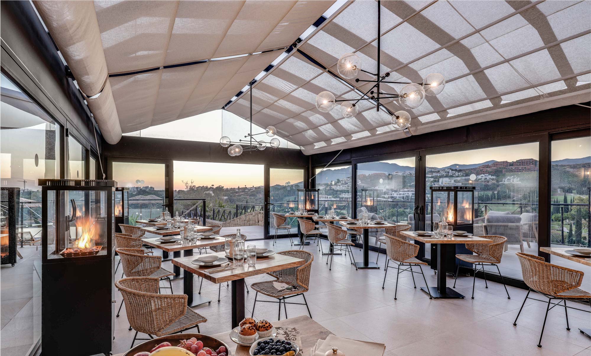 Dining takes place in the light-filled indoor dining area, arranged with flexible two-seater tables that can be combined to create one large table for up to 24 guests. For a more relaxed setting, meals can also be served outside by the pool, with uninterrupted golf views and long Spanish sunsets as your backdrop.