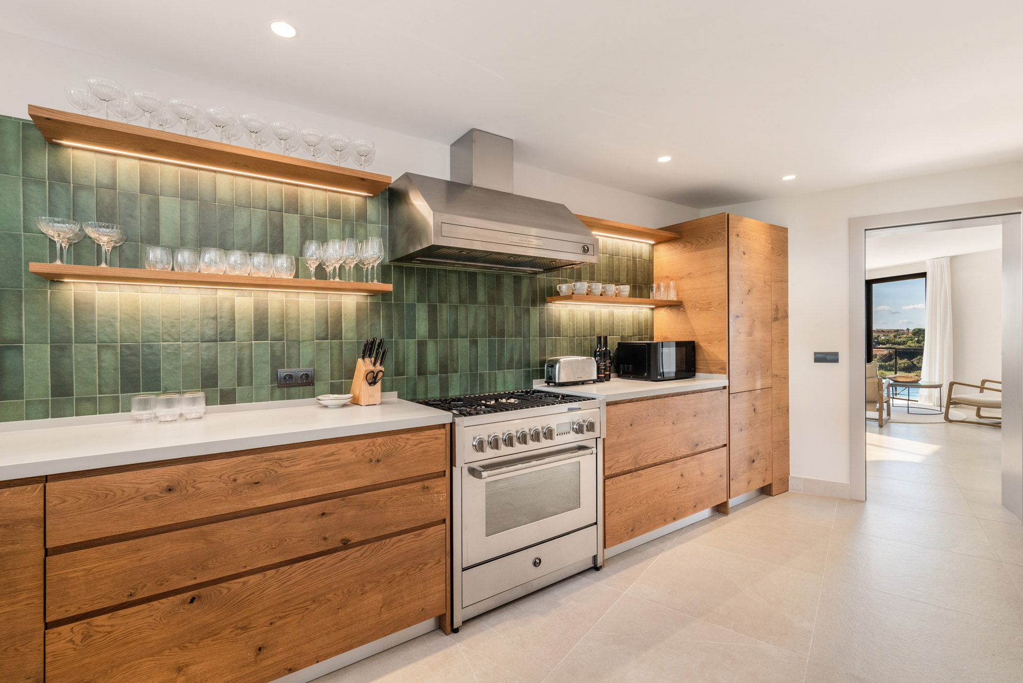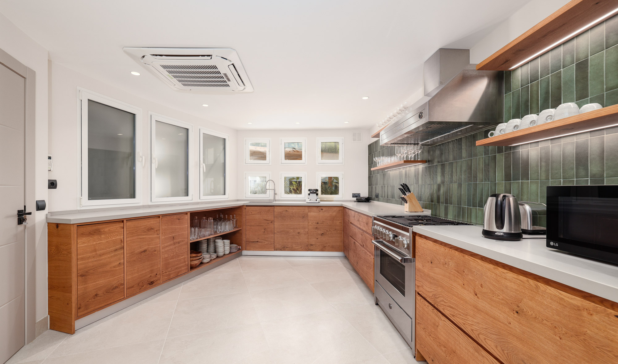 Villa Eirena benefits from two principal kitchens, both of which are housed within the main house. The smaller guest kitchen is attractively styled with wooden cabinetry and green tiled splashback, and is an ideal space for preparing light snacks or coffee. For professional caterers, the villa also offers a fully equipped chef’s kitchen, complete with six-ring gas stove, industrial oven, walk-in fridge, warming drawers and steamer.