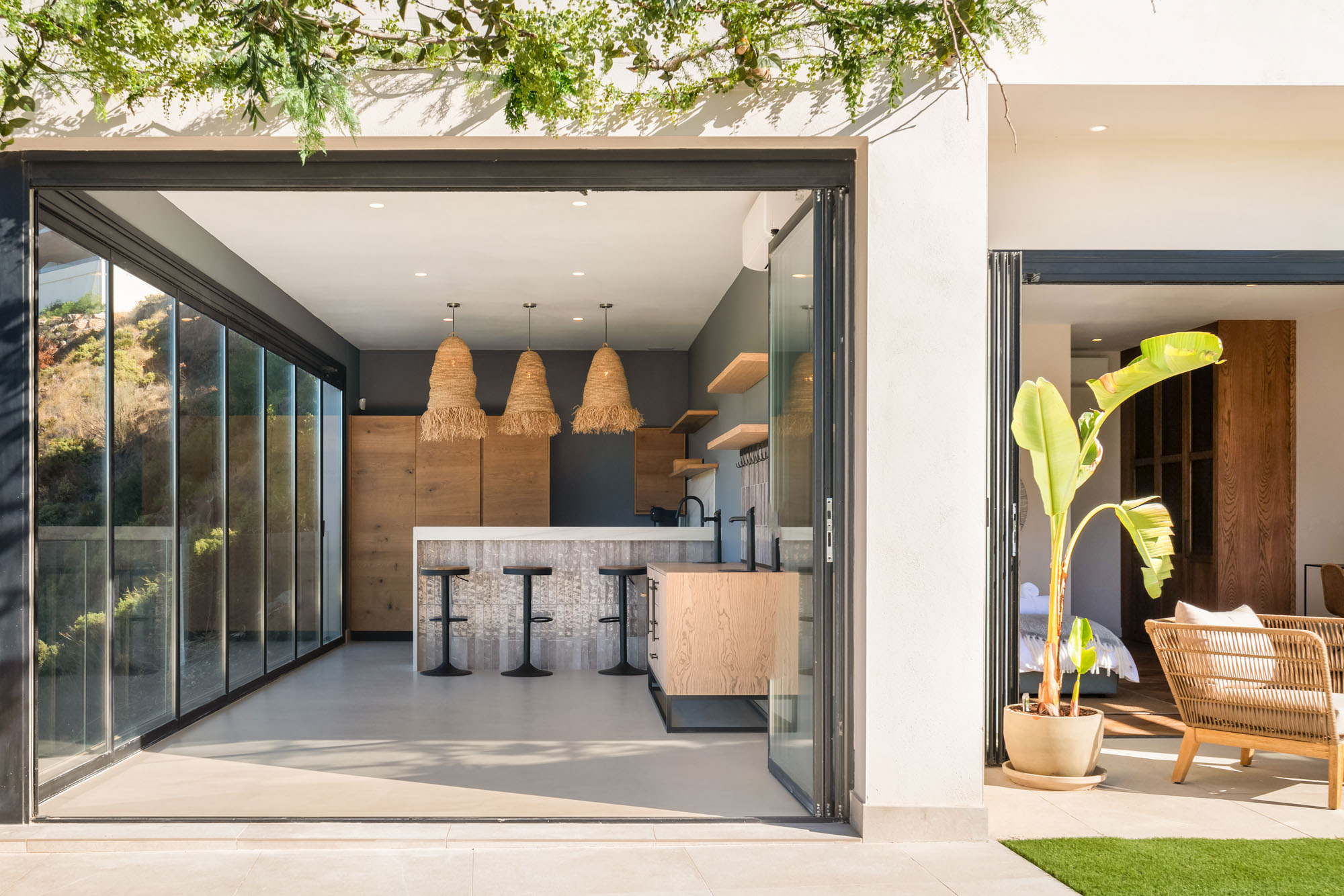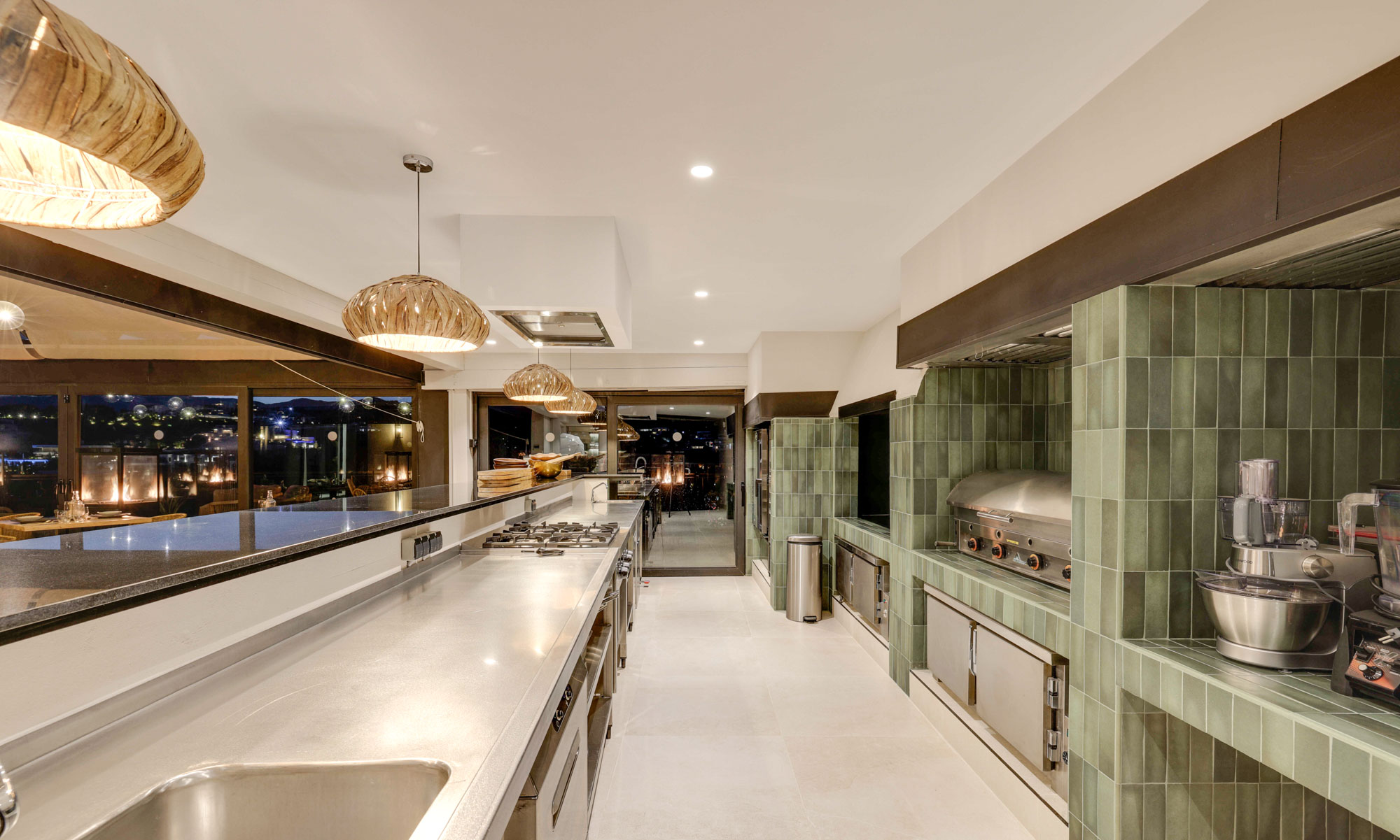 Enjoy flexible dining spaces indoors and out, including a professional chef’s kitchen, guest kitchen and wall-to-wall glass dining area with pool views