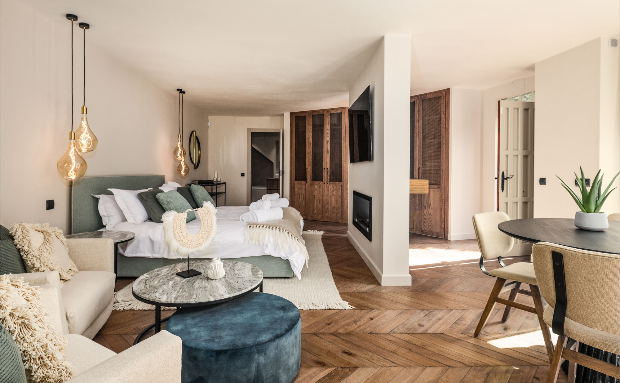 Hideaway Apartment 14: A tucked-away studio suite with private access to the street, this self-contained apartment features a super-king bed (180cm), a kitchenette, dining area, and patio with Jacuzzi and sunbeds. A quiet, independent space for event leaders or couples.