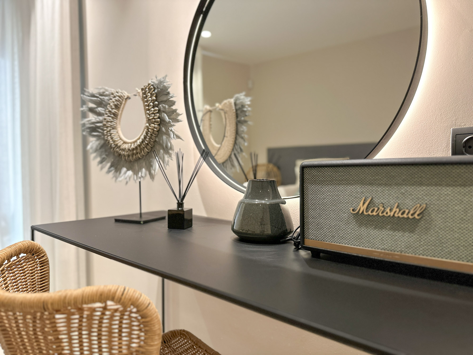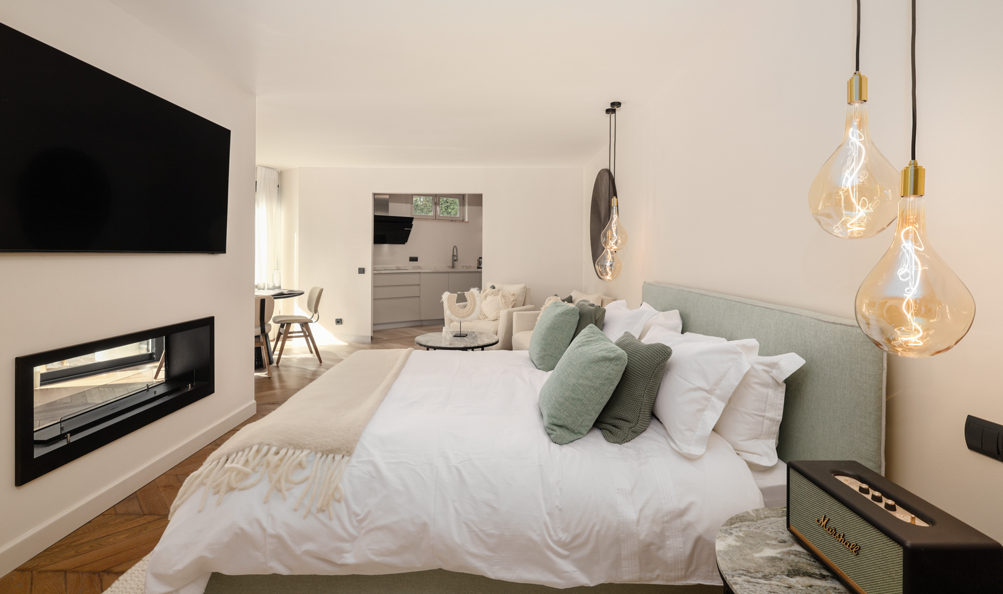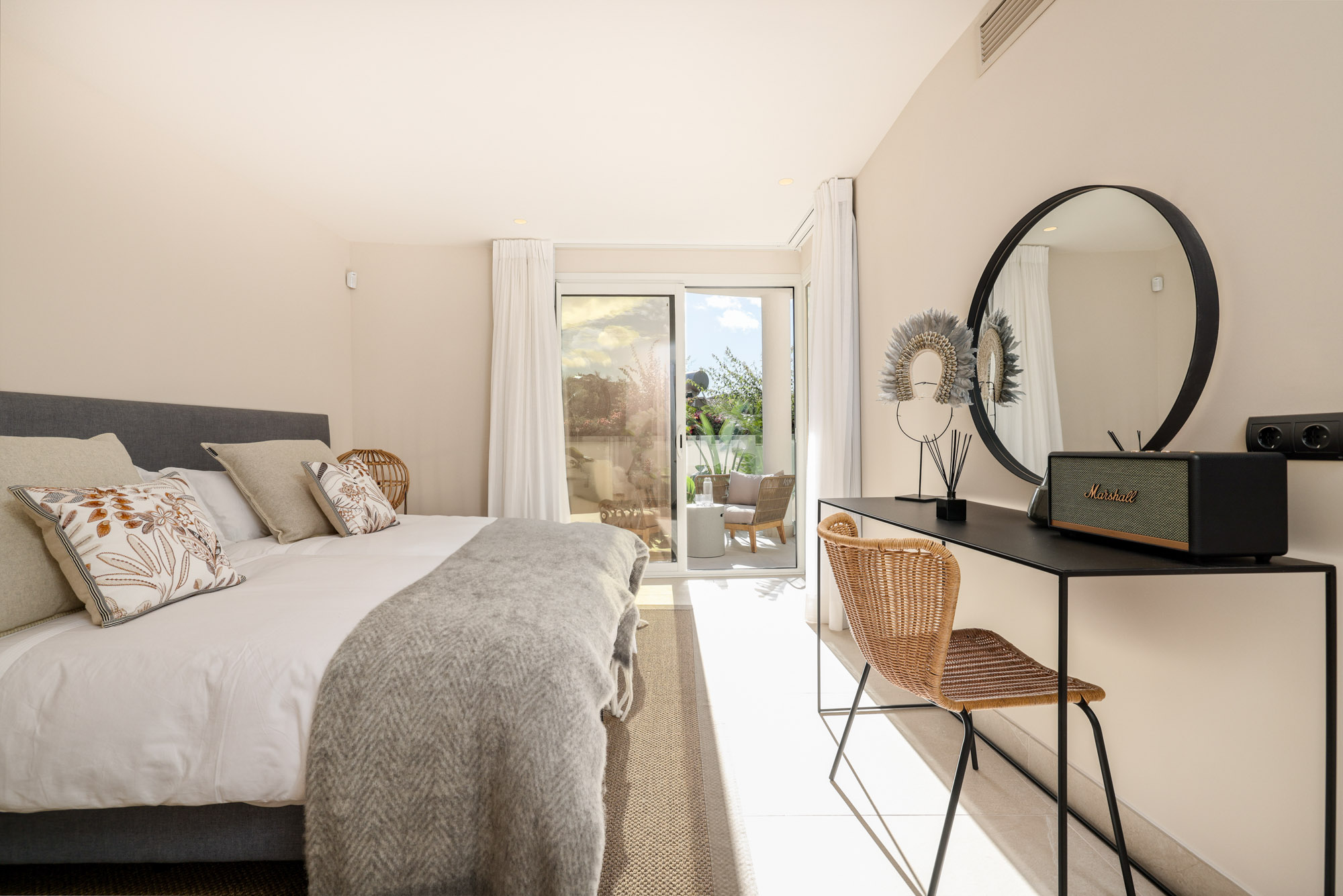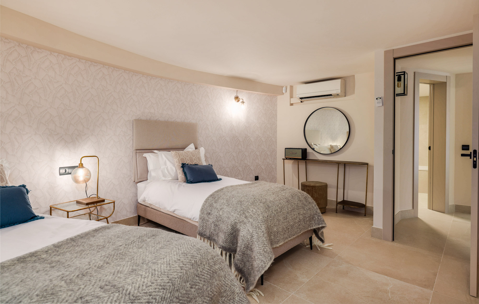Bedrooms 10 to 13: Four identical rooms in the new wing, each with a king-size bed (150cm), small private patio, and calming palette of blues and greys. Each includes a dressing table, Marshall Bluetooth speaker.