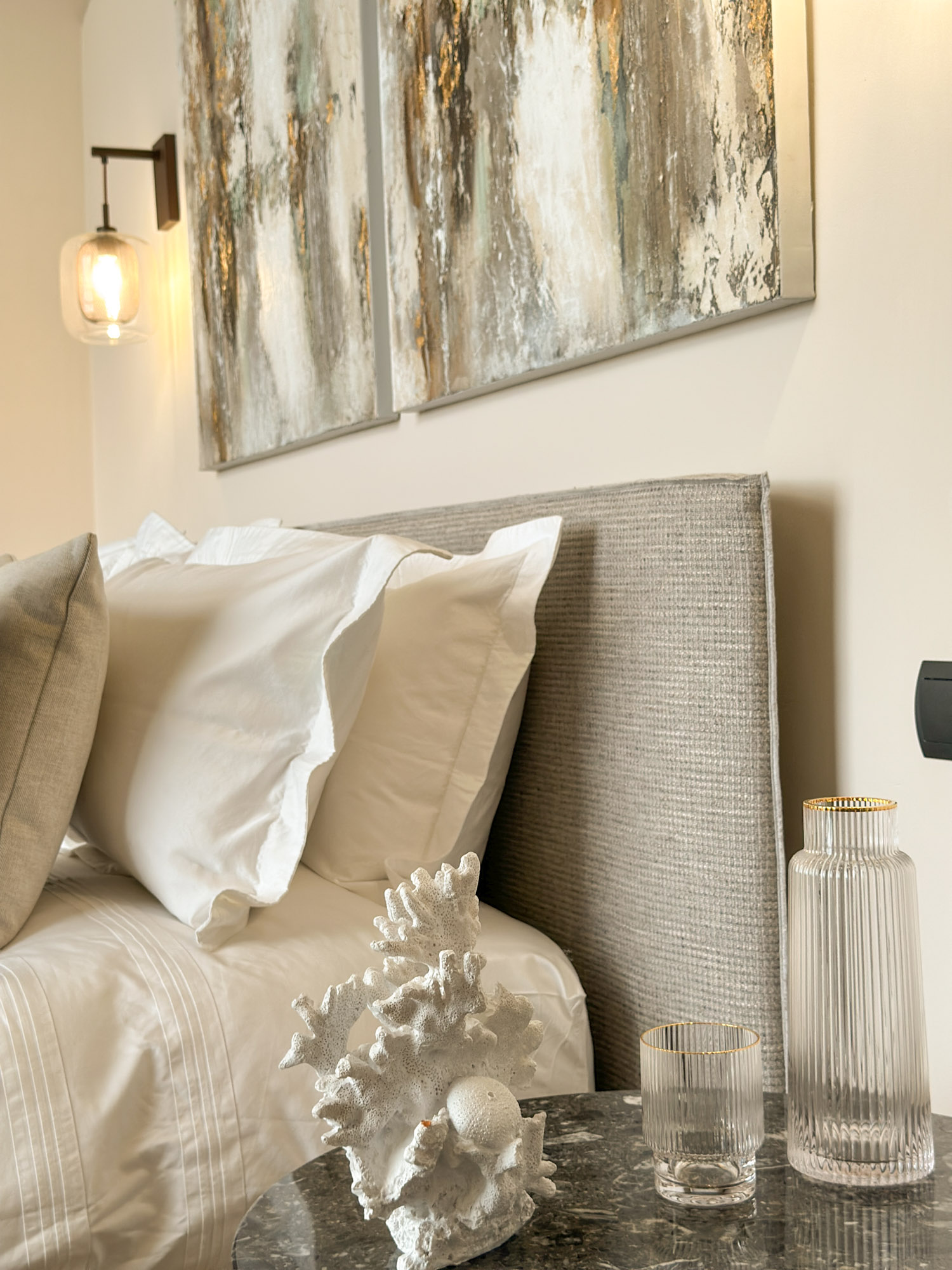 Each one of Villa Eirena’s elegant suites adheres to the same high standards, meaning there will be no conflict when it comes to room allocation. Hotel-grade beds and stone-clad bathroom are combined with curated details like Marshall speakers and hand-blown water jugs. The overall effect is a clean and comfortable aesthetic: an ideal backdrop for relaxation.
