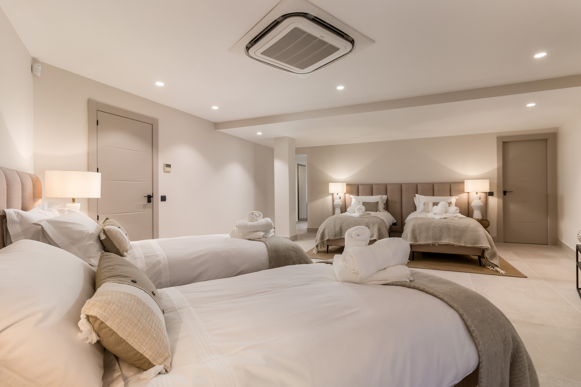 Bedroom 9: Another quad room on the lower ground floor, this space mirrors Bedroom 8 with 4 x 90cm beds, a sitting area, and a large window facing the pool ramp.