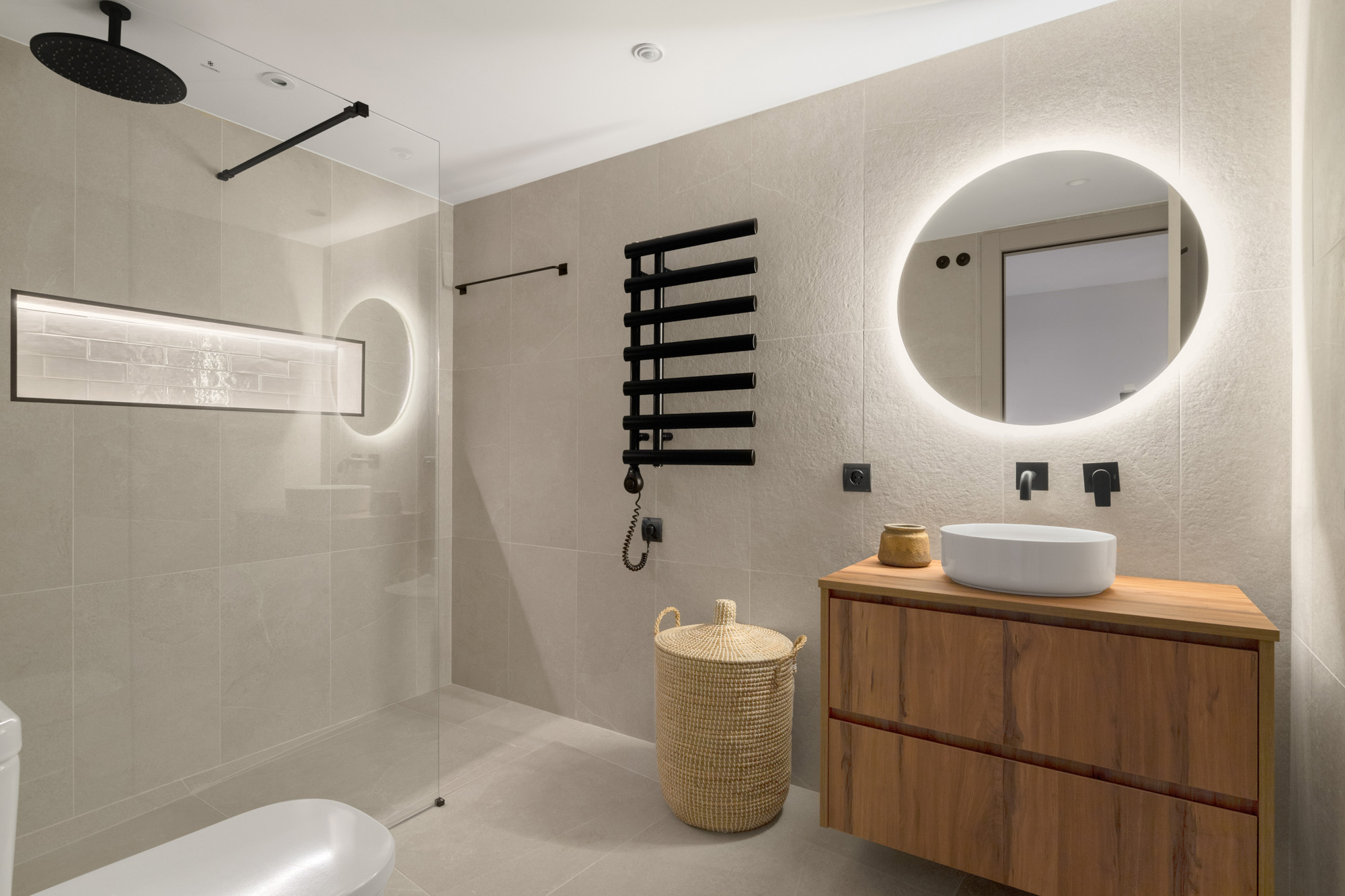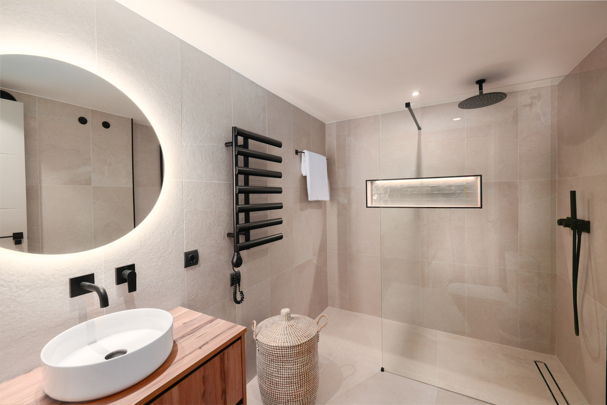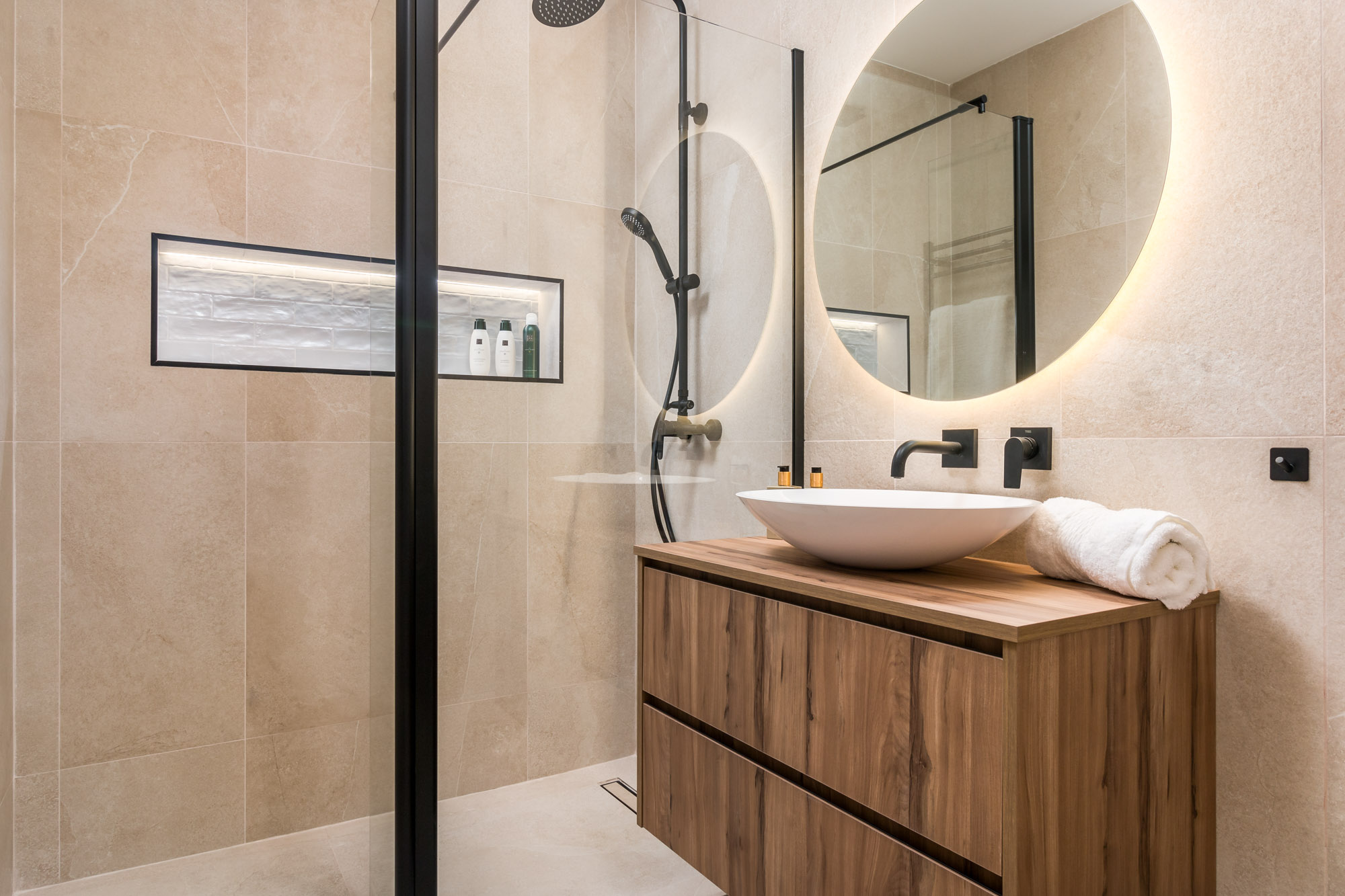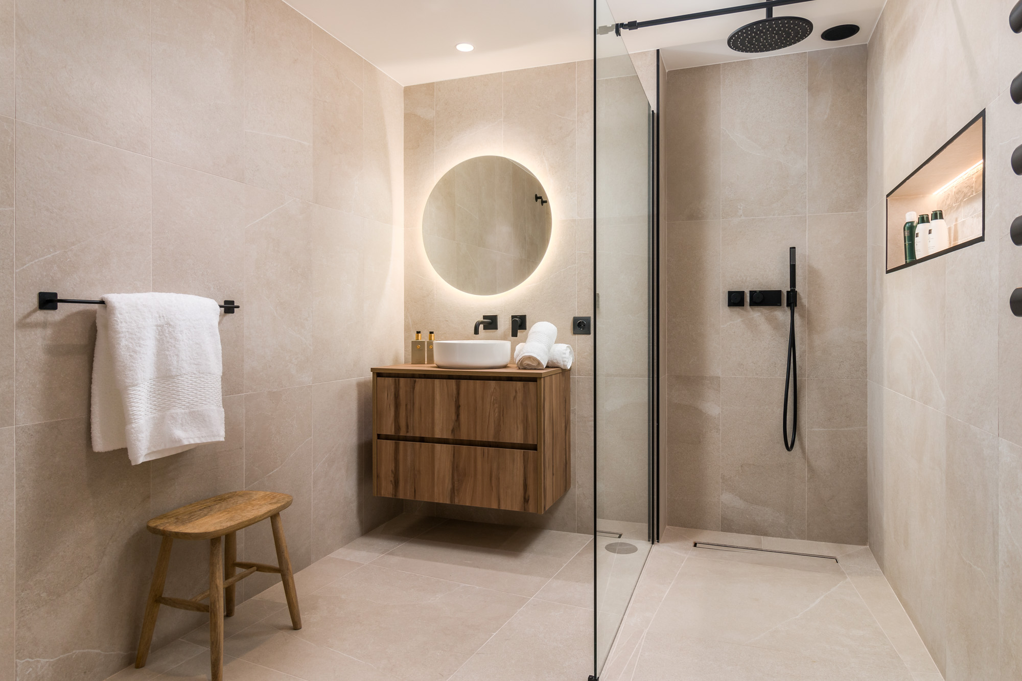 En-suite bathroom in natural stone tones with walk-in rain shower.