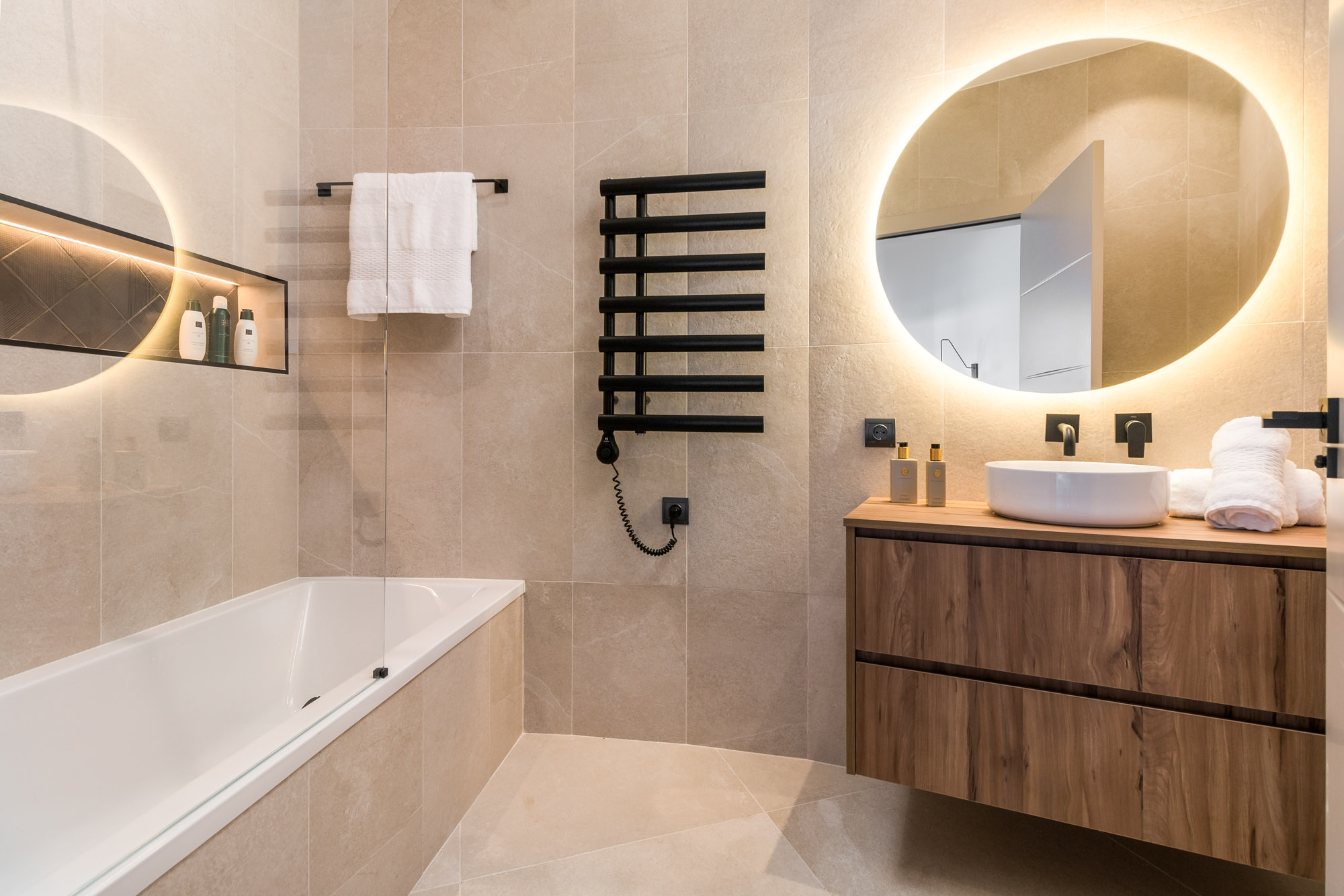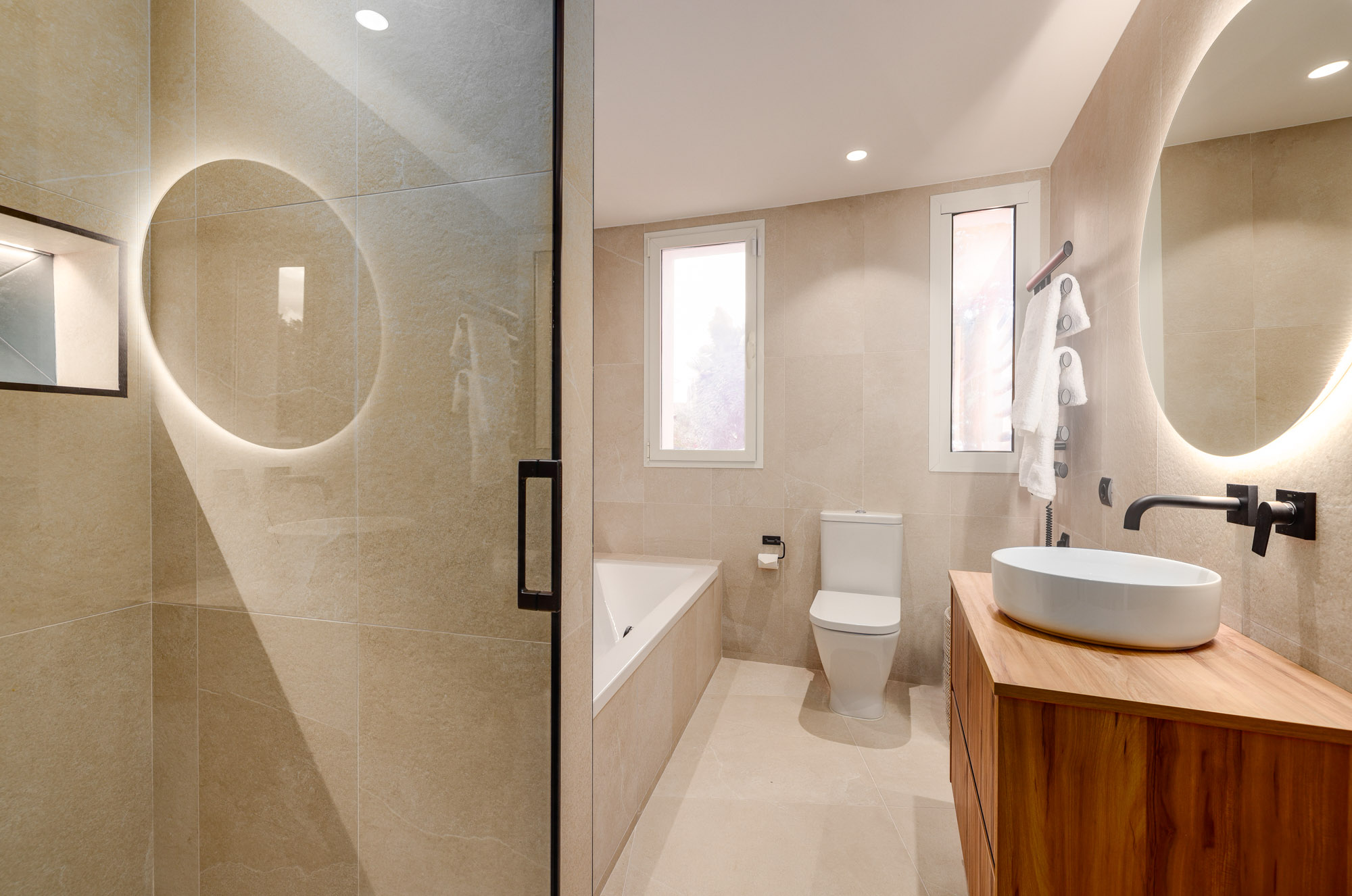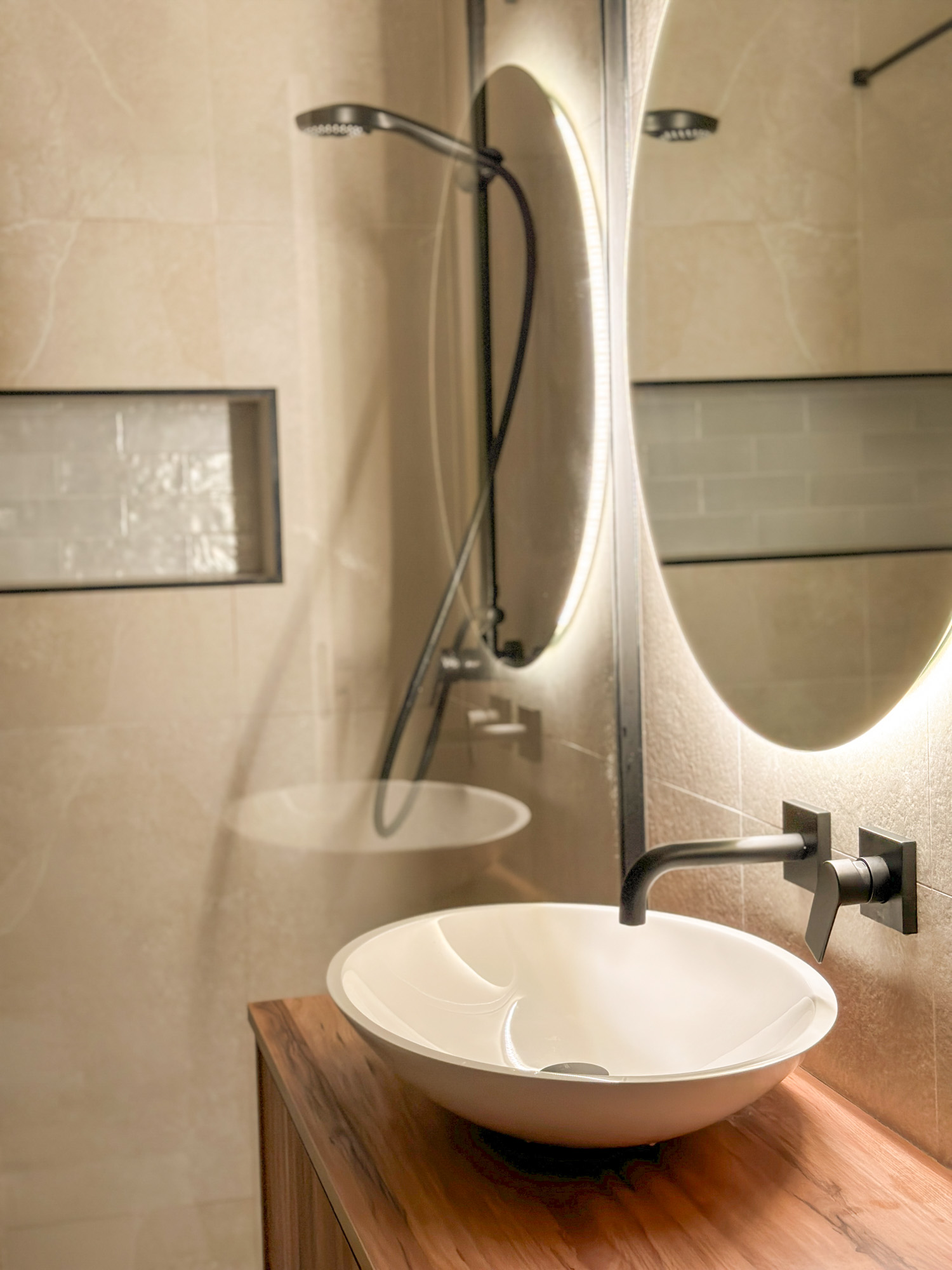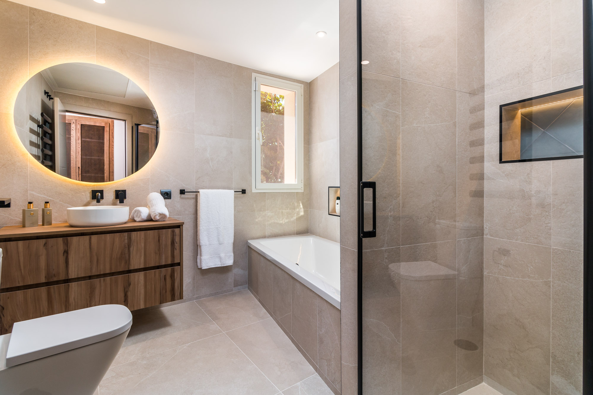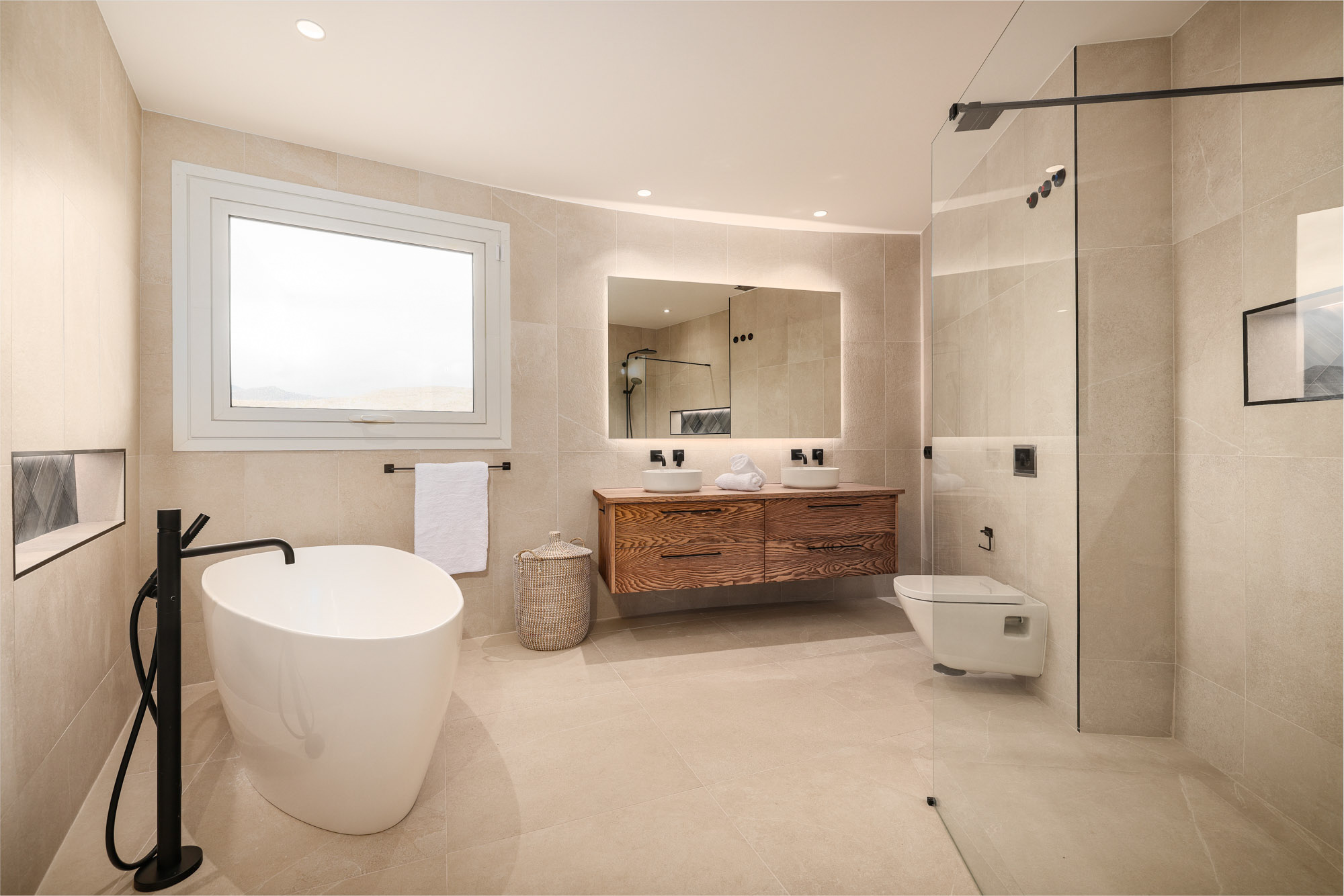 En-suite bathroom in natural stone tones with walk-in rain shower.