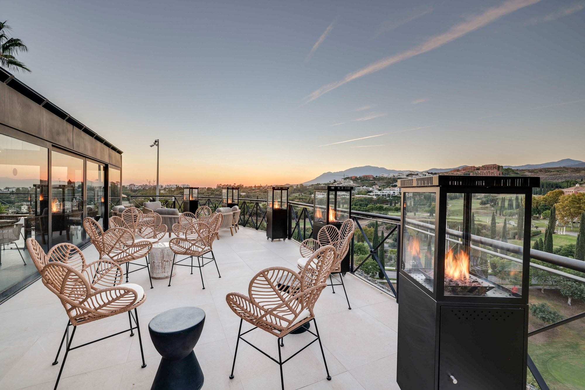 Catch golden hour on a sprawling rooftop terrace with sea views stretching to the coastline of Morocco