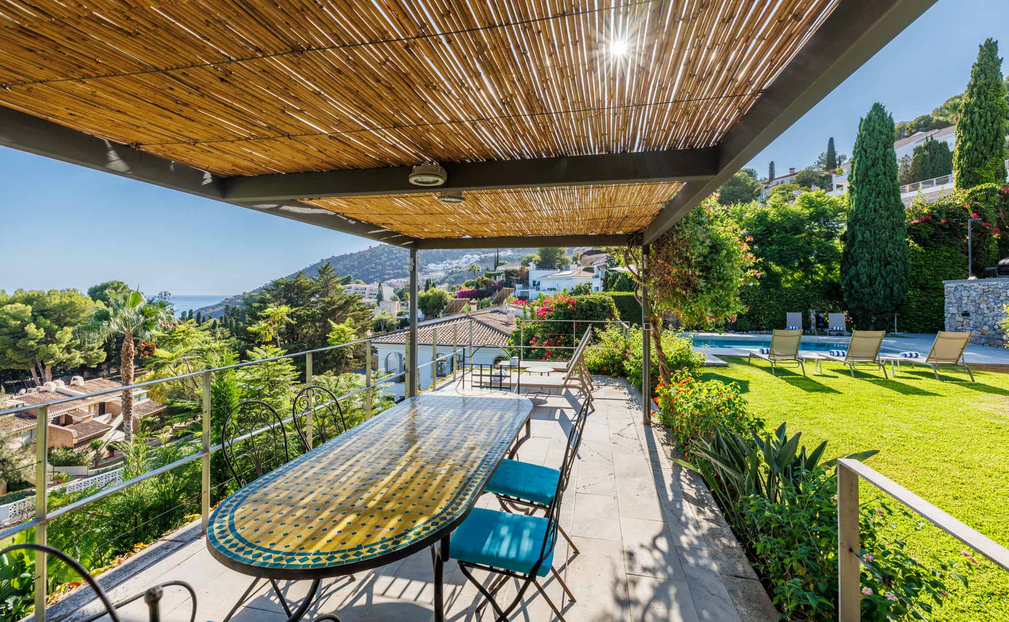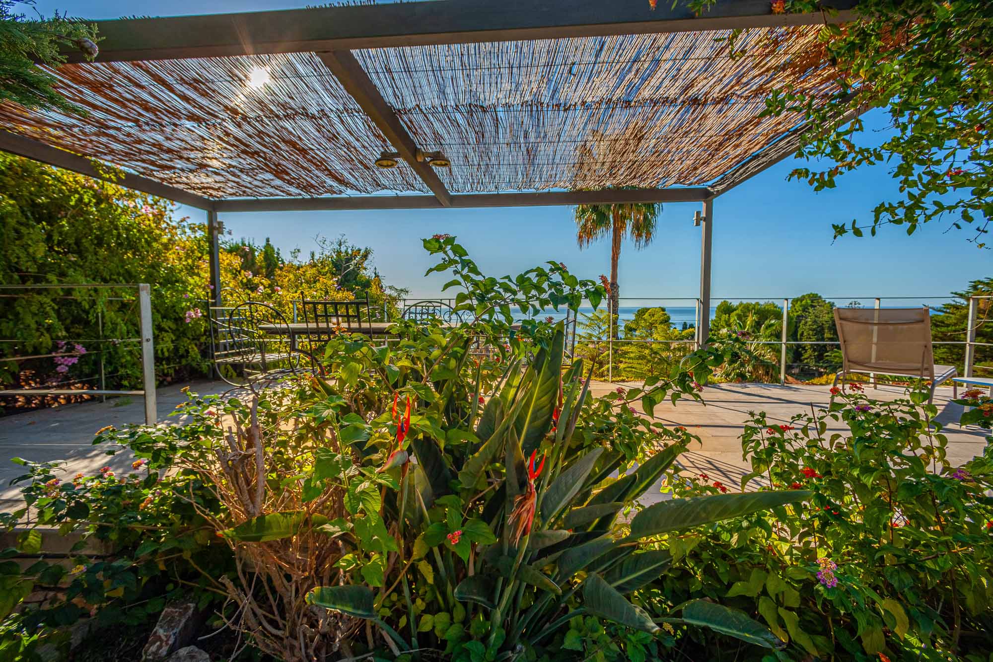 Overlooking the garden and swimming pool on an elevated platform is a charming, shaded pergola with family-sized dining table and eight chairs, a cool and peaceful spot to escape the sun and soak up the sea views.