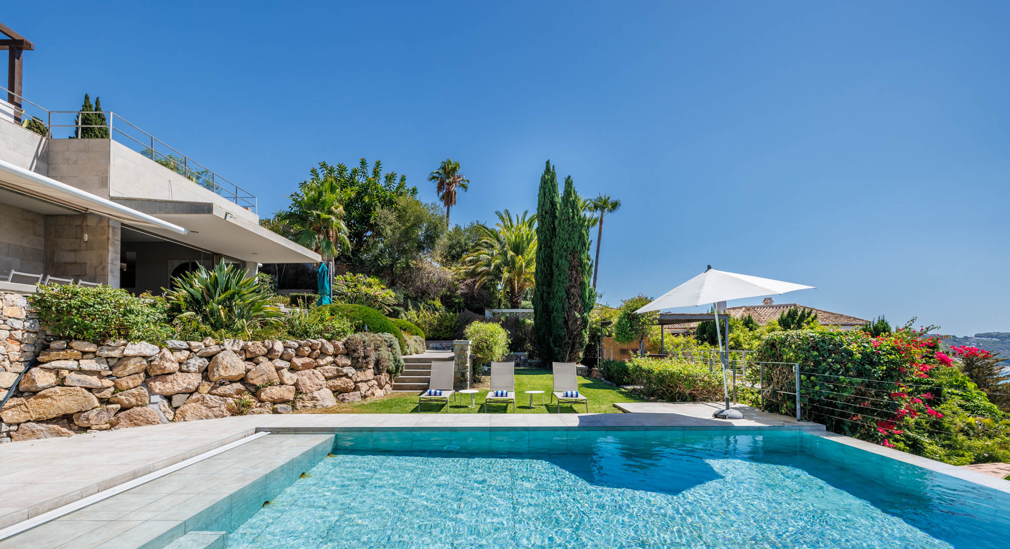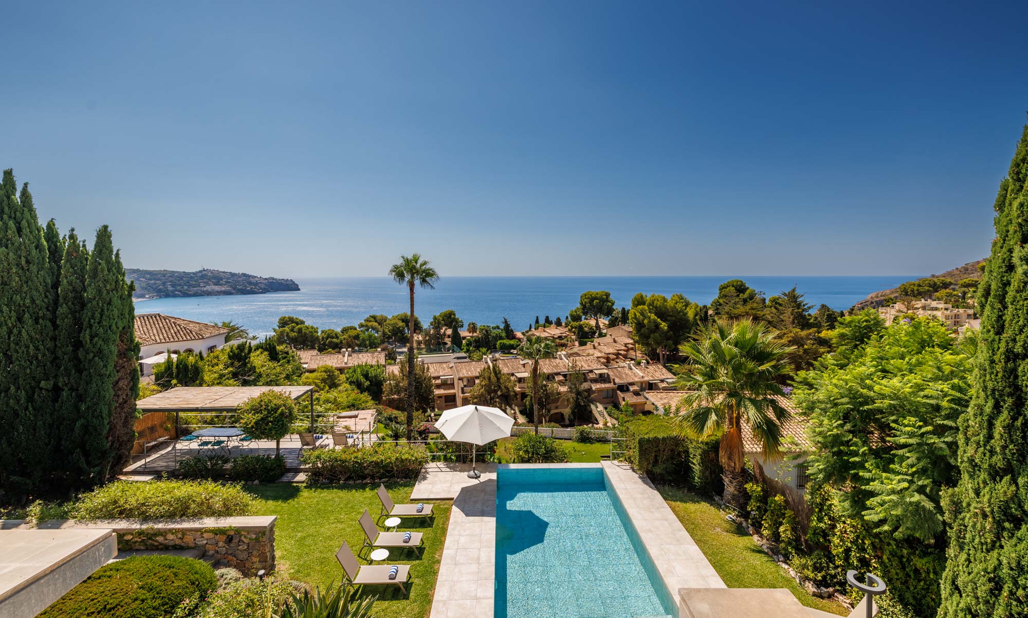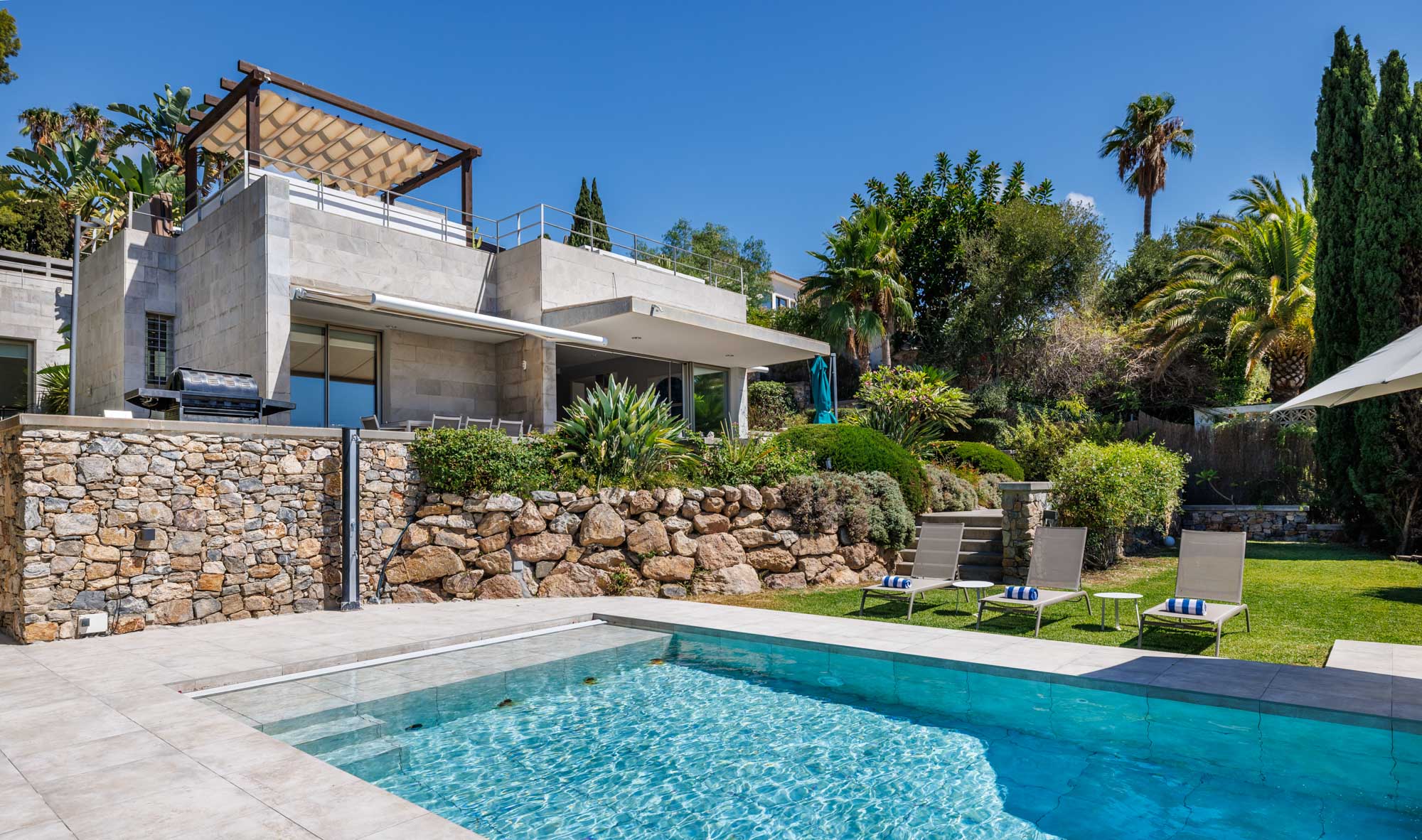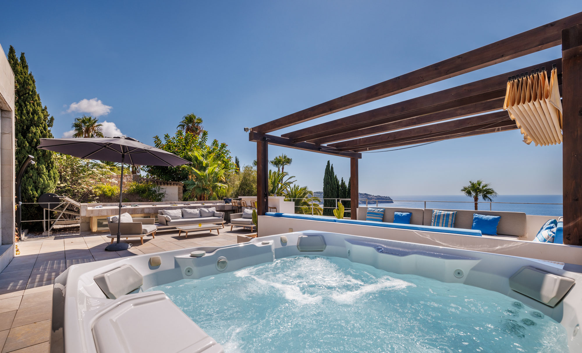 Expansive terraces give way to lush gardens with a private pool and shaded pergola, while the top floor of the property an open-air bar, jacuzzi and seating area can be found, all facing spectacular views of the sparkling Med.