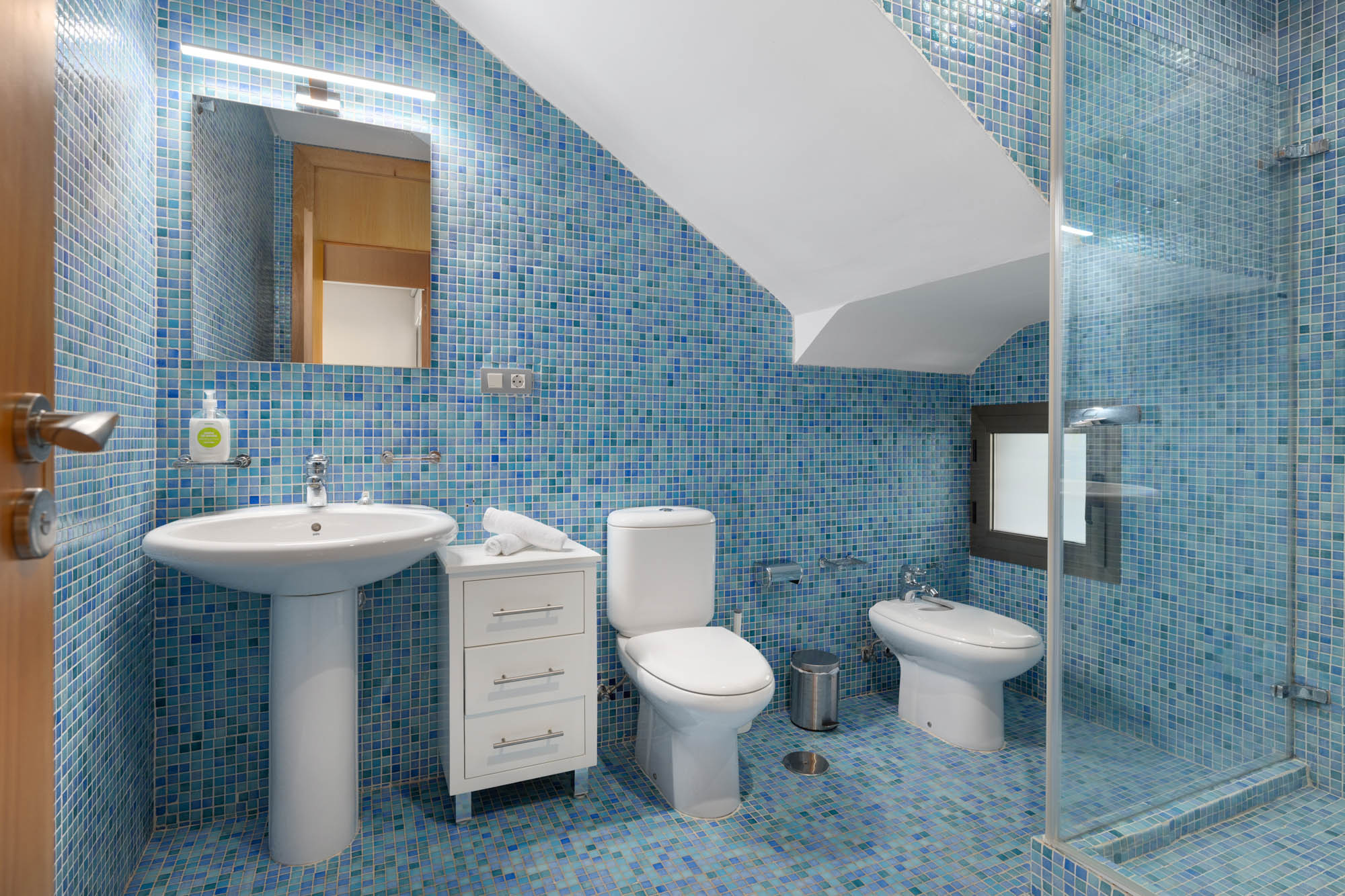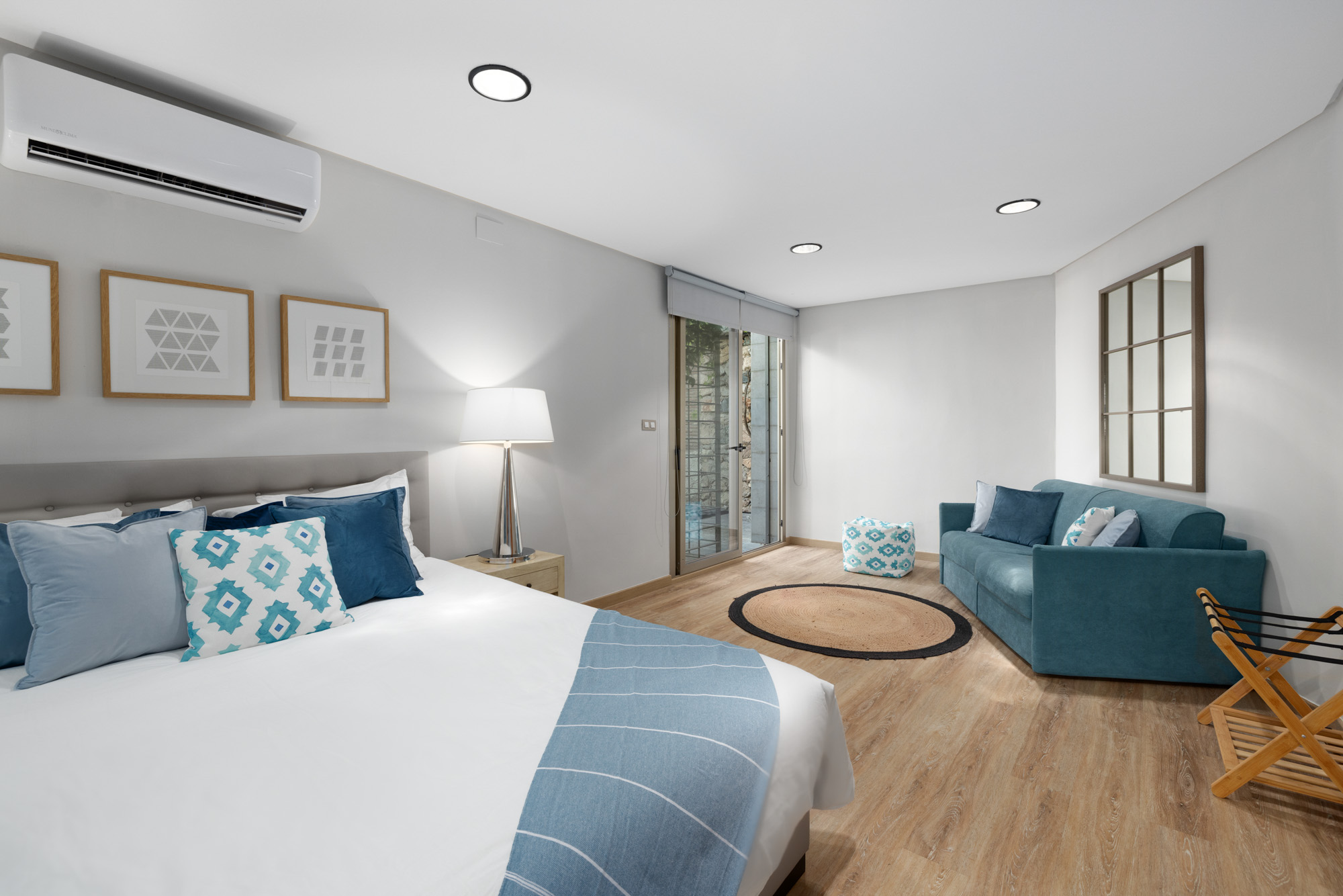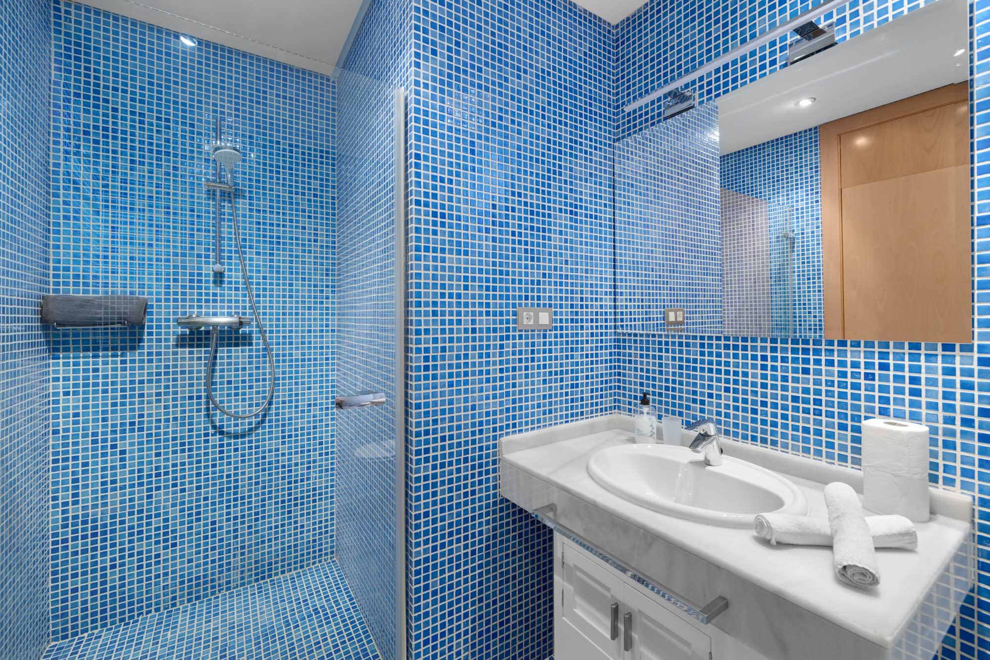 Bedroom 1: Principal bedroom on the ground floor. King-sized bed (180 x 200cm) and blue sofa that folds out into double bed. French windows opening out onto private terrace with table and chairs. There is an additional set of French doors at other side of the room leading out onto an interior garden patio shared with bedroom 5. Features an en-suite, blue-tiled bathroom with walk-in shower.