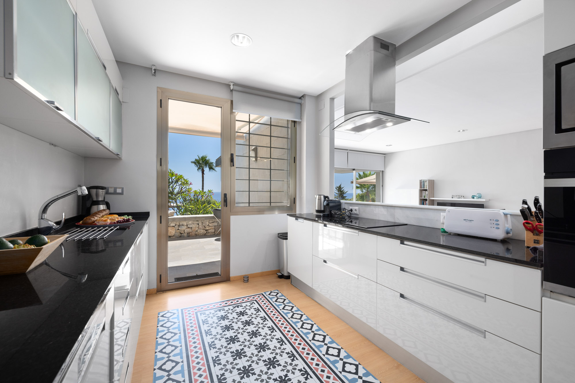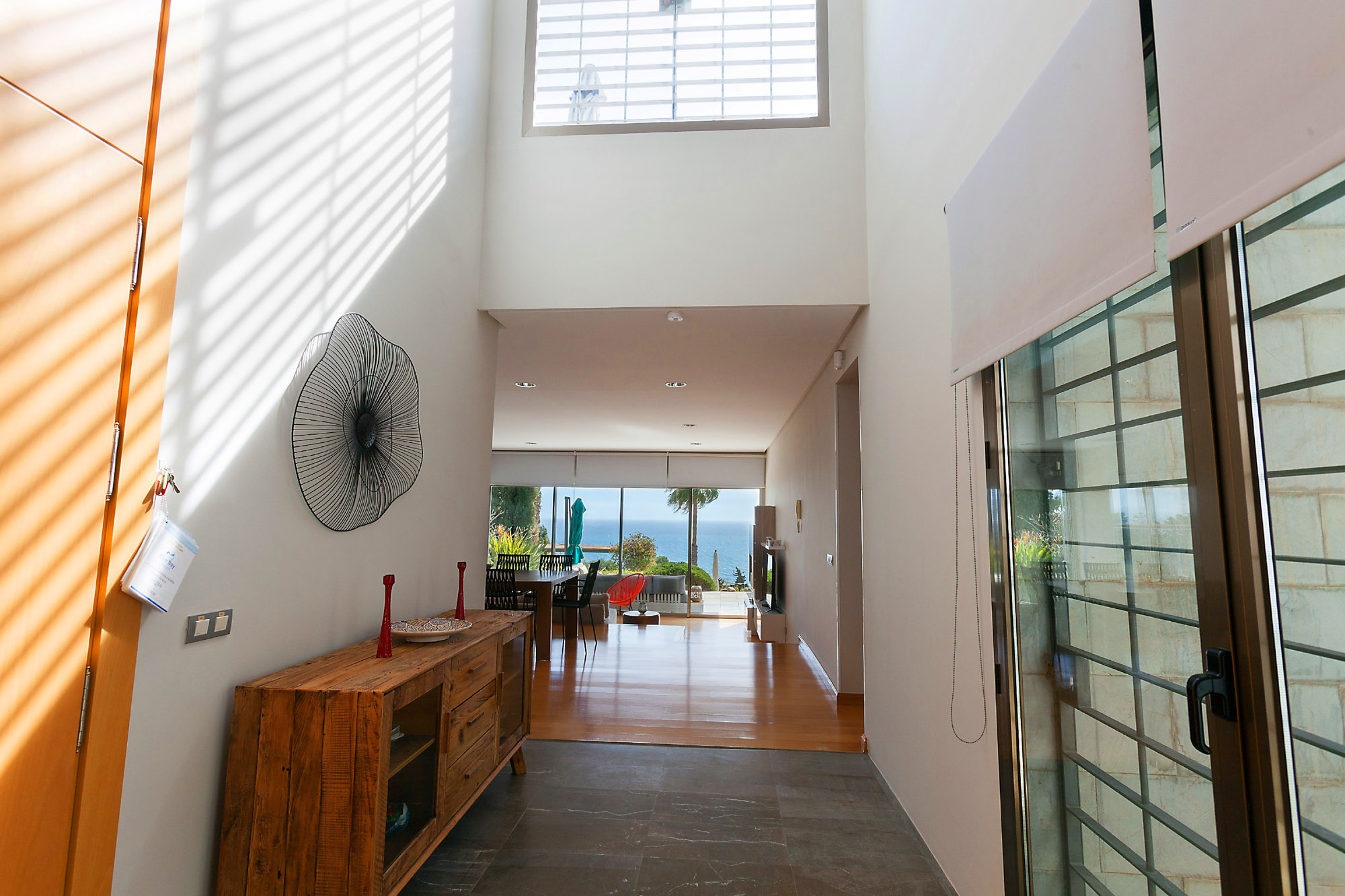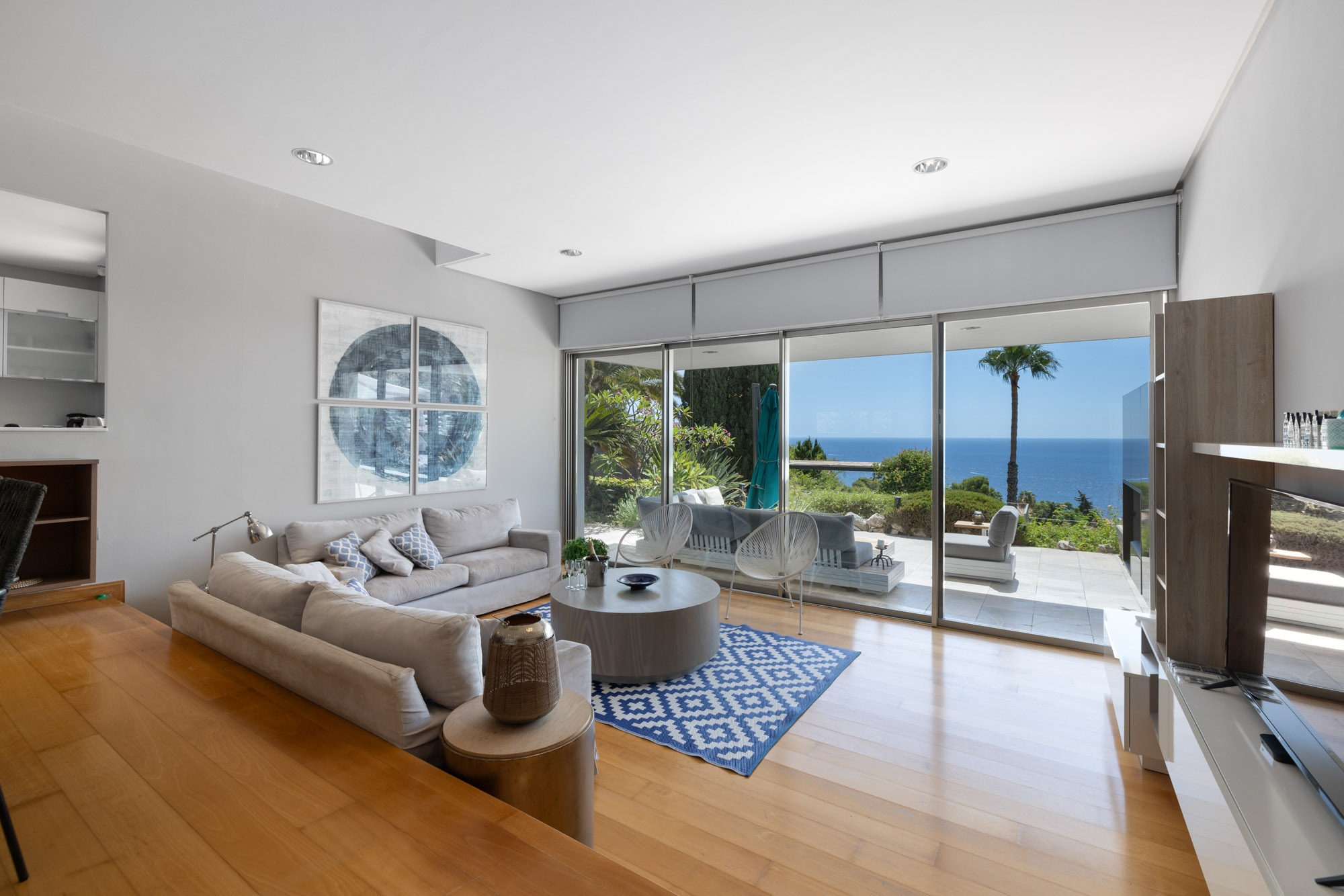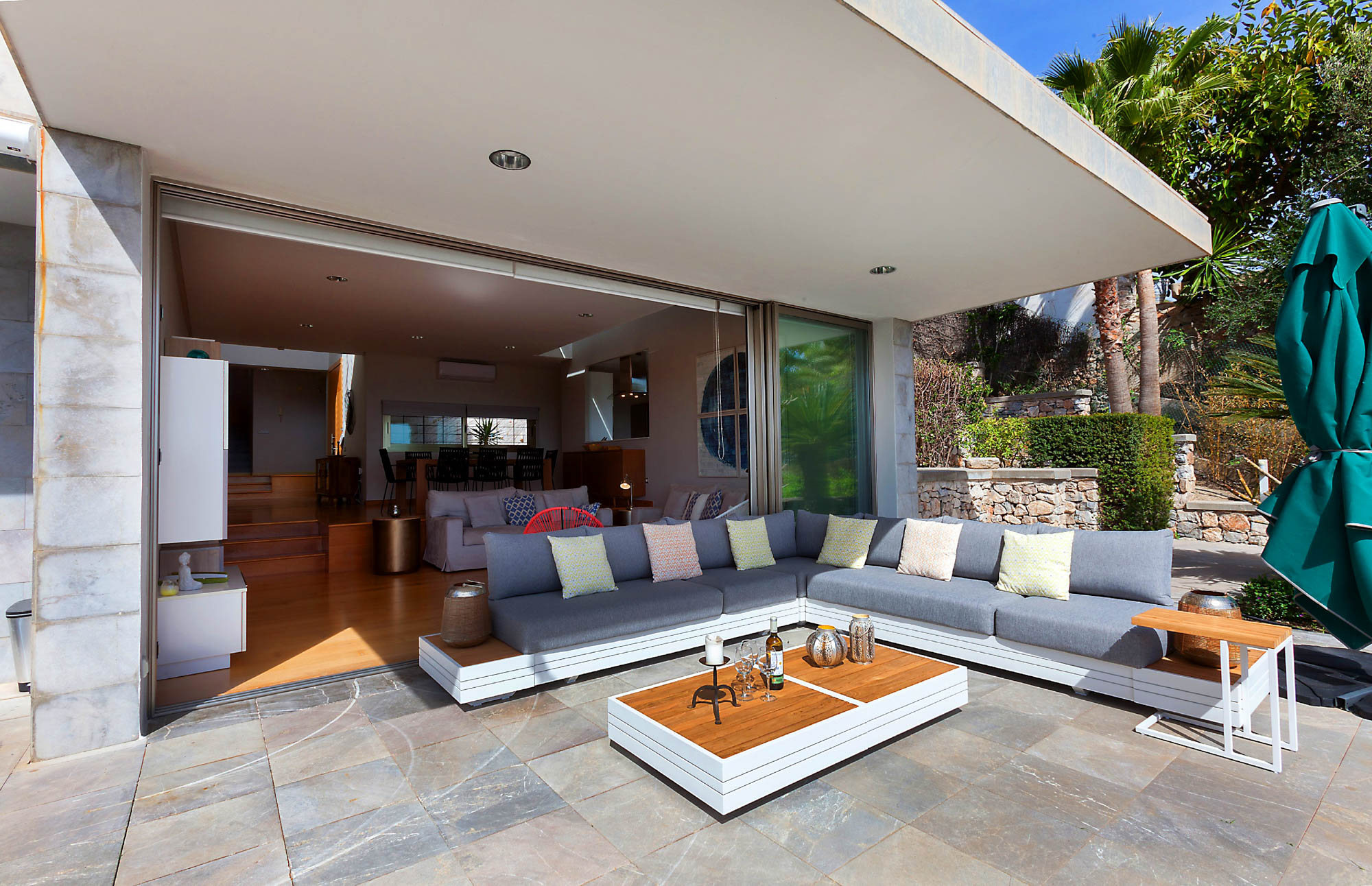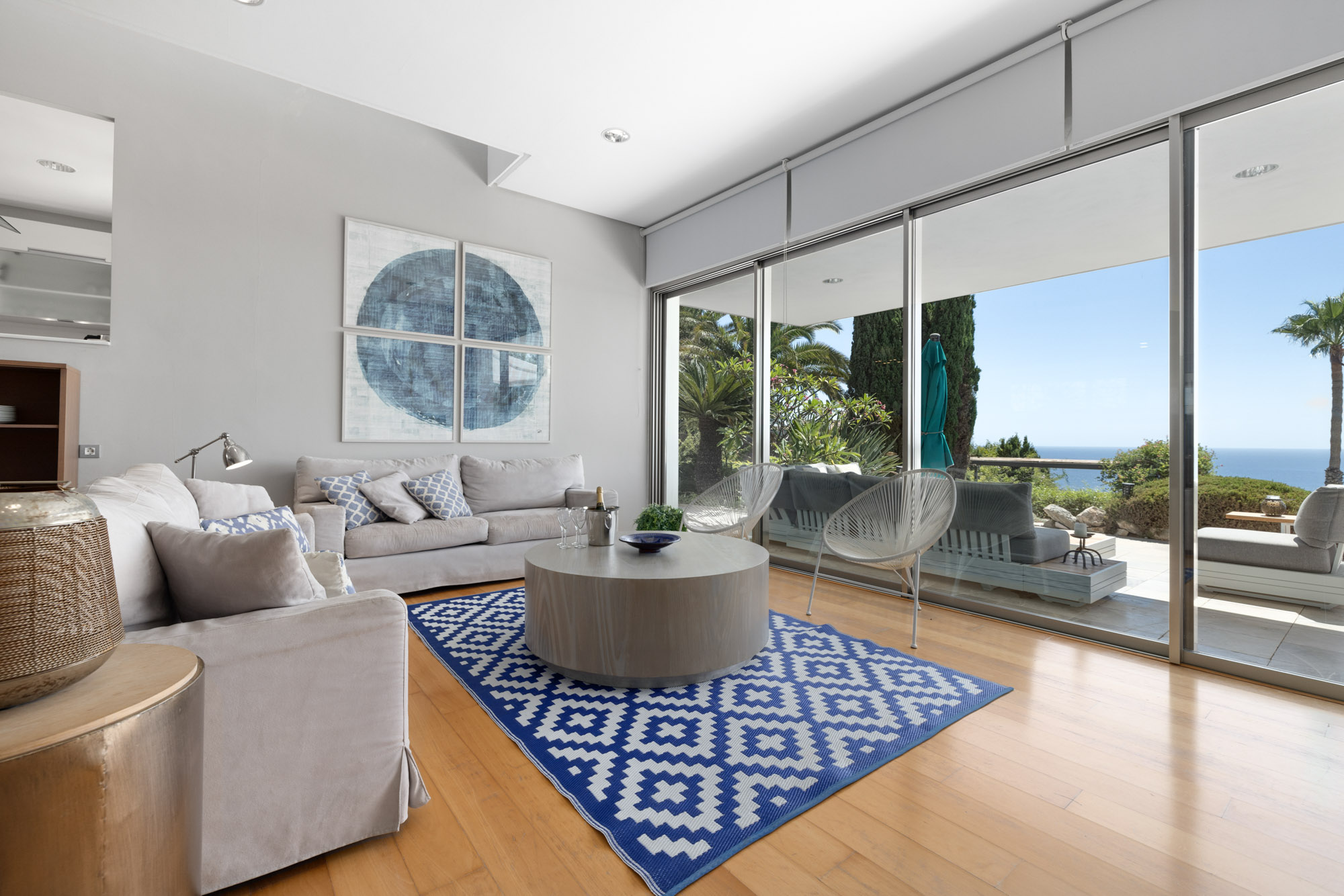 Glass doors open up onto an expansive sun terrace, and when pushed open allow the indoor and outdoor spaces to blend effortlessly together as cool sea breeze flows throughout the house.