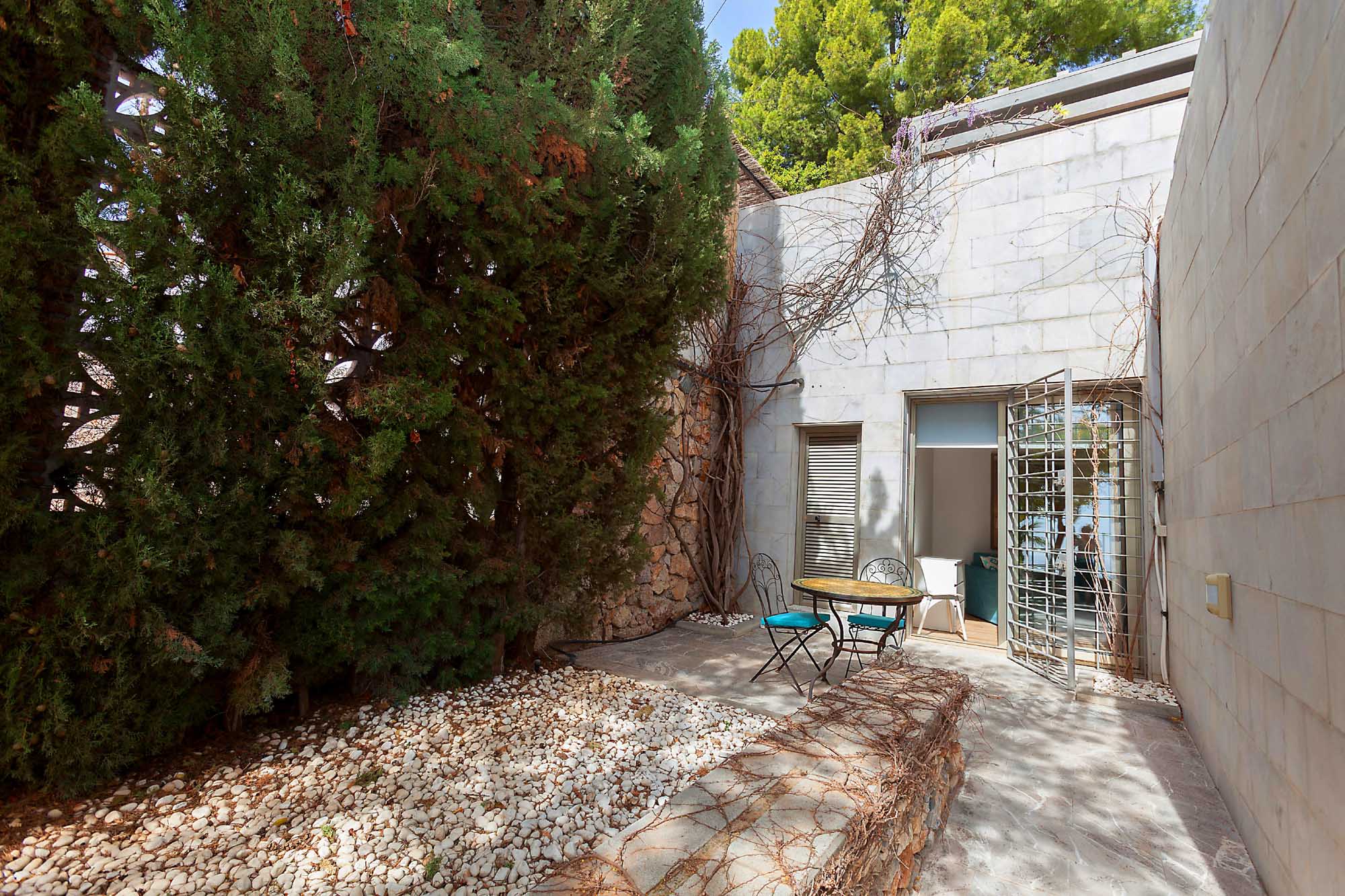 Bedroom 5: Small room with single bed on the ground floor next to bedroom 4, (additional single bed located beneath can be pulled out to make a twin) and window overlooking walled patio at back of property. Also has access through a glass door to the small interior garden patio shared with the master suite. Shares bathroom with twin room next door.