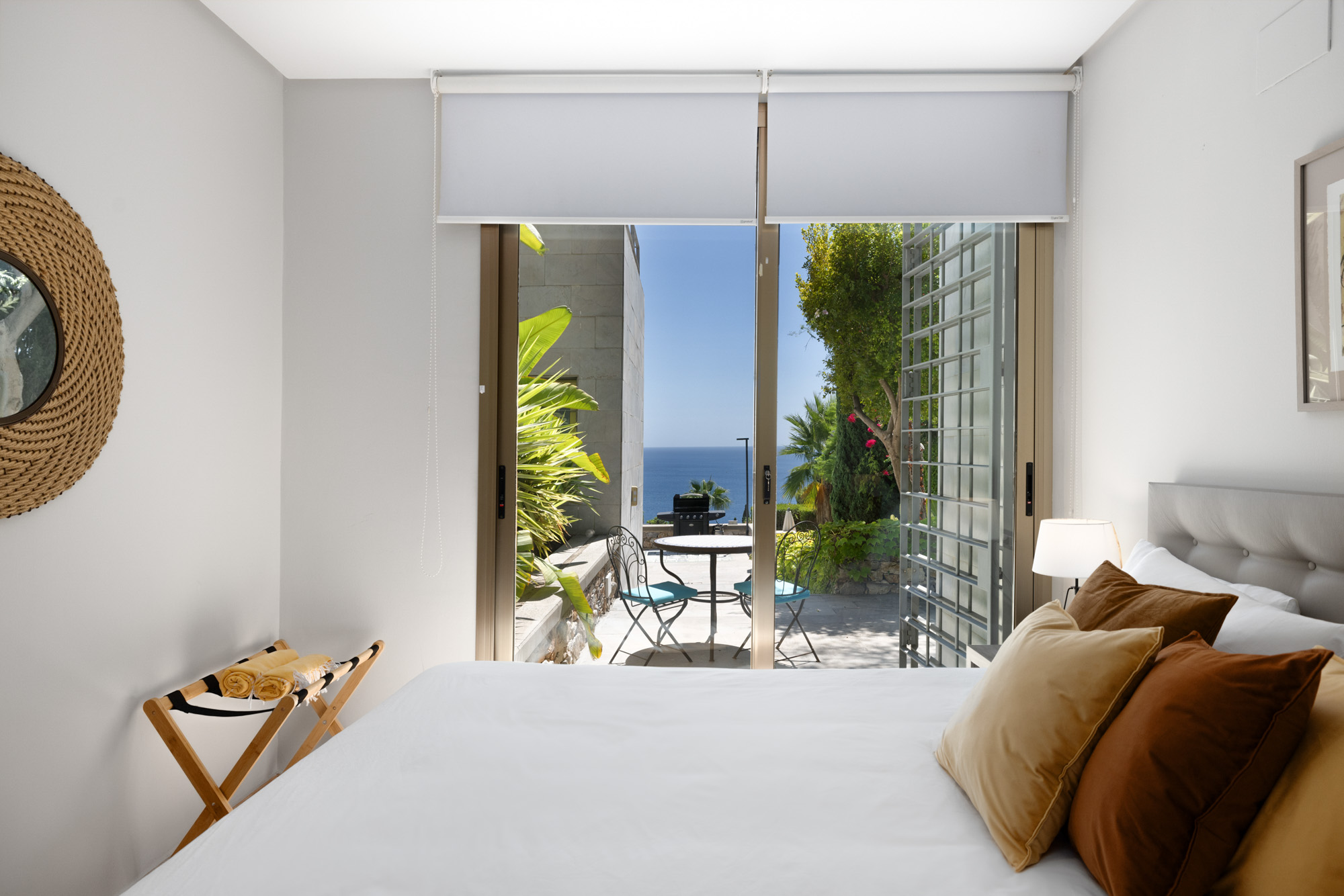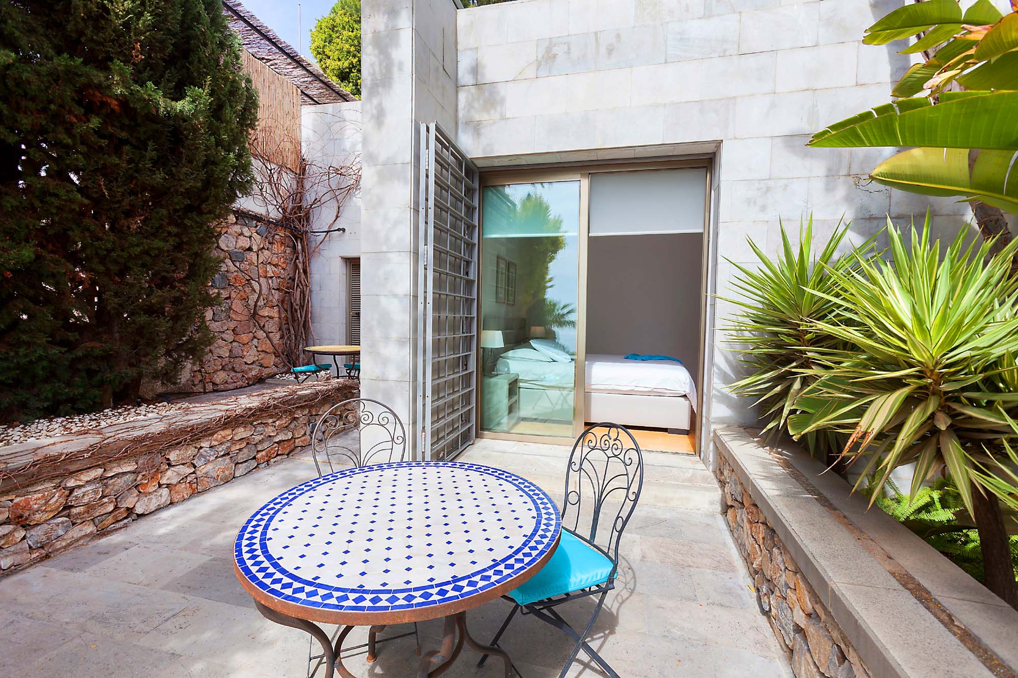 The villa’s five bedrooms feed off this central space. The three bedrooms located closest to the living room benefit from sea views and an abundance of natural light thanks to their floor-to-ceiling windows, which open out onto charming, shaded terraces with tables and chairs – ideal for an intimate breakfast for two.