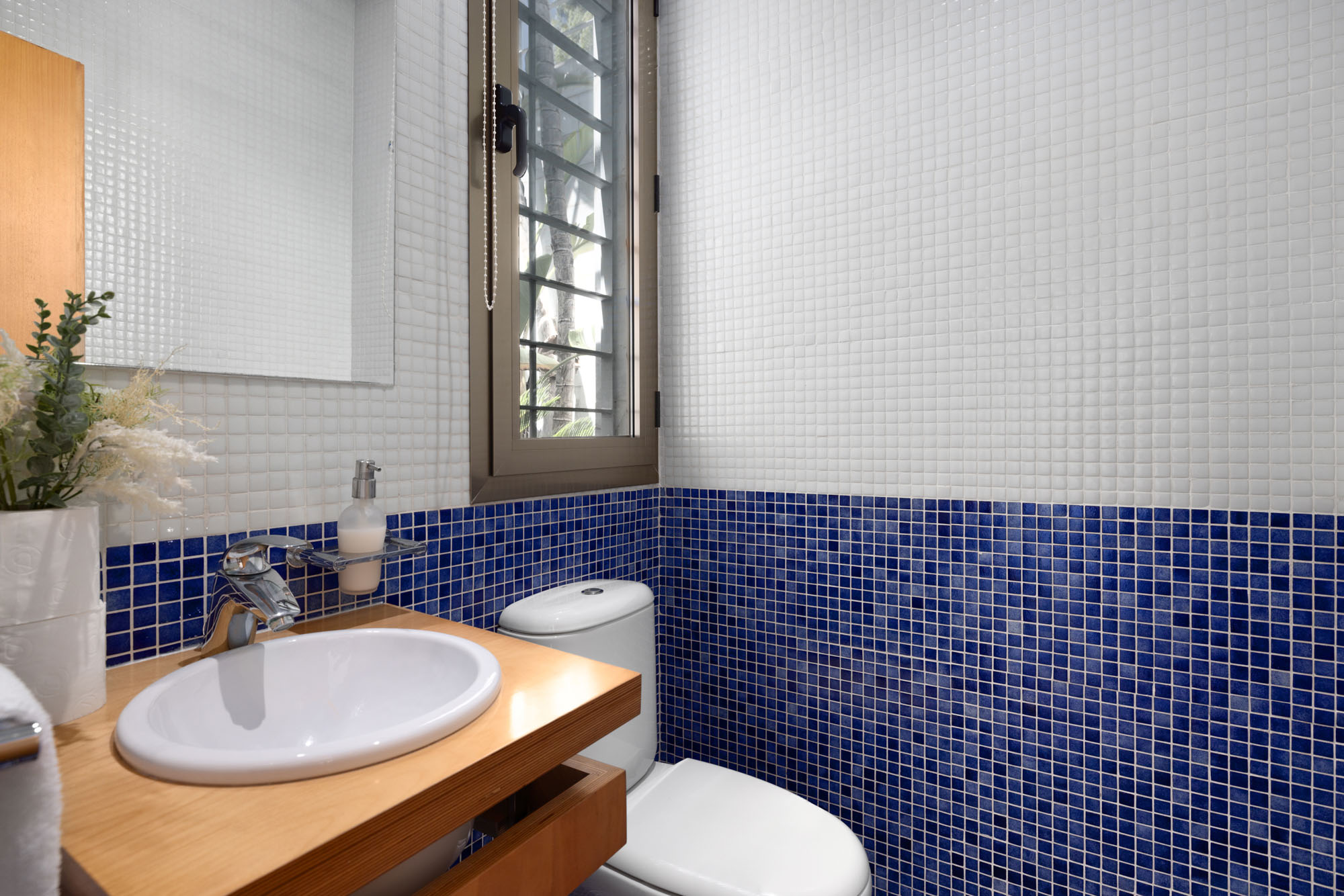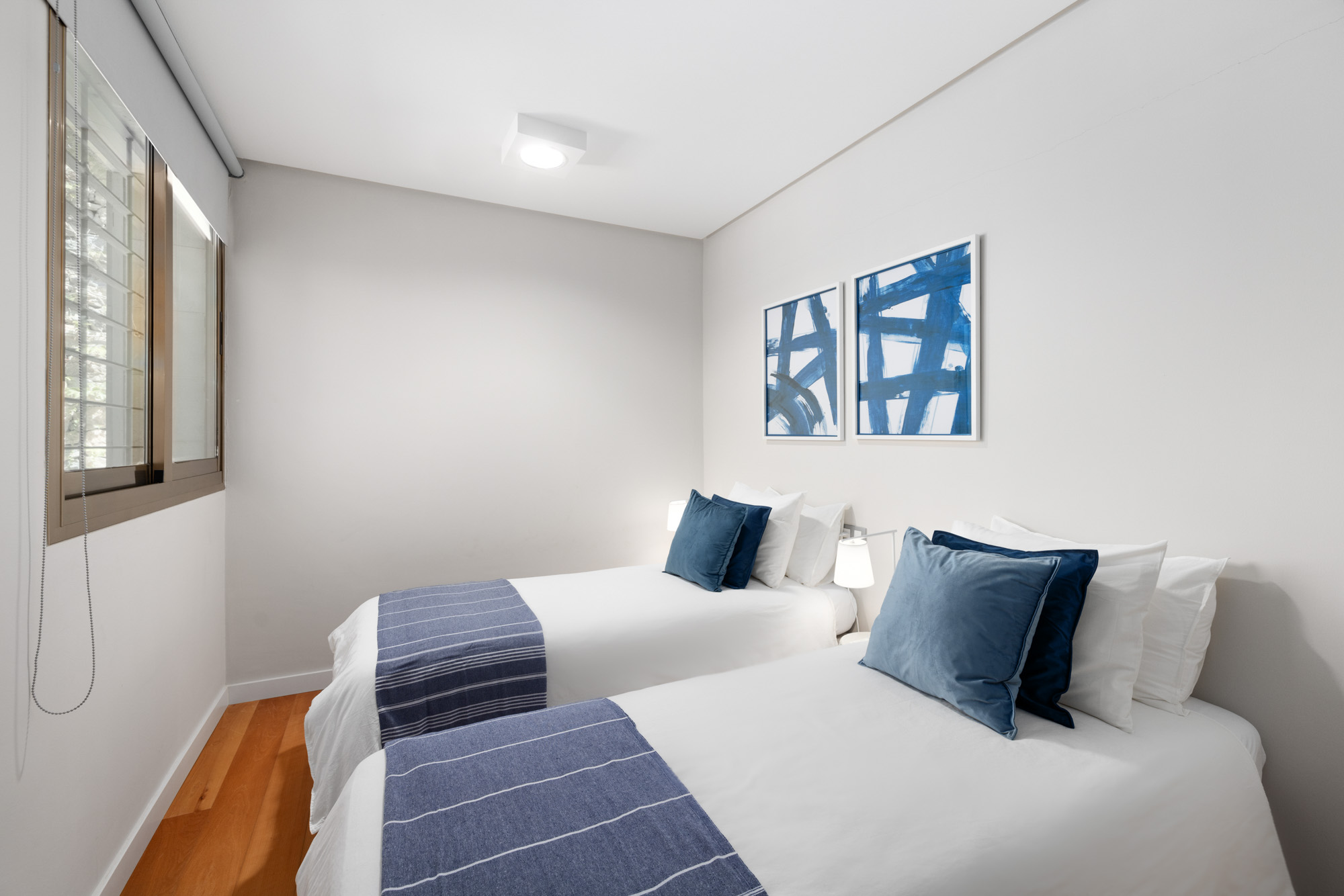 Bedroom 4: Located up steps near entrance hall on the ground floor. Twin single beds done up in blue and white striped linen, bedside table and window overlooking interior garden patio. Shared bathroom with bedroom five featuring blue, mosaic tiling detail and large walk-in shower.