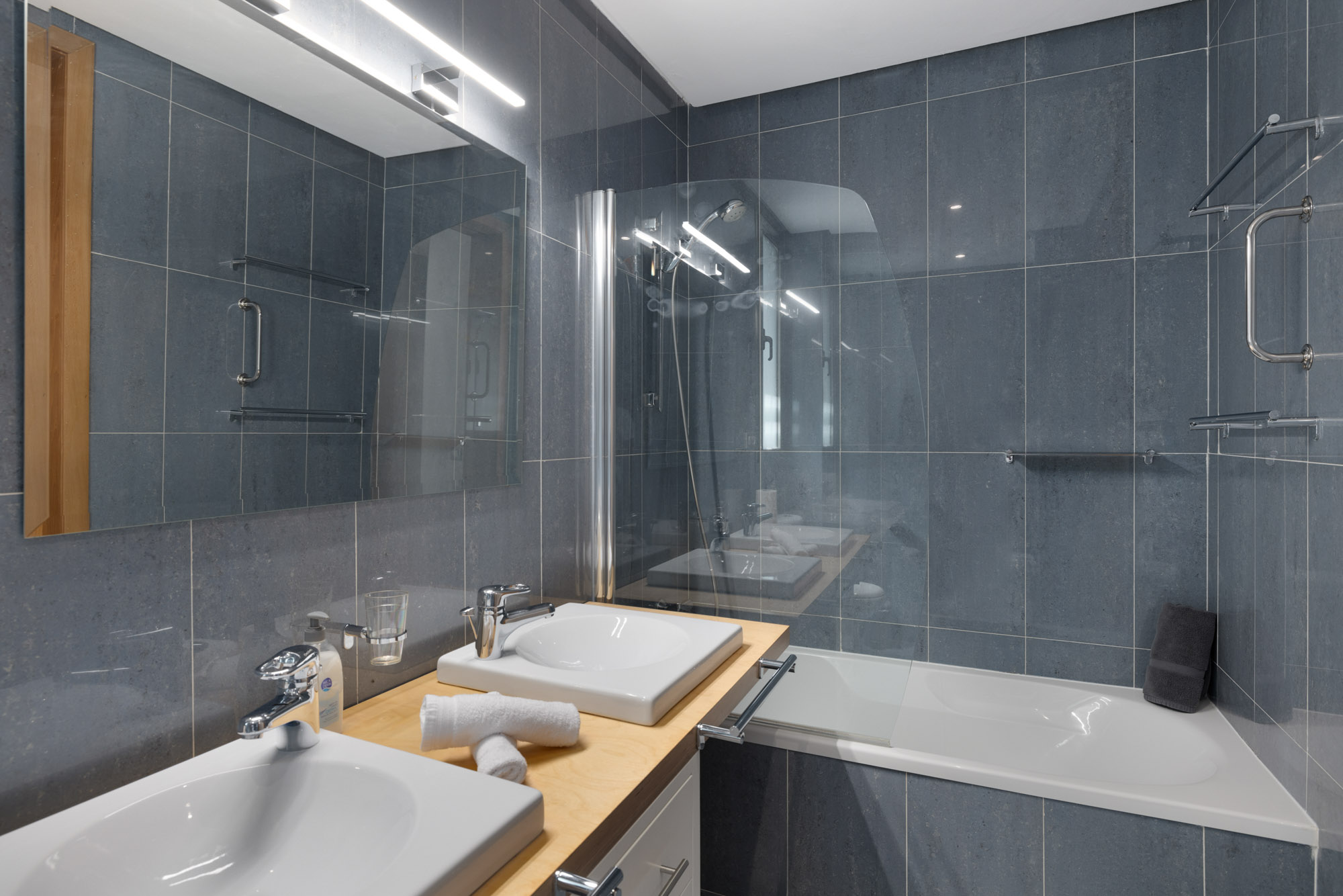 Seating is provided in the form of two large sofas is upholstered in grey fabric, facing a TV in a modern unit with stylish up lighting.