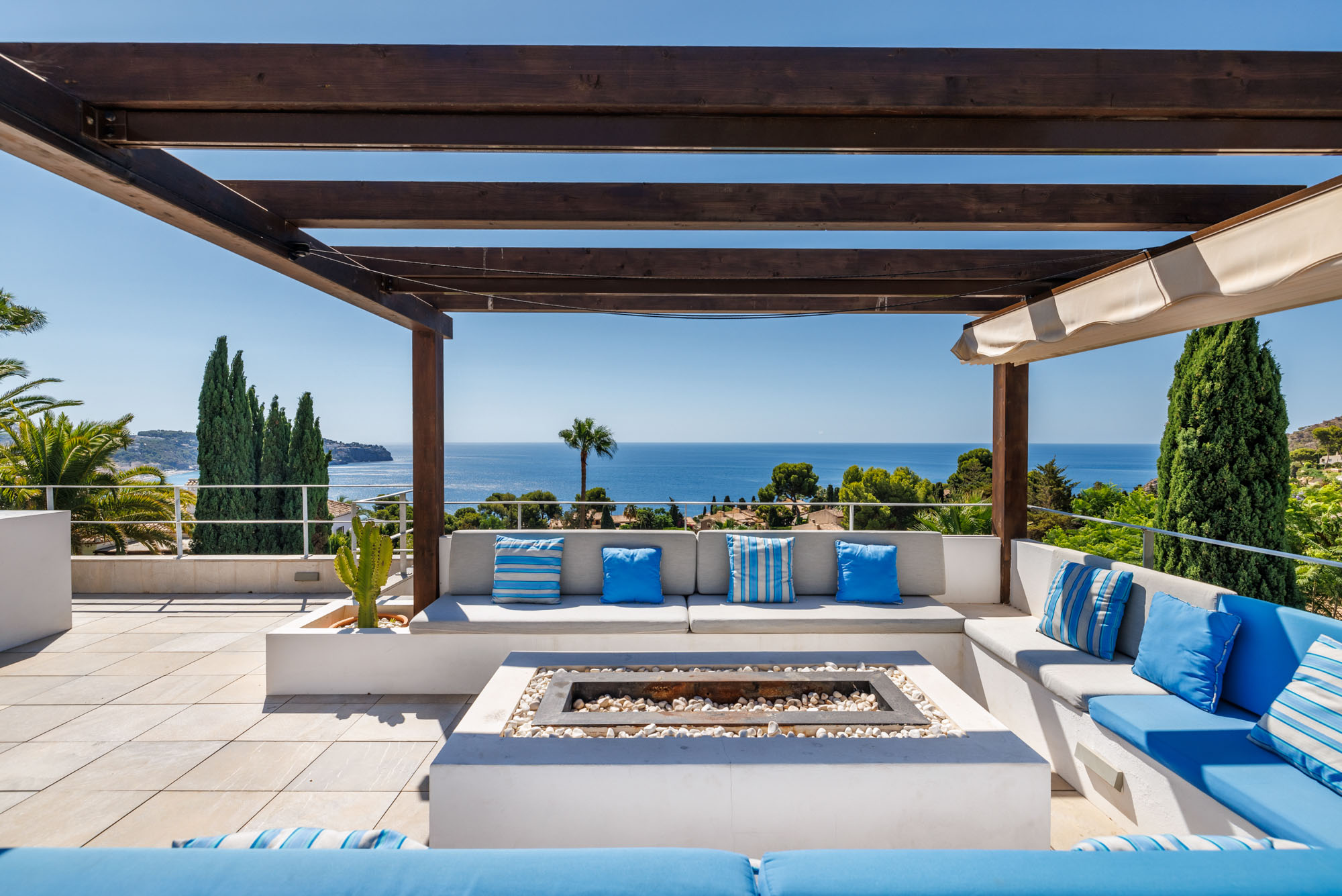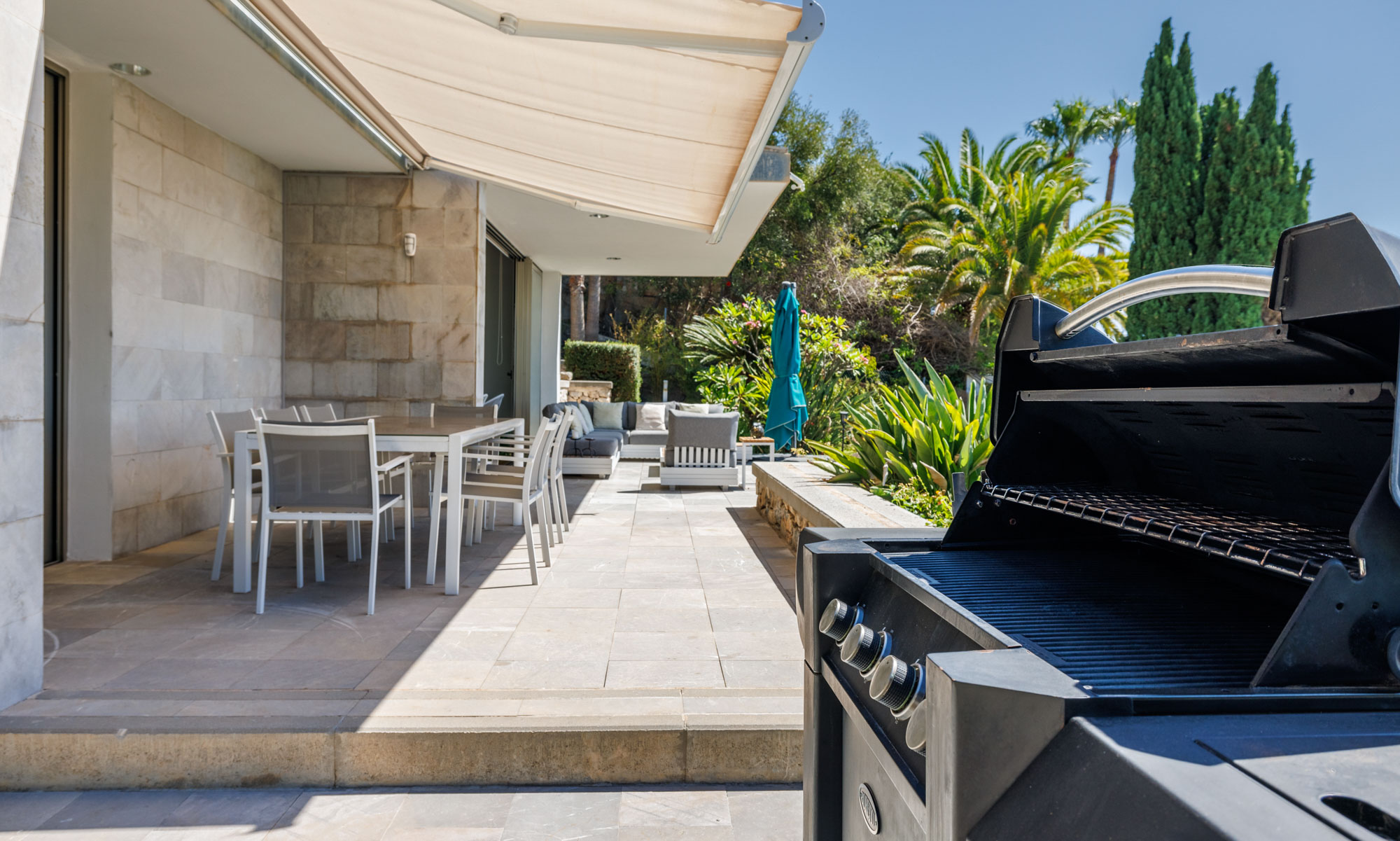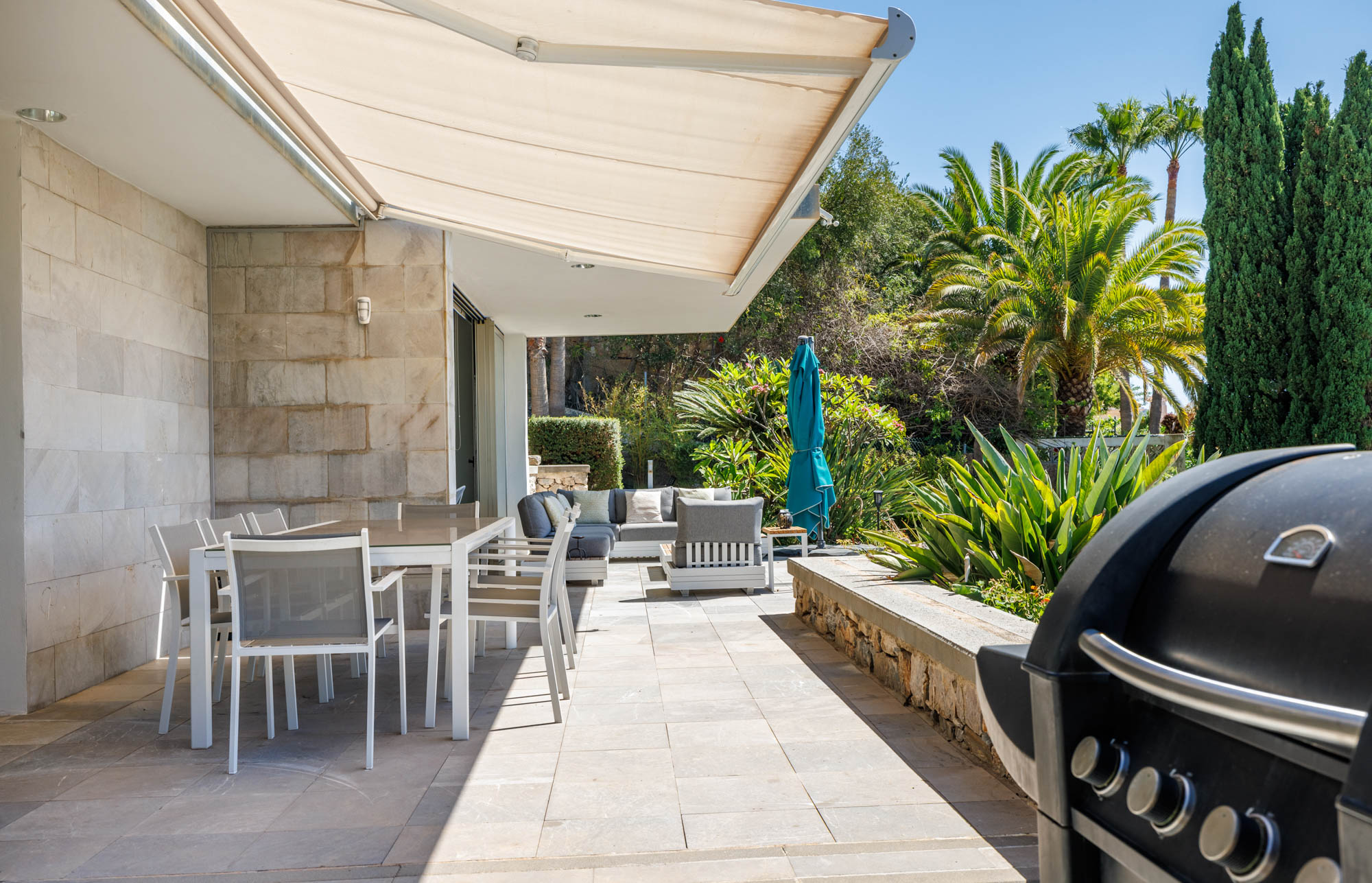The terrace also features a seating area with extractable overhead awning to provide shade in the summer months.