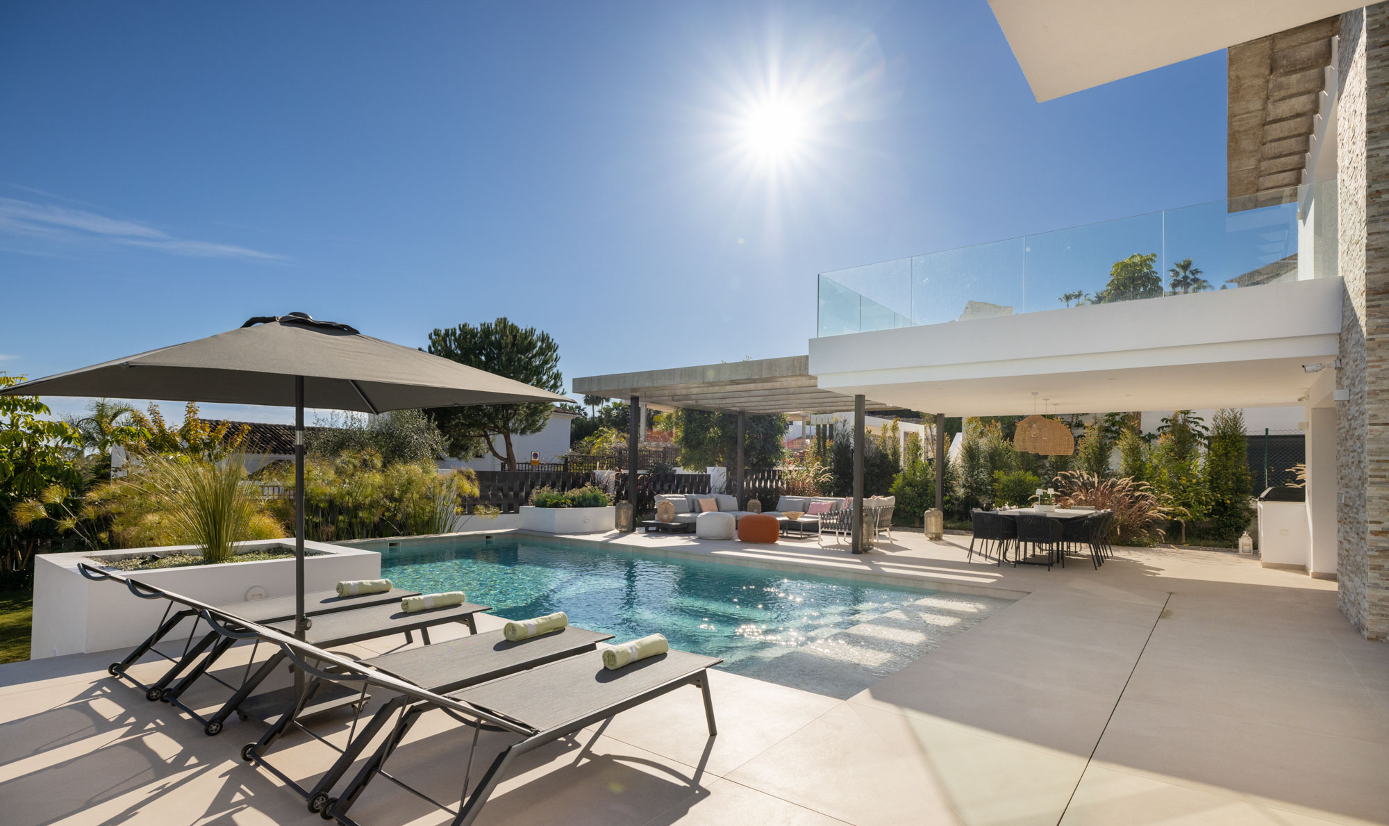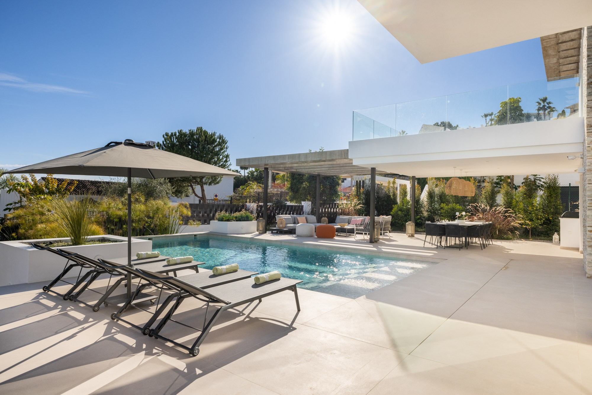 - Outdoor dining terrace with 3.2m calcatta ceramic table seating 12 guests, gas BBQ and paella cooker