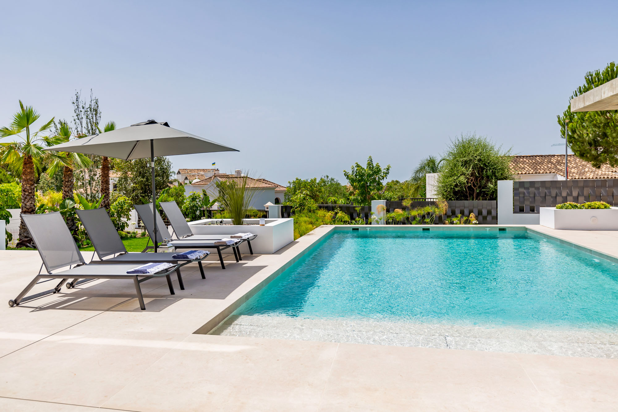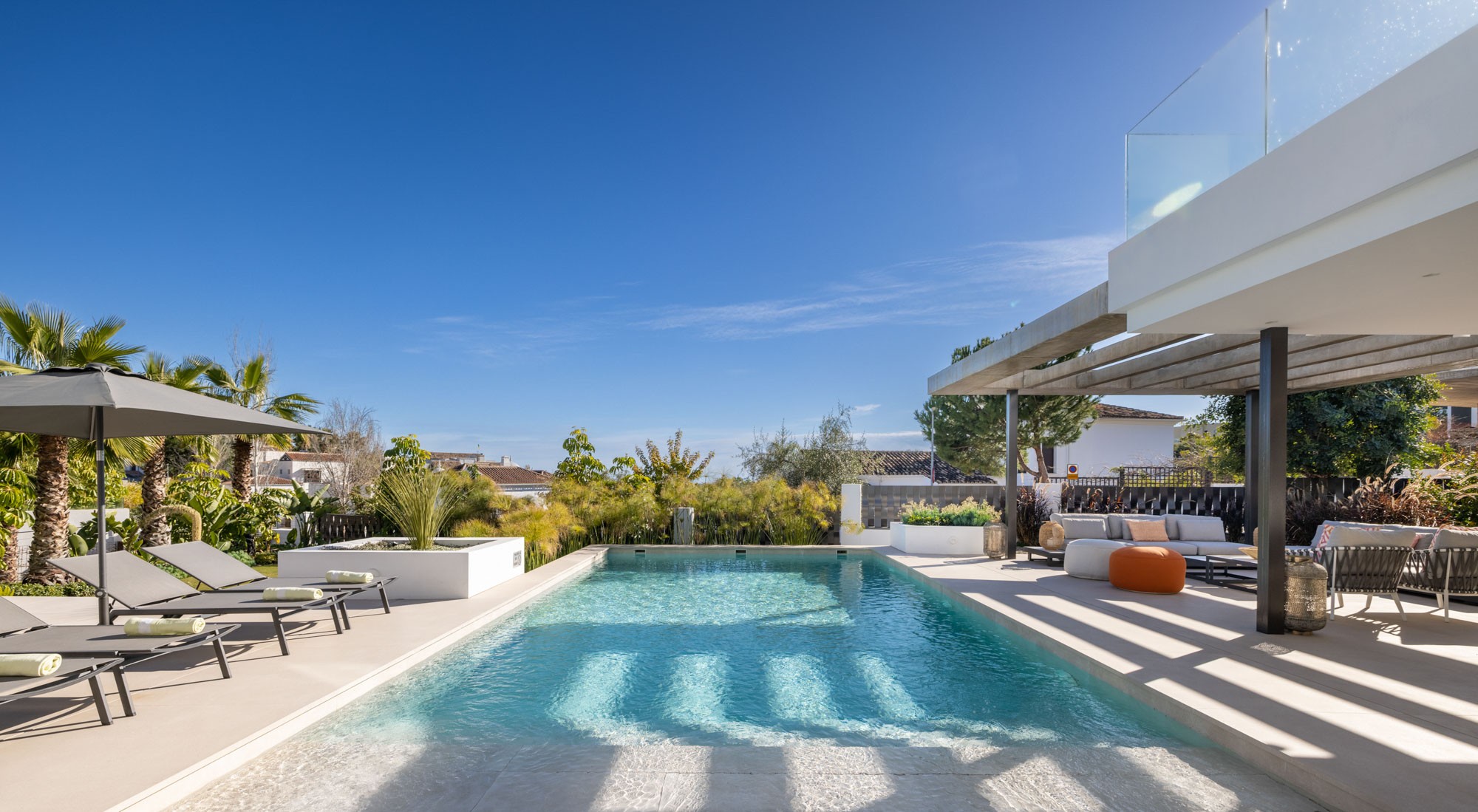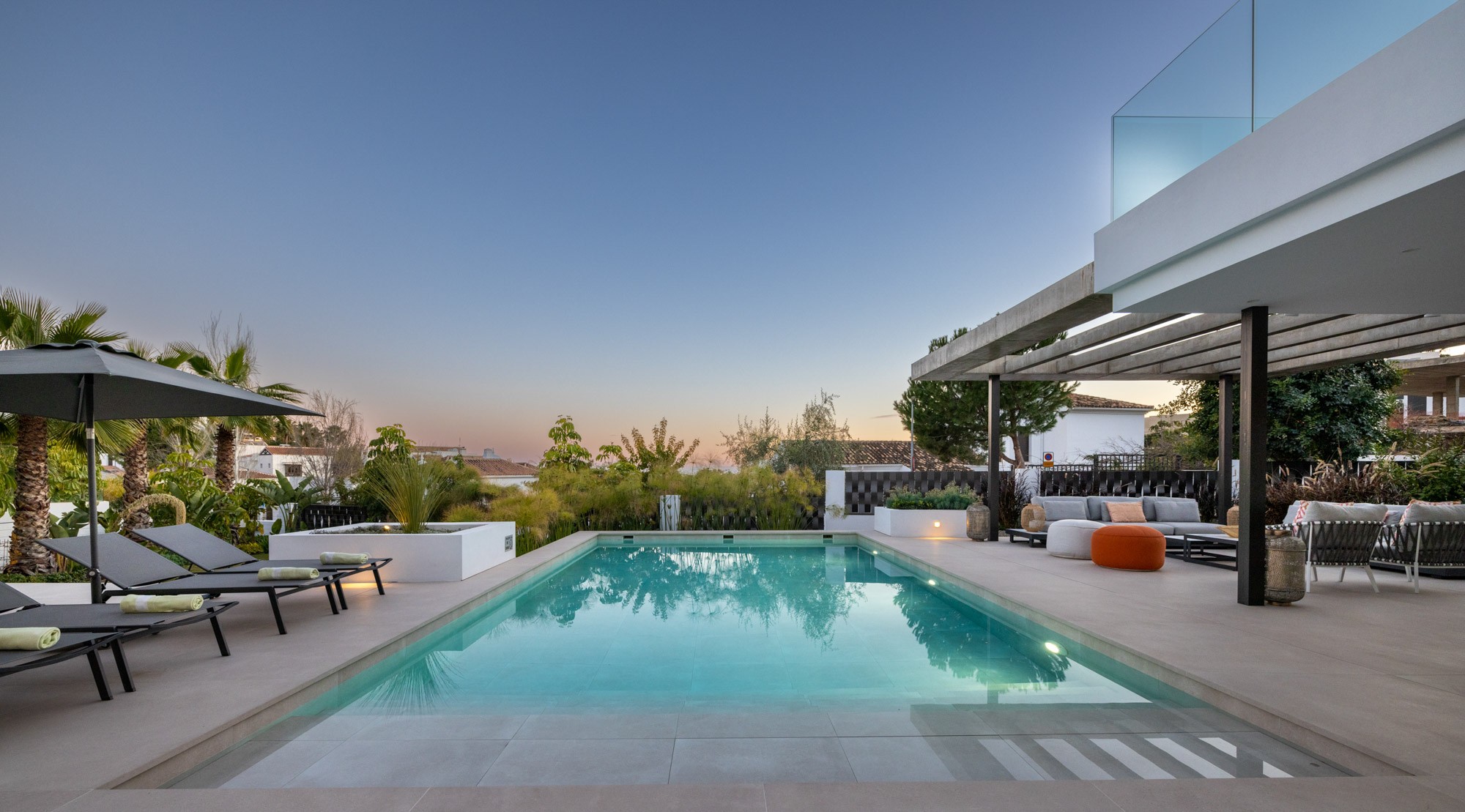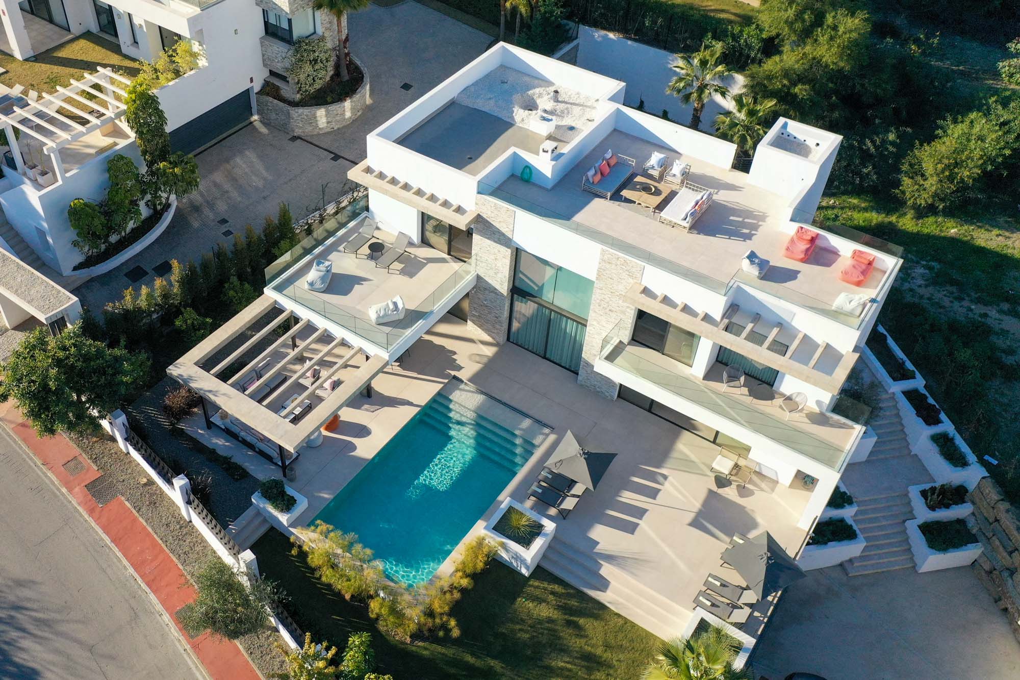 Additional living space is located outdoors on the terraces by the pool and on the huge roof terrace where you can relax watching the sunset with friends and family.