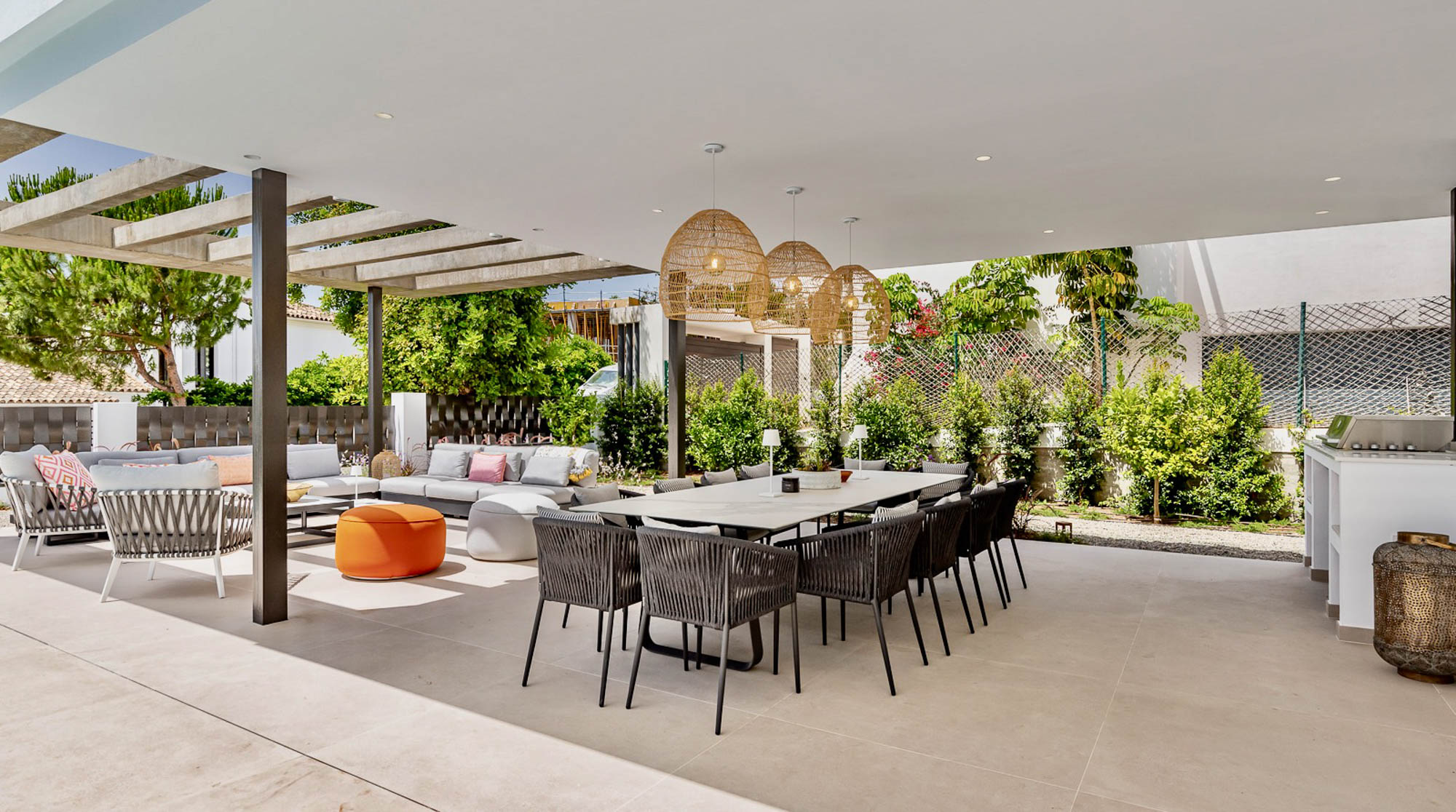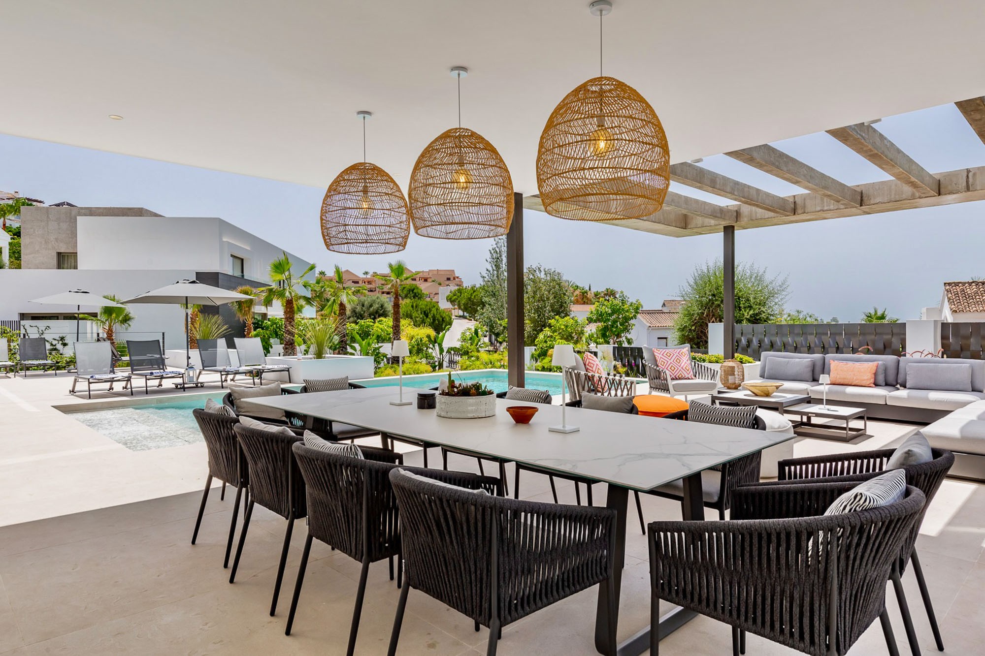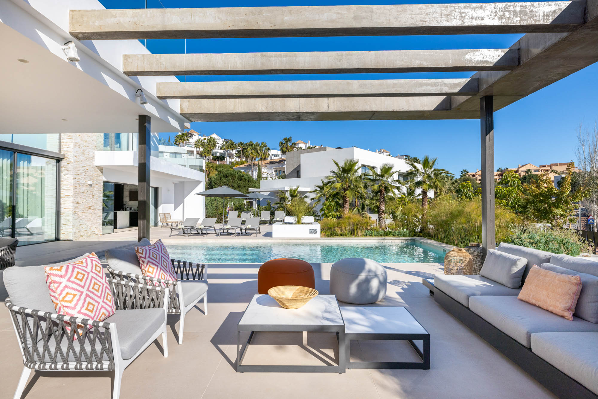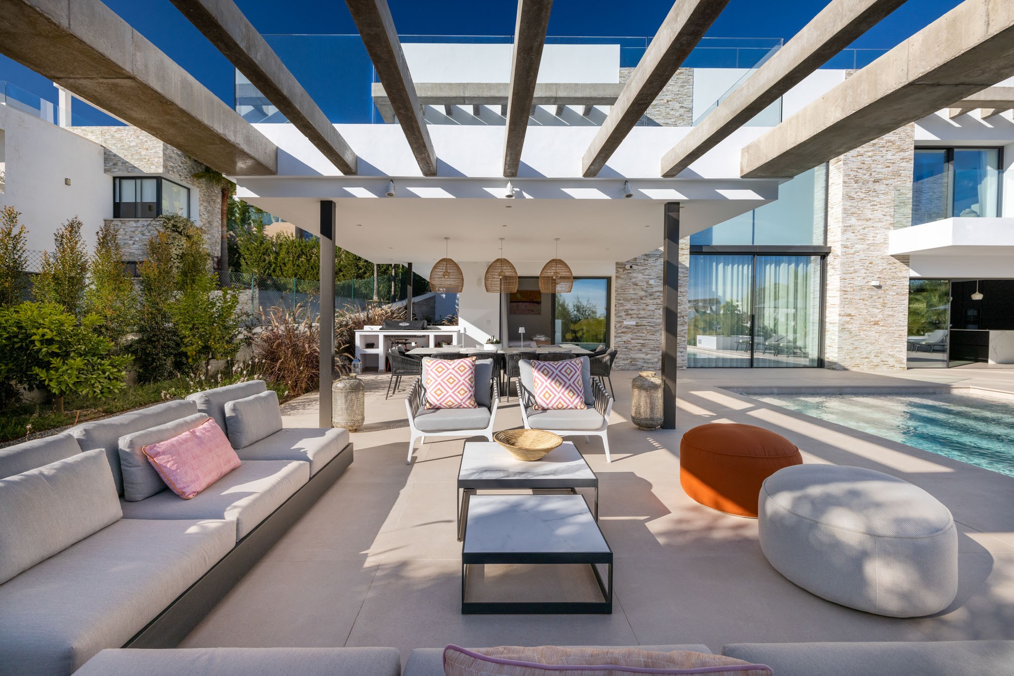 - Pergola-covered outdoor lounge area with seating for 10-12