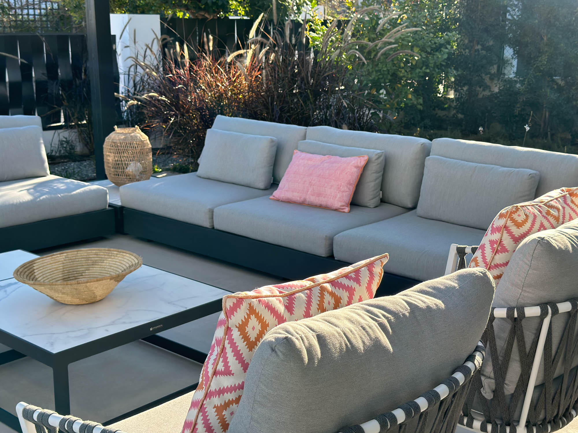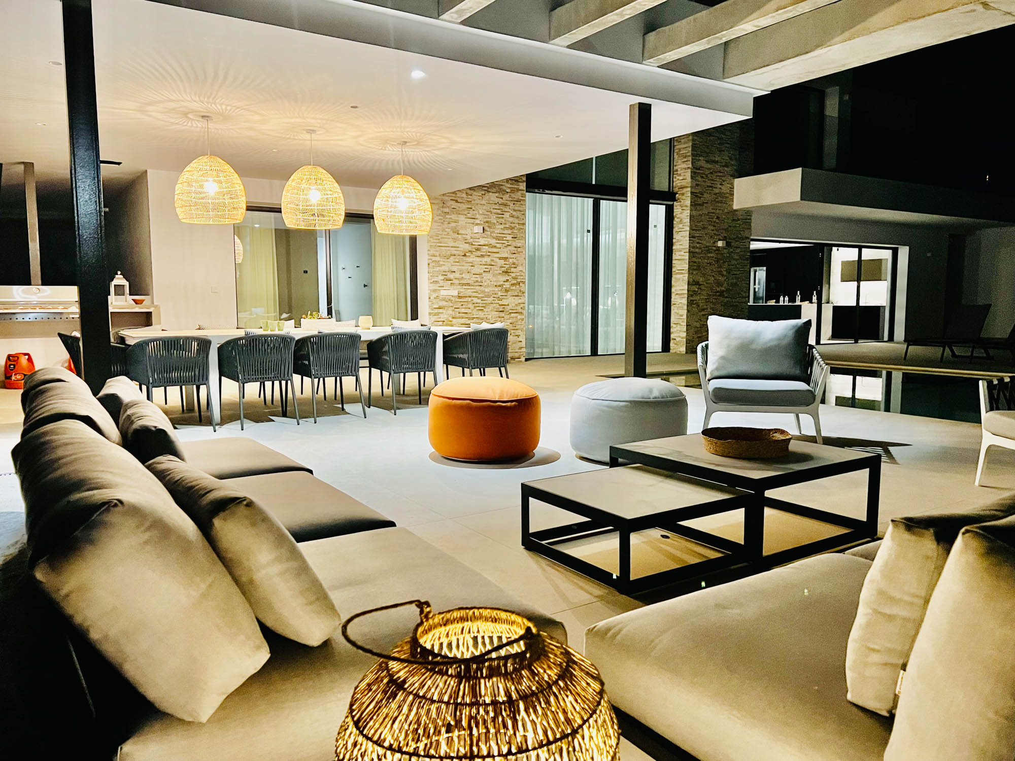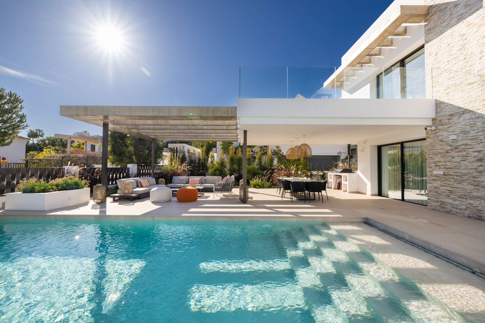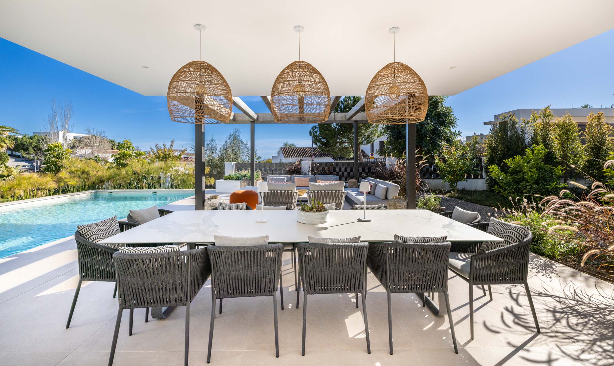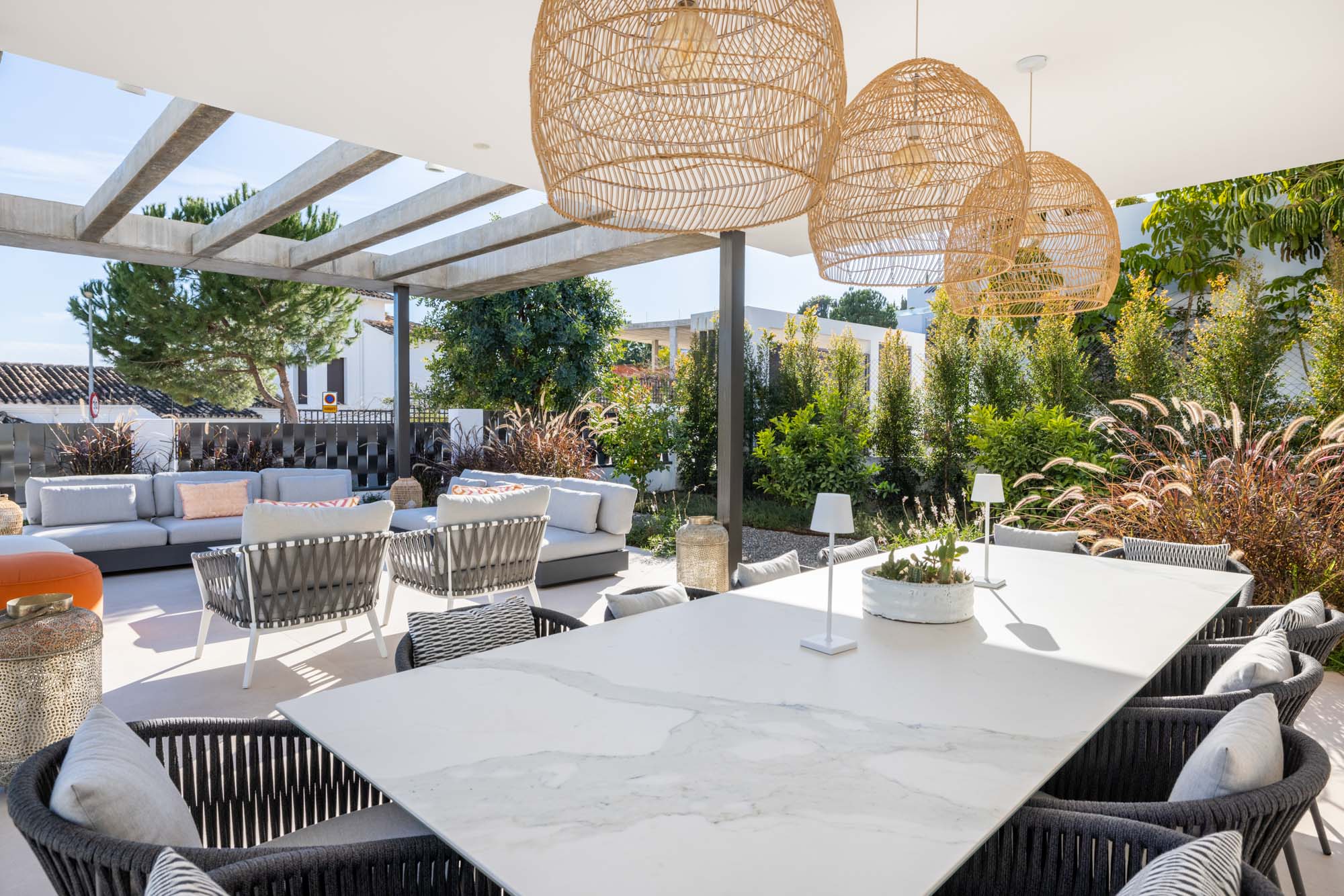 - Pergola-covered outdoor lounge area with seating for 10-12