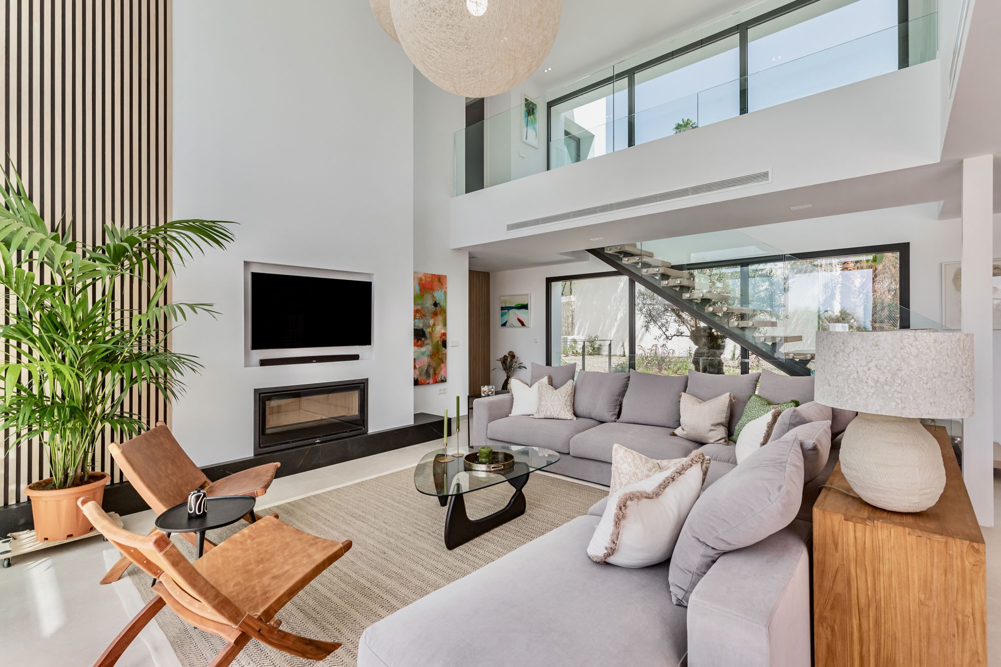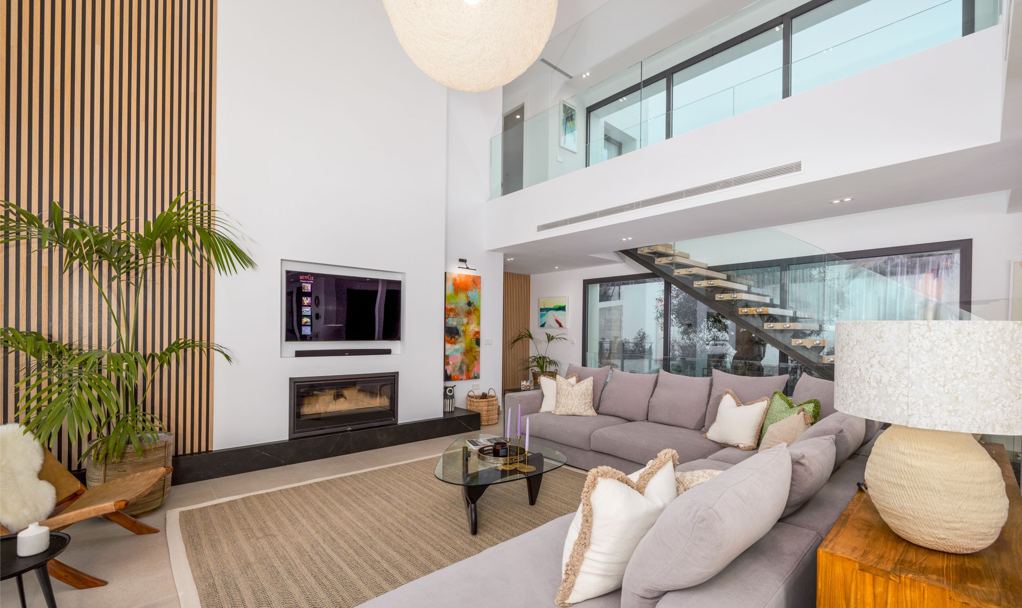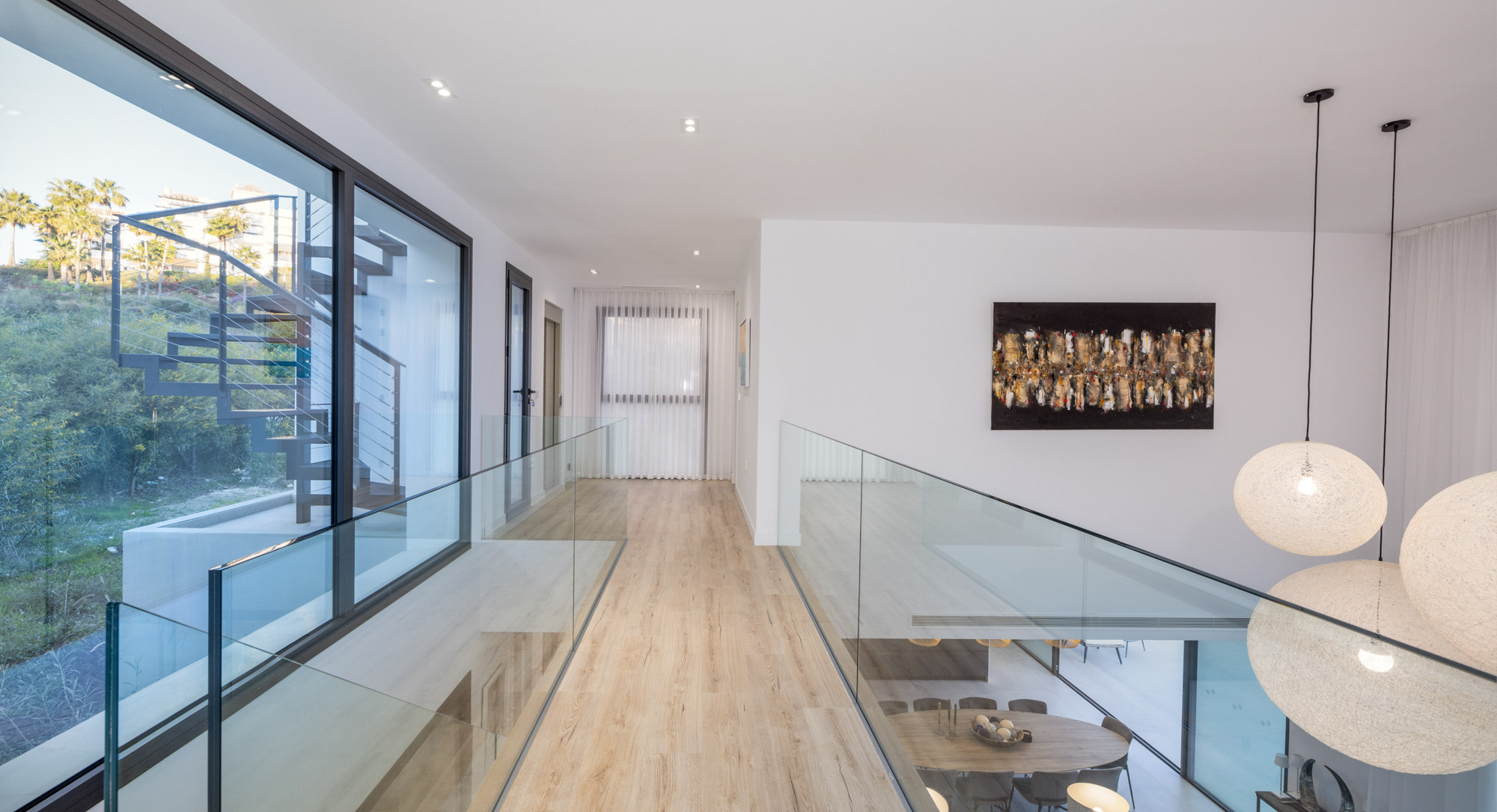 On the main floor is an open plan living – dining and kitchen space which perfectly blends with the outdoor terrace and the double-height ceiling in the living room adds to its luminosity.