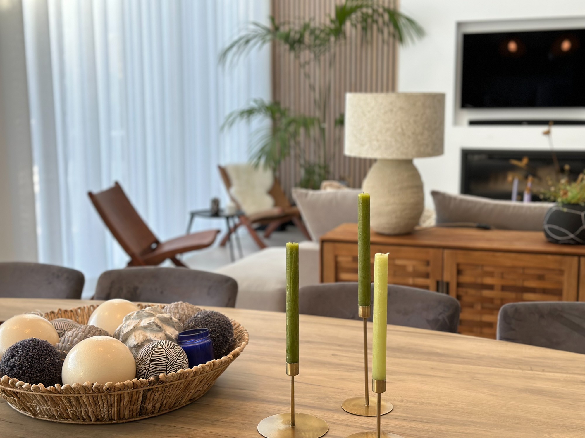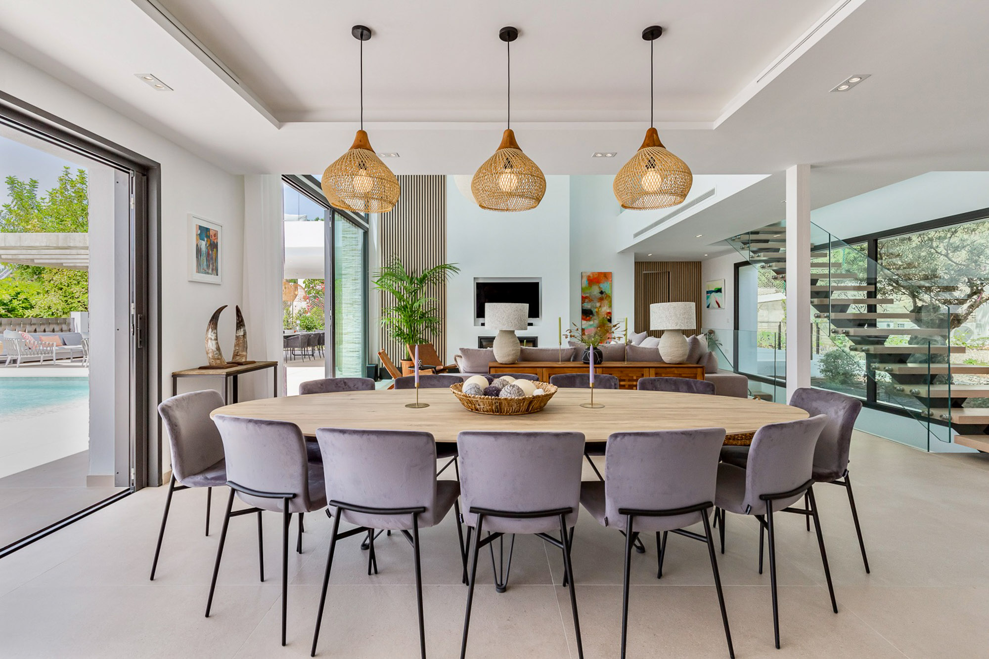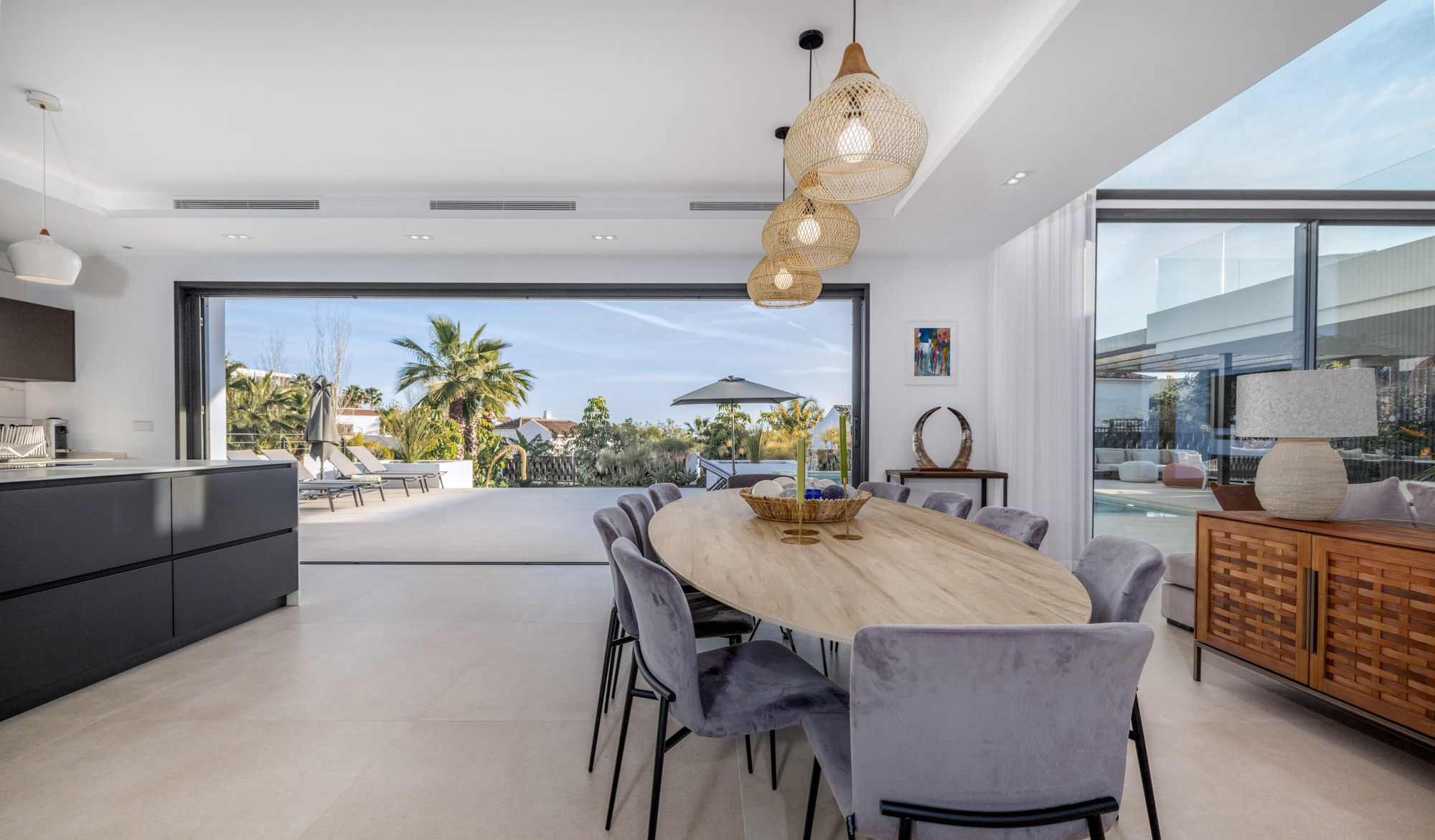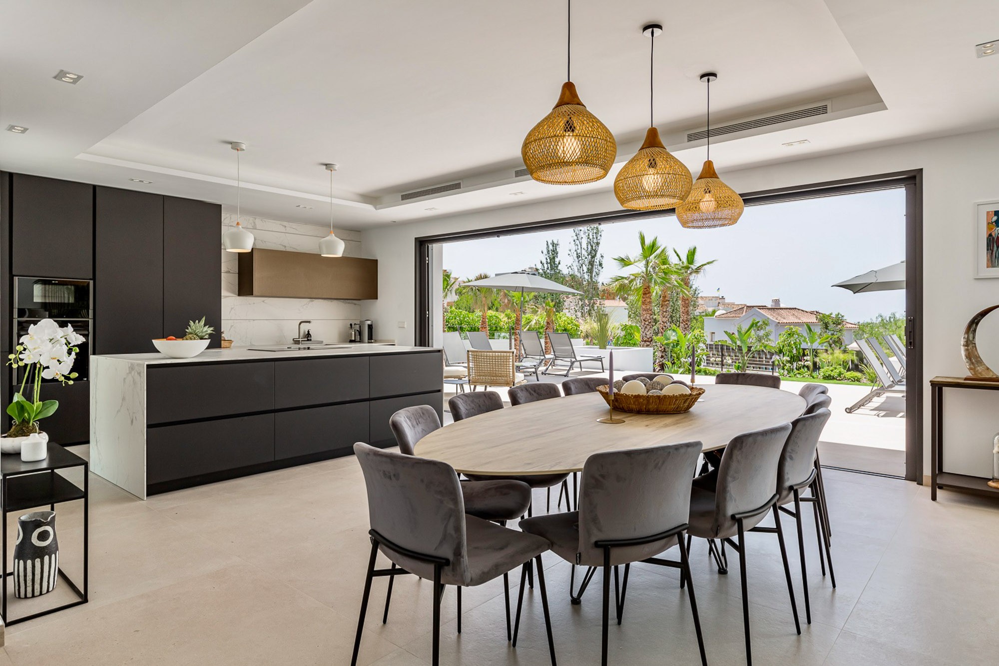 Inside or outside? You choose where to dine. There is a 12-seater dining table indoors and a 12-seater dining table on the outdoor terrace. And when you open up the terrace doors, your living and dining spaces become one.