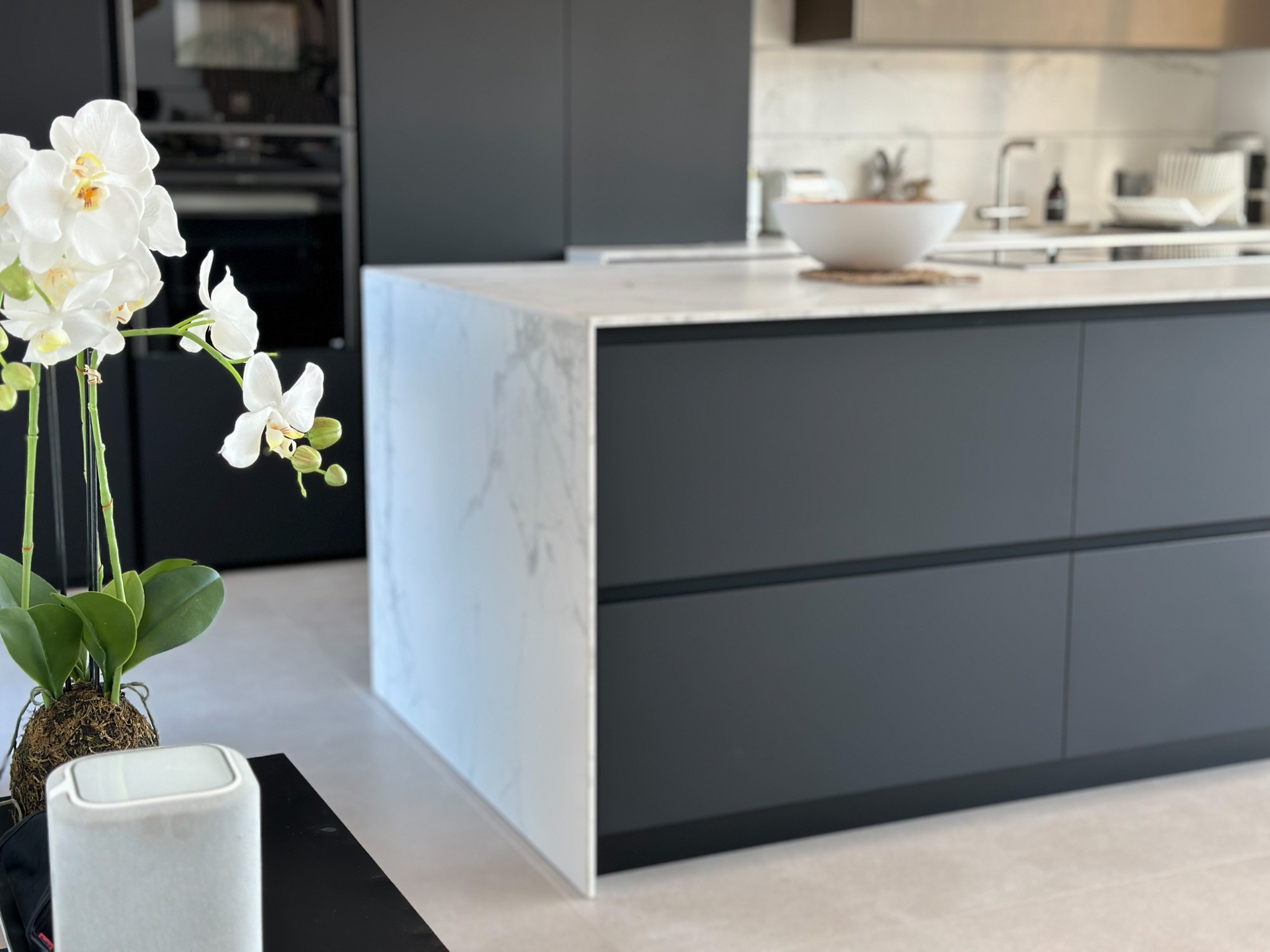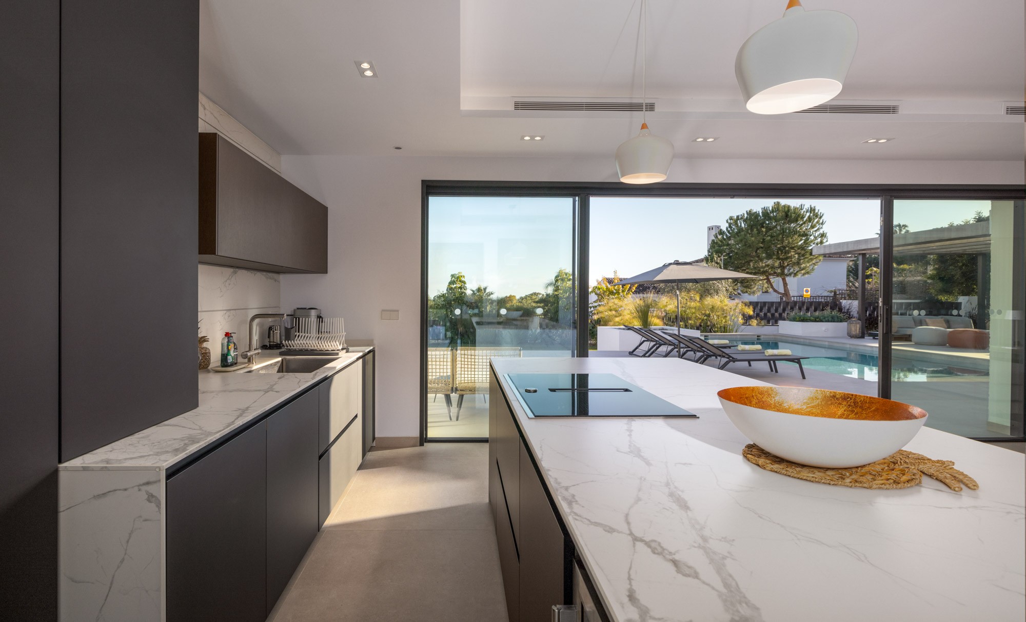 The villa’s Italian Modulnova kitchen is sleek and modern with a central island where you can prepare meals whilst conversing with friends and family.