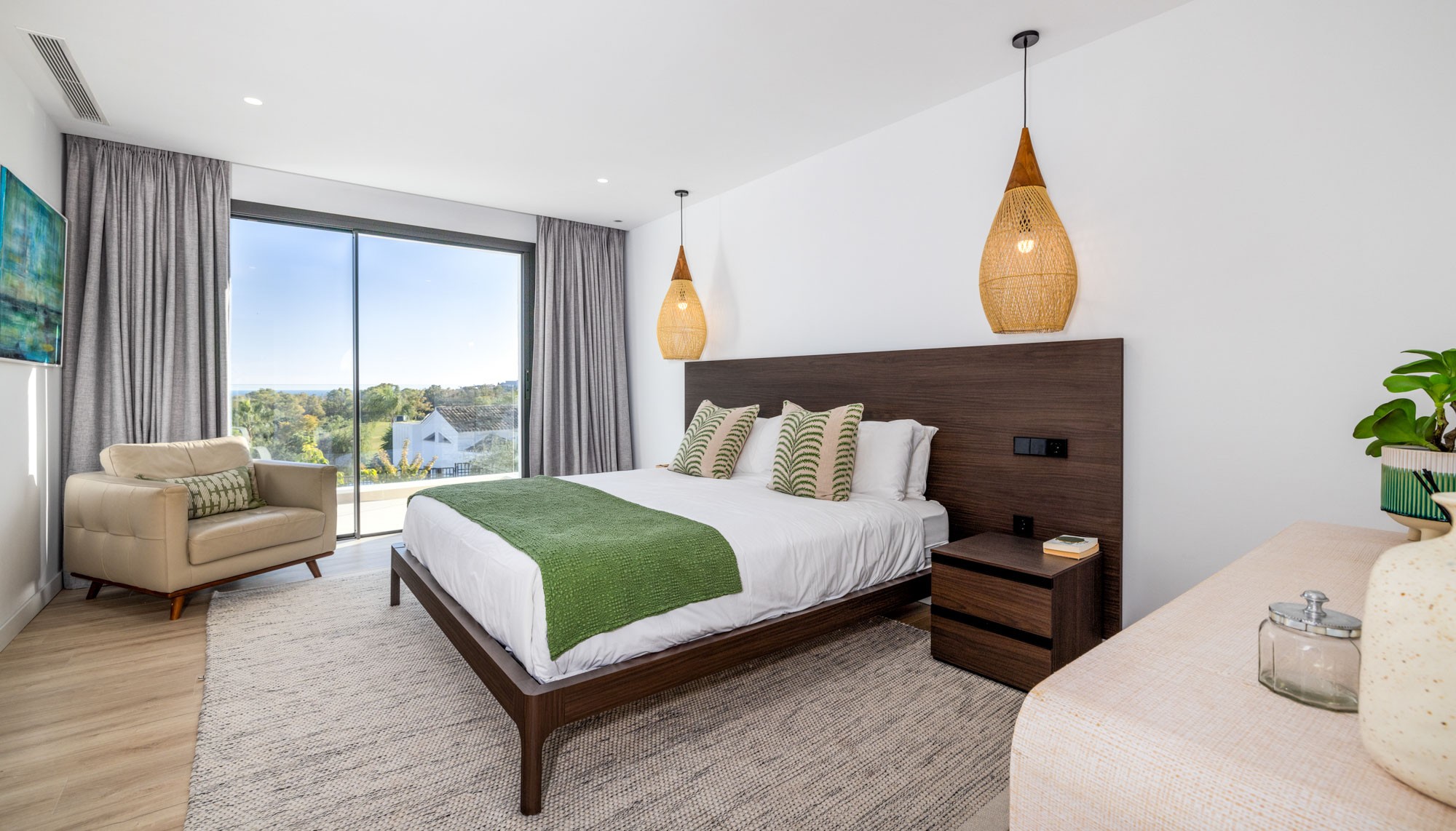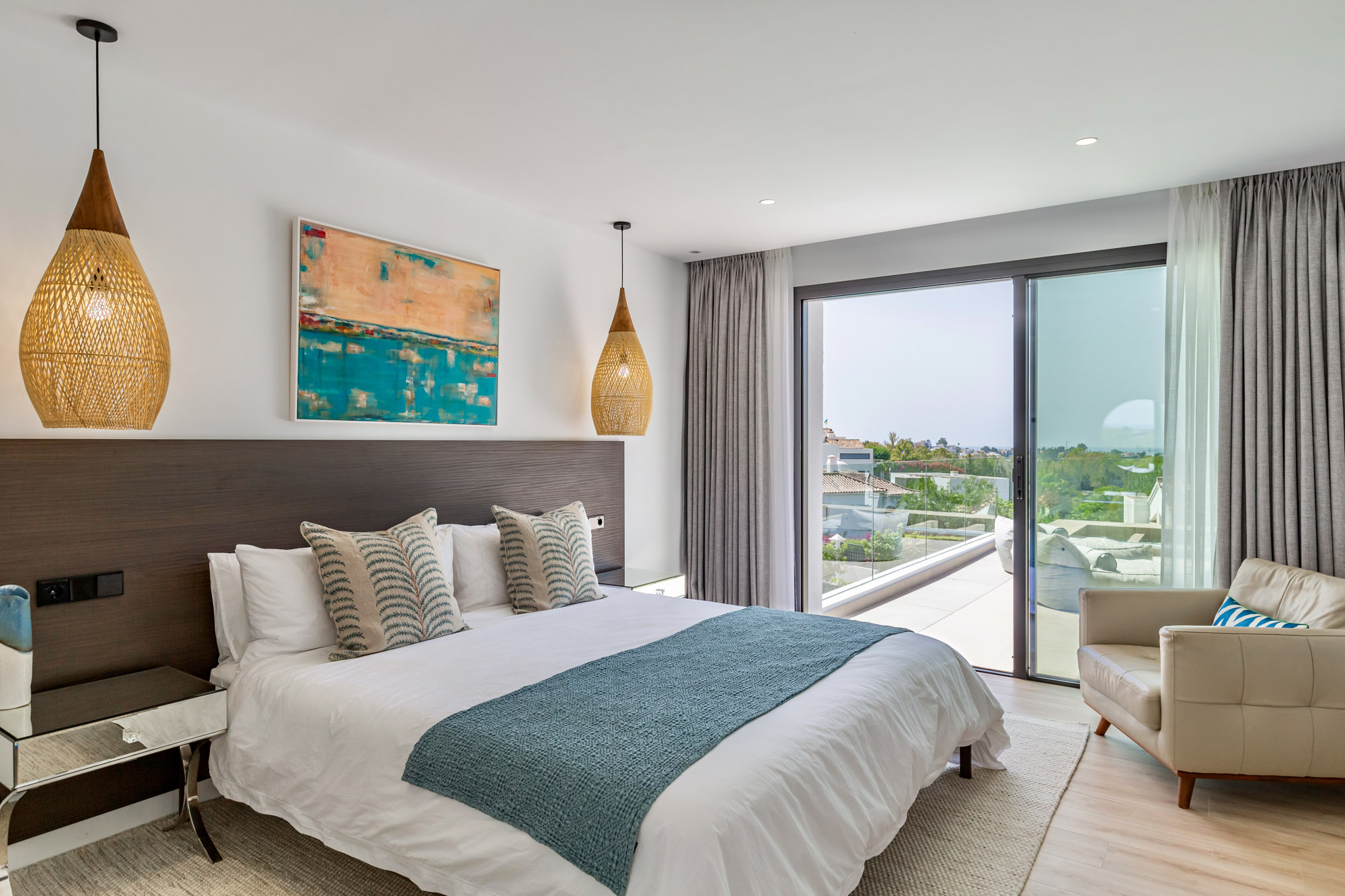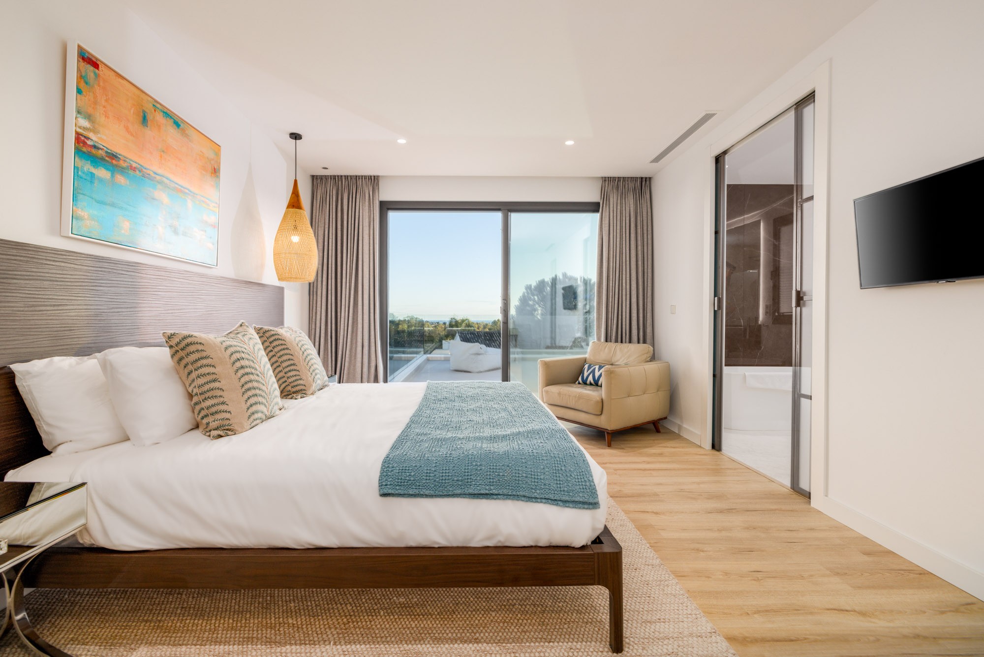 Principal Bedroom 1: Situated on the first floor and furnished with a super king-size bed (180 cm), Smart TV, leather armchair, and with access to a private terrace with golf and sea views and furnished with two outdoor chairs, two sun loungers and small coffee table.
