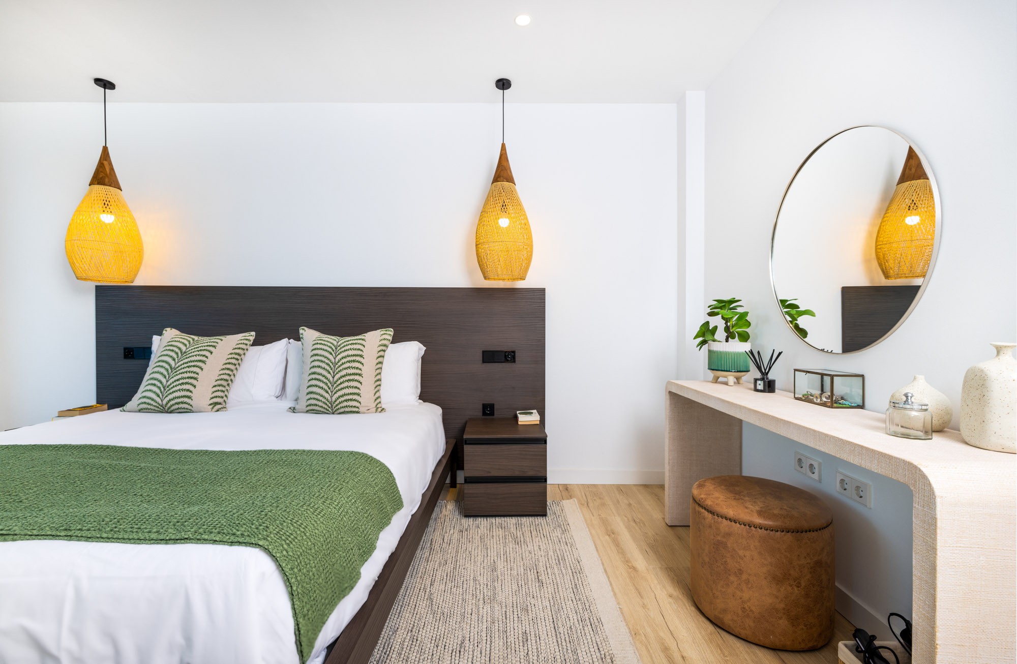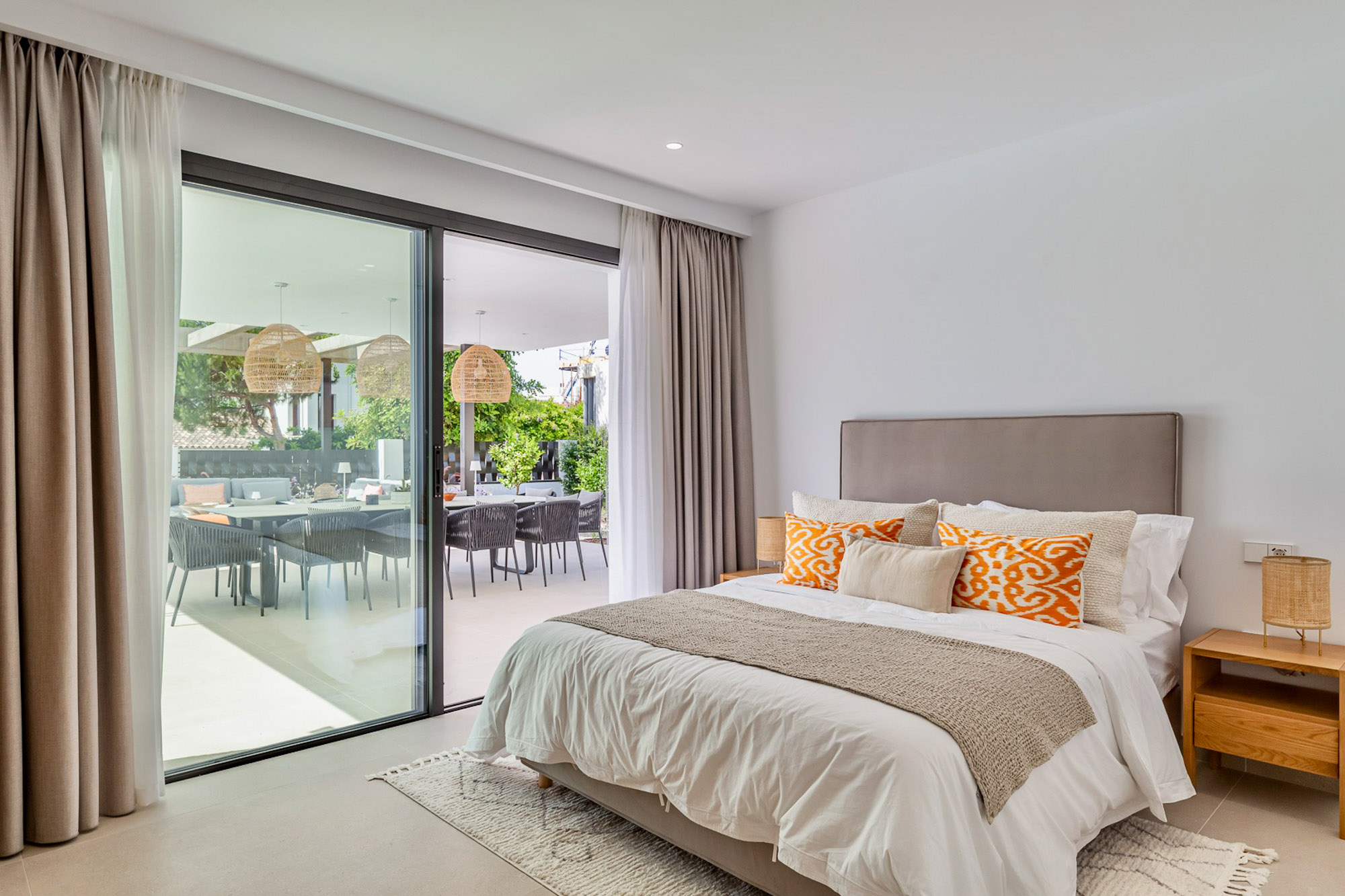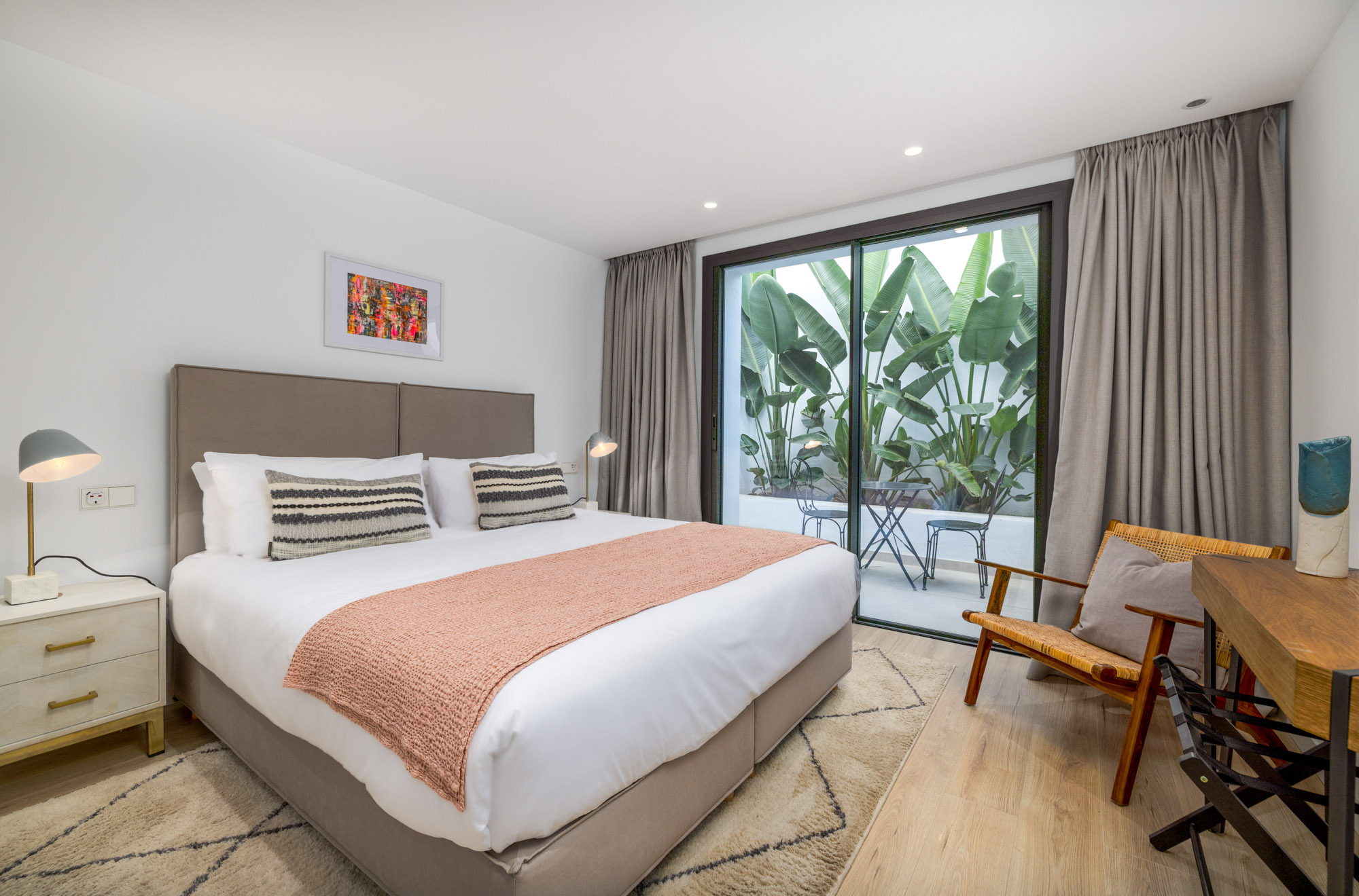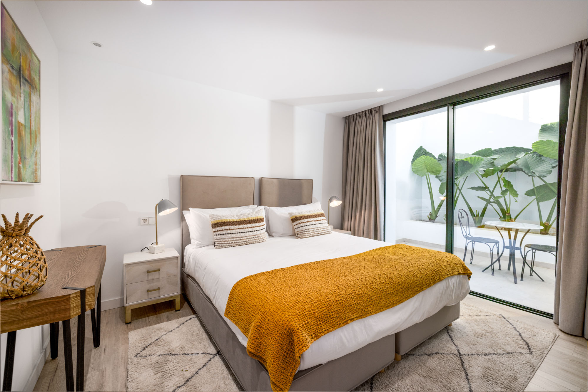 Guest Bedroom 5: Situated on the lower level and furnished with a zip and link super king-size bed (180 cm) which can be converted into two single beds. This bedroom has access to a cute terrace with calming green frond plants and a small table with two chairs.
