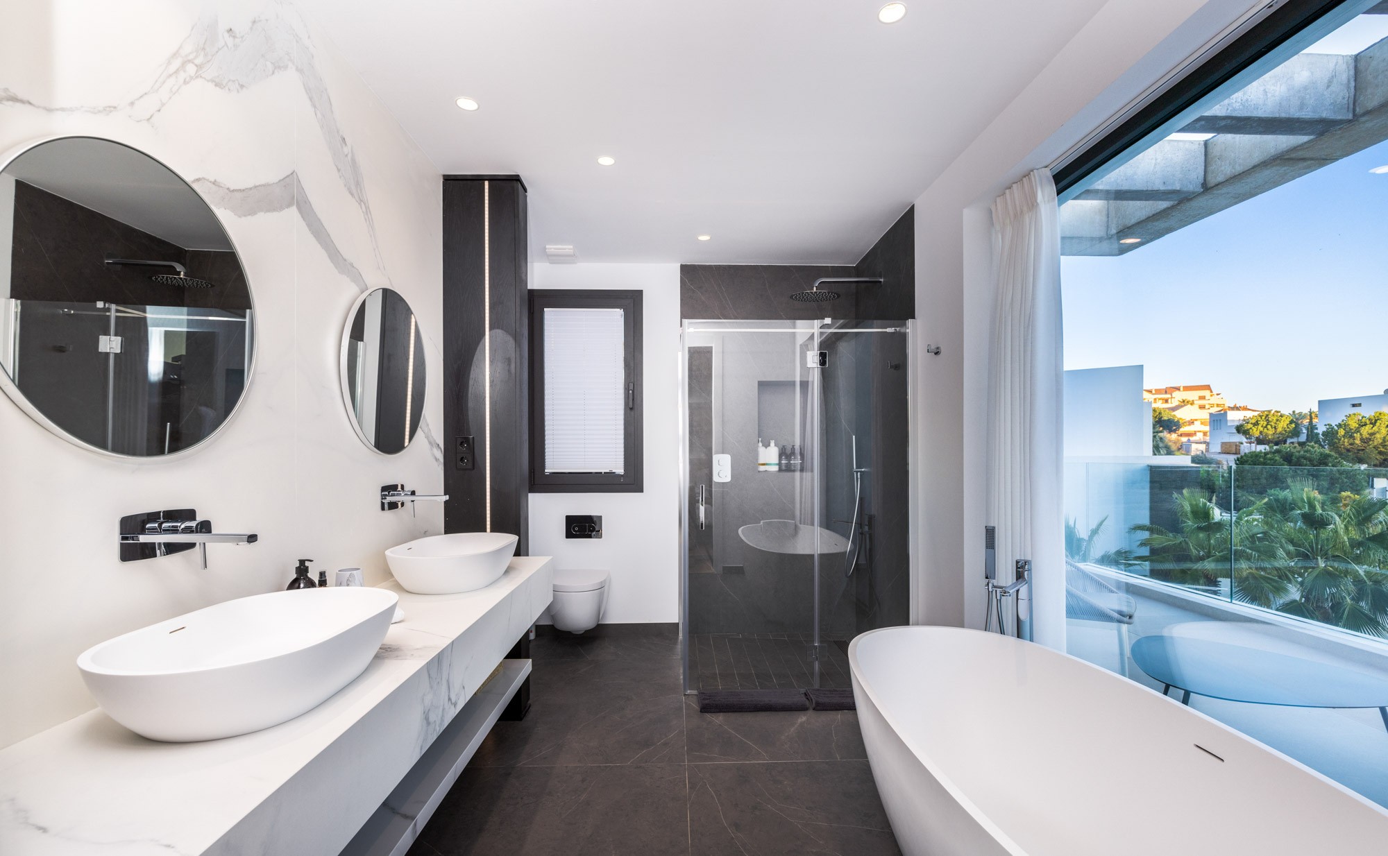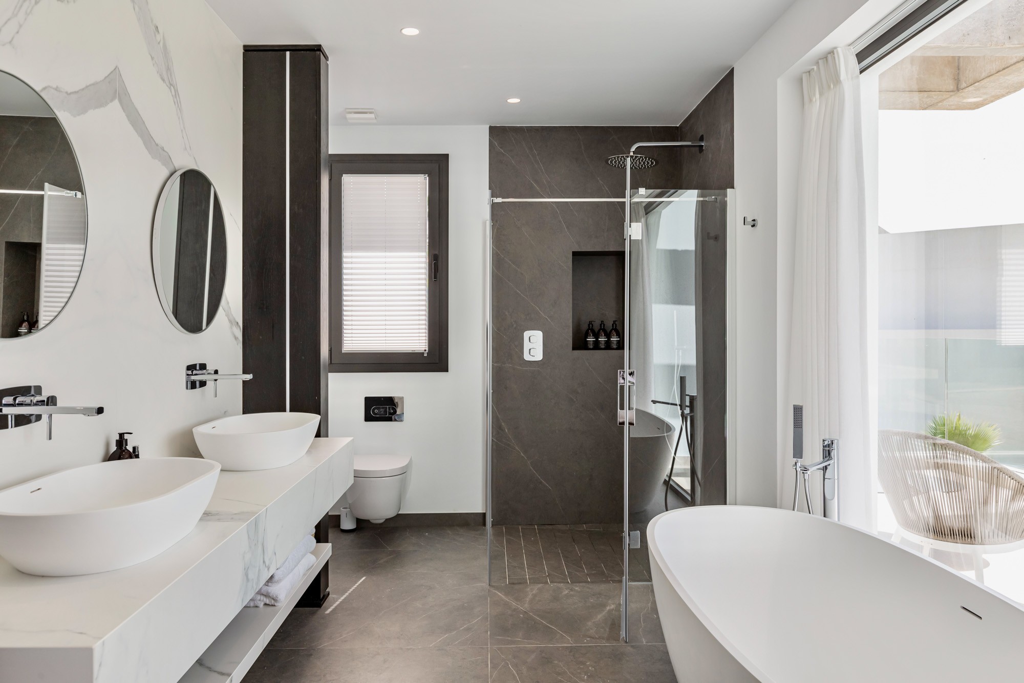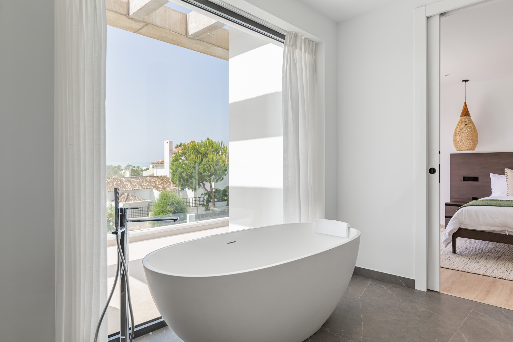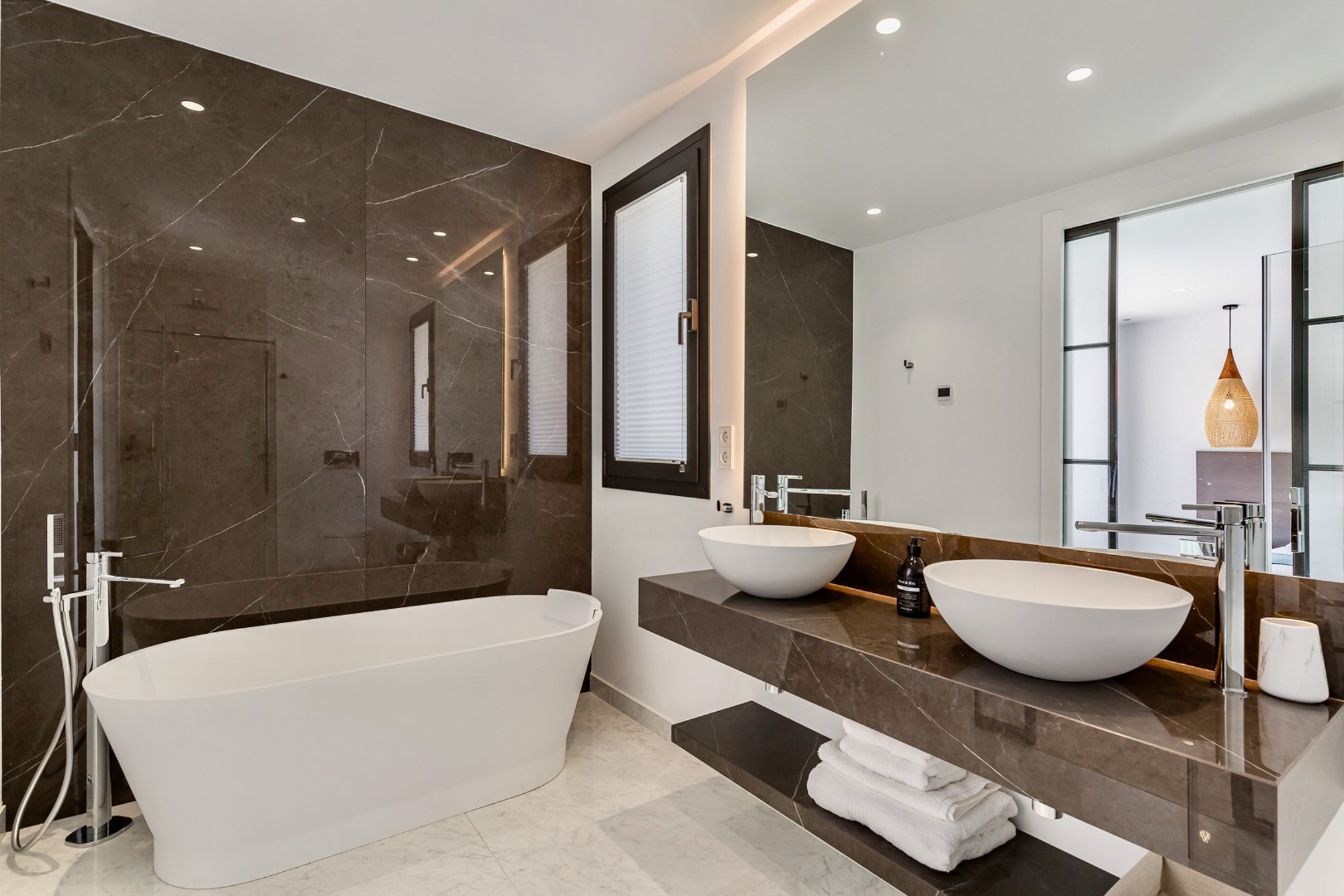 The en-suite bathroom is equipped with a walk-in shower and a freestanding bathtub which sits in front of a glass wall where you can soak in the bath and soak up the views, double wash basins and a WC.