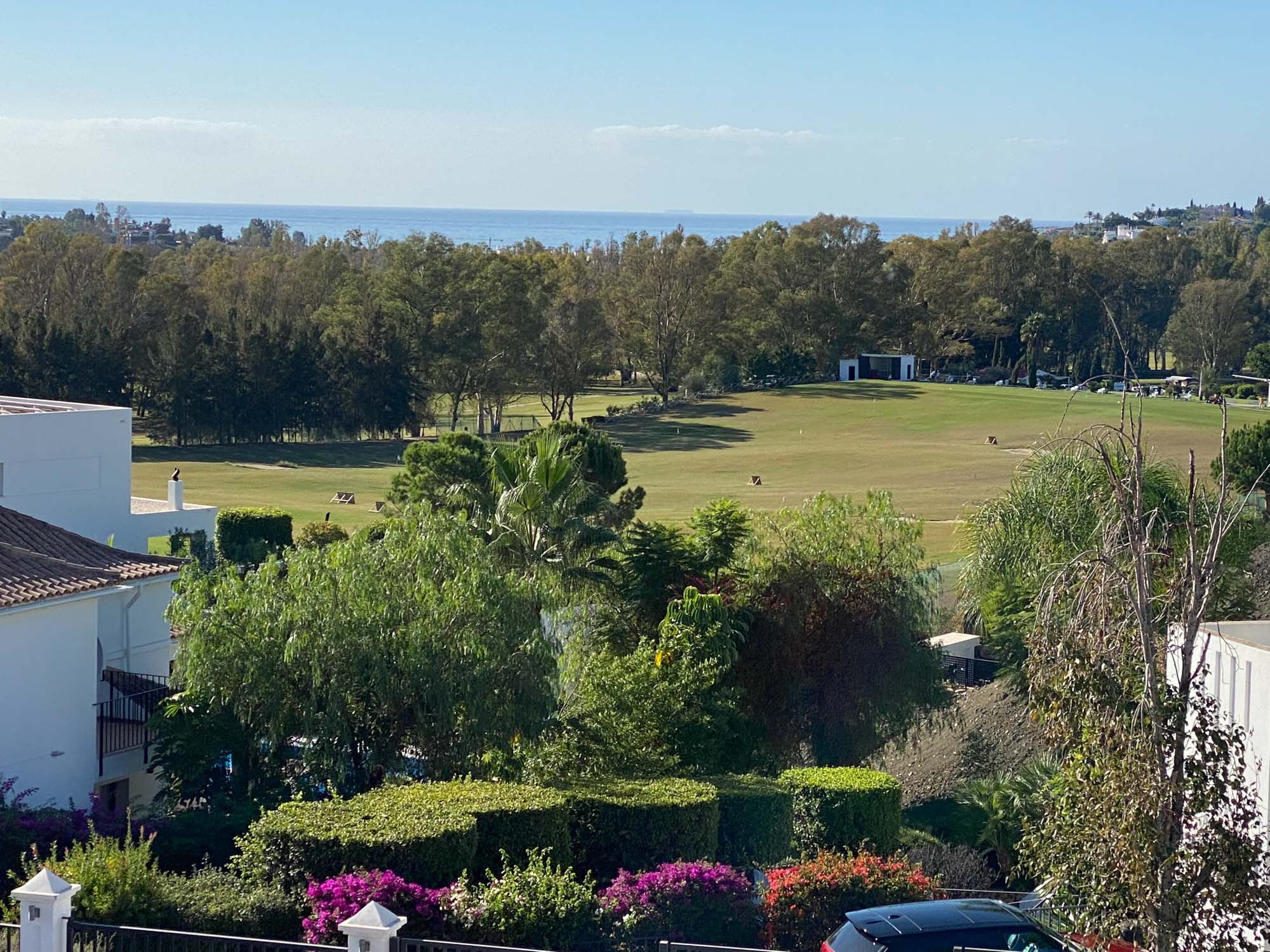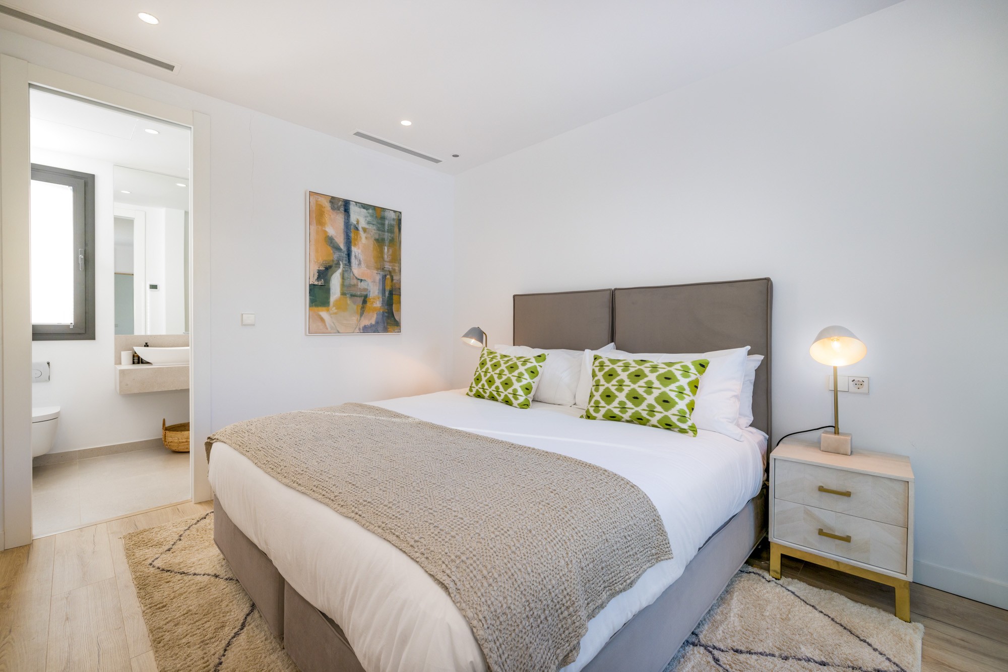 Principal Bedroom 2: Situated on the first floor and furnished with a super king-size bed (180 cm), Smart TV, a dressing room/walk-in wardrobe, and access to a private terrace with golf and sea views.