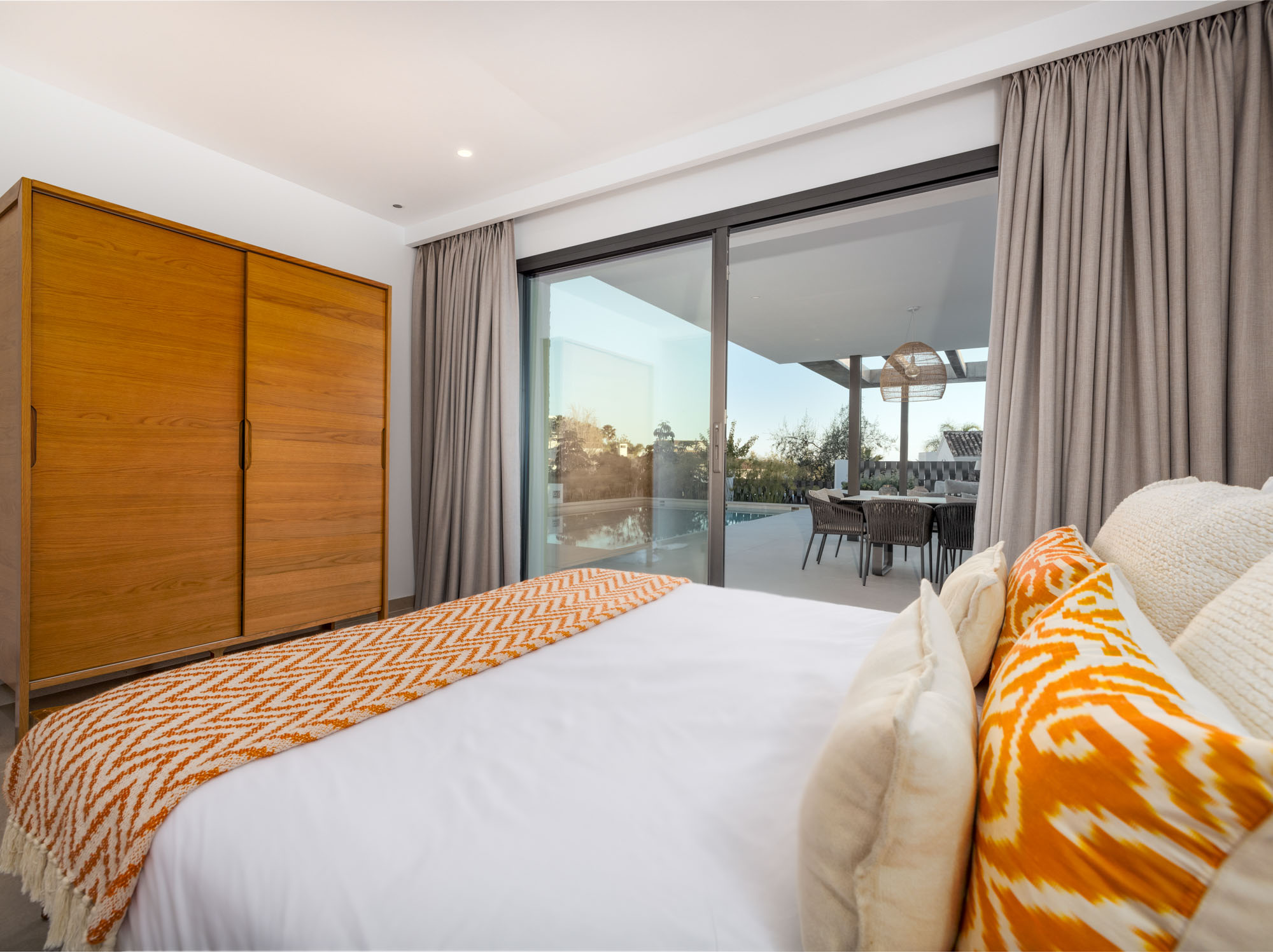 - Ground floor bedroom with flat access to the pool terrace and living spaces, plus wider door to bathroom and shower for wheelchair users