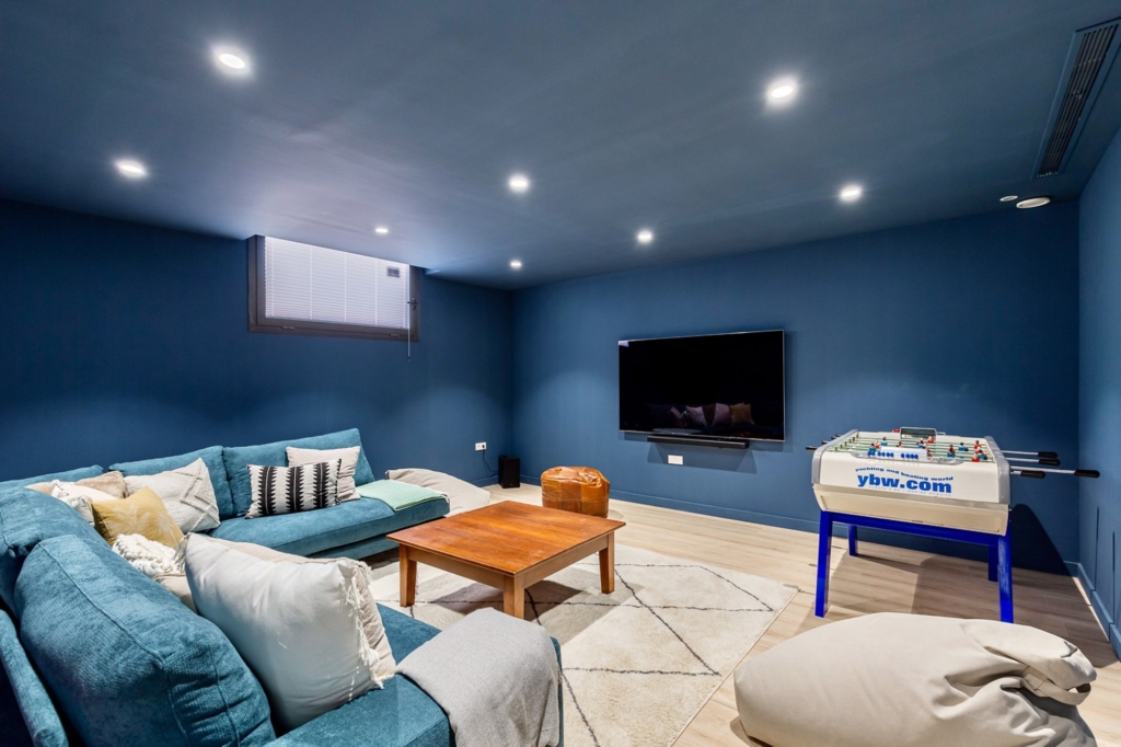 Downstairs is another family-friendly lounge area. Families can enjoy a big-screen movie on the large Smart-TV in the home cinema, or a game of table football, a workout in the gym, or a game of table tennis which is set up in the garage.