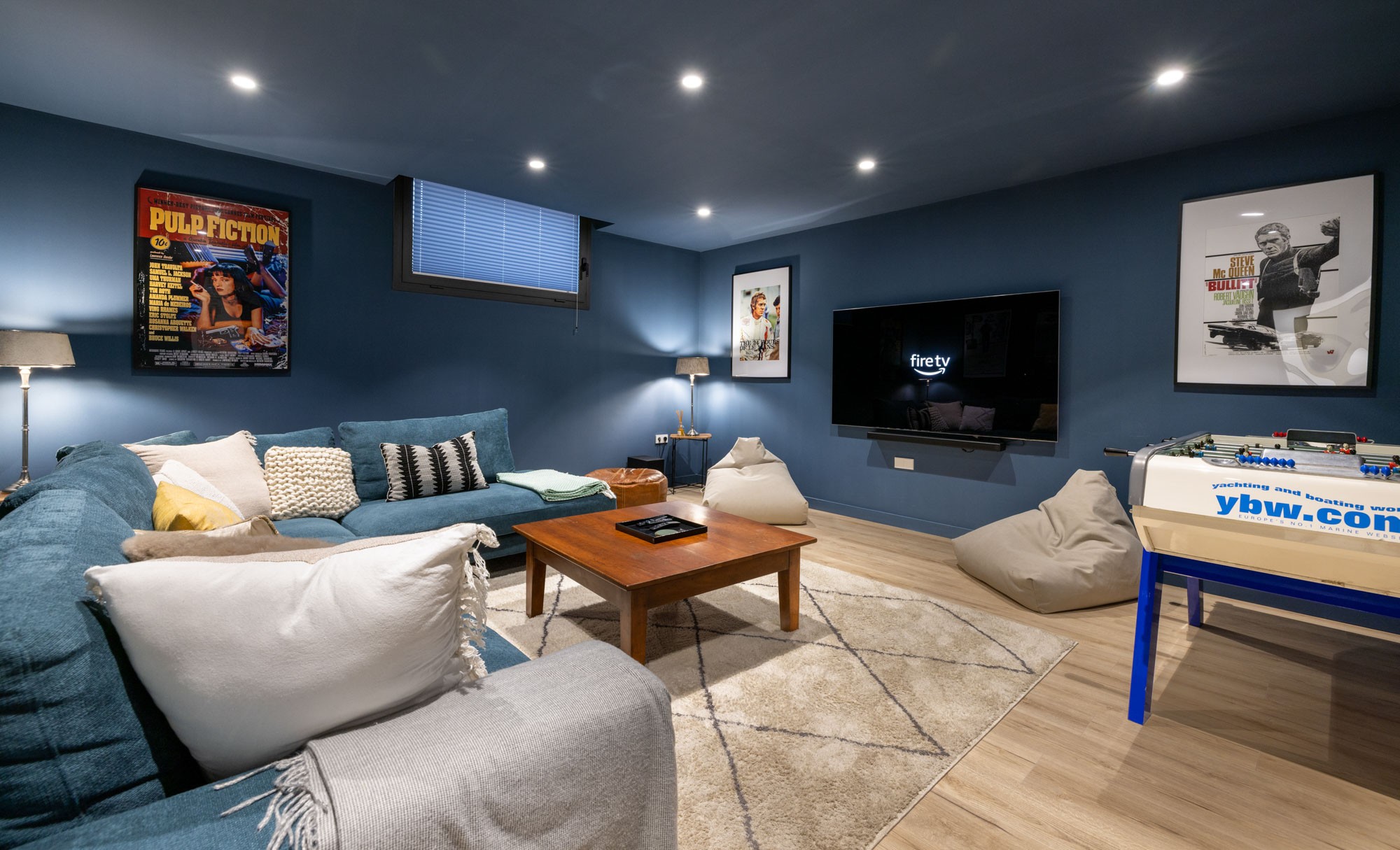 - Family cinema room with L-shaped snug sofa, 78″ NeoQLED smart TV with sound bar and table football