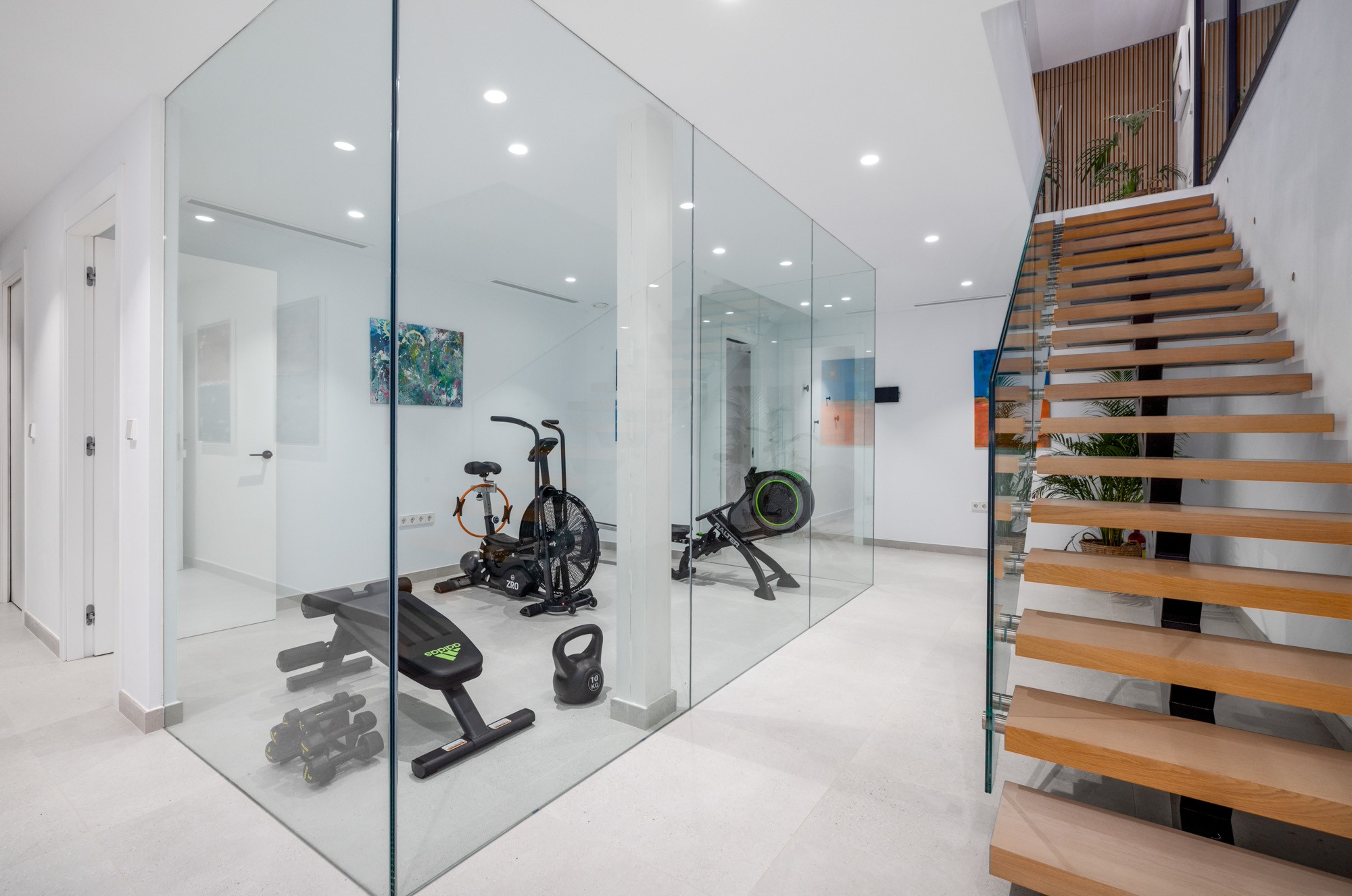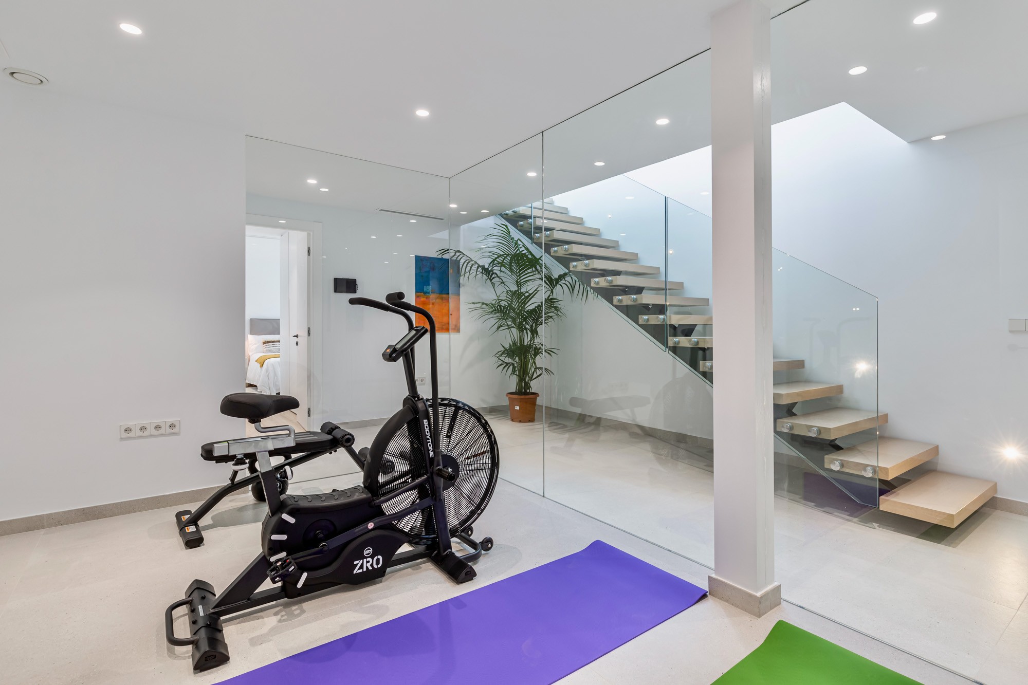 - Compact gym with free weights, static bike, rowing machine, kettle bell, bench, yoga mats