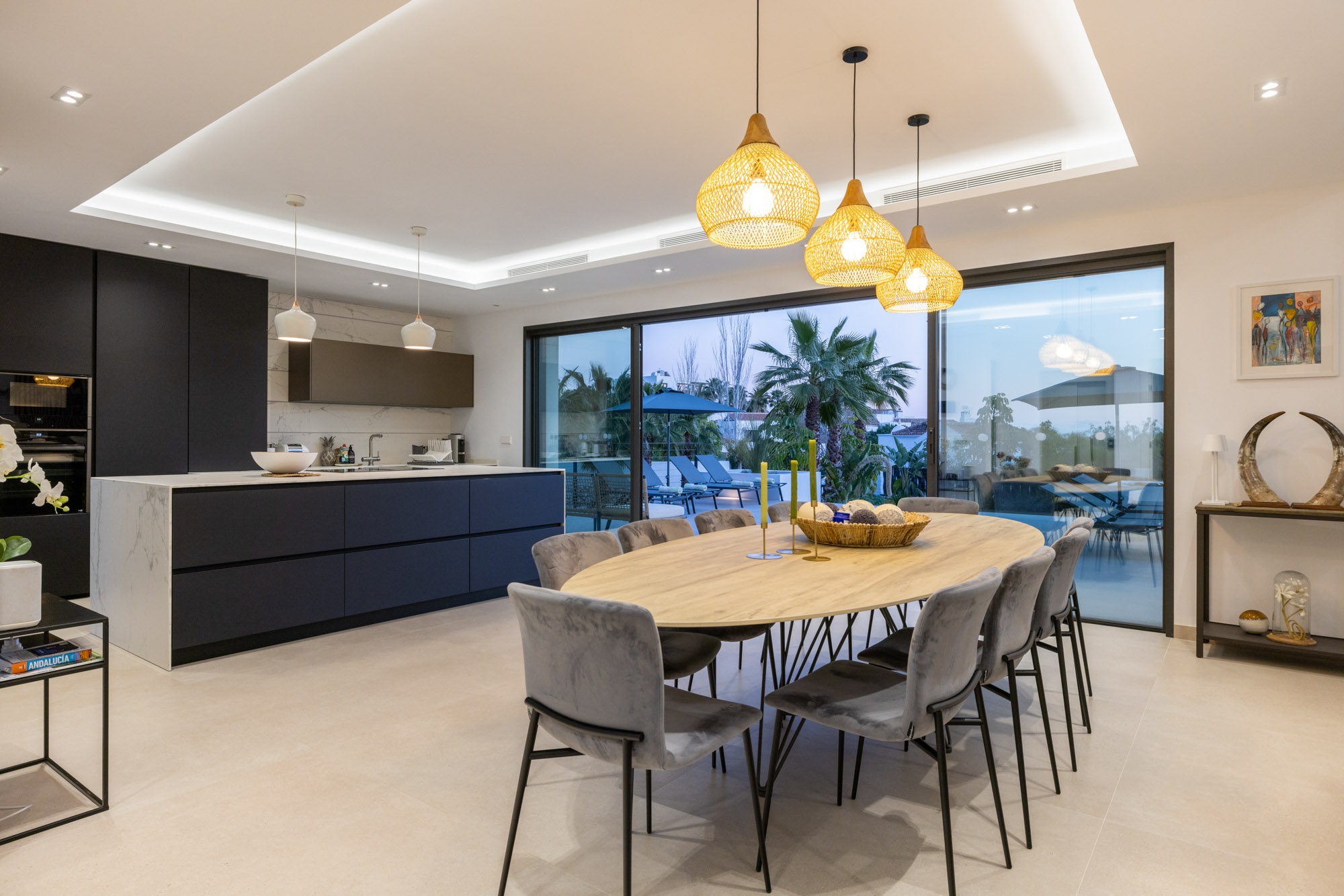 - Indoor dining table to seat 12 guests. Terrace doors fully open for an indoor-outdoor setting.