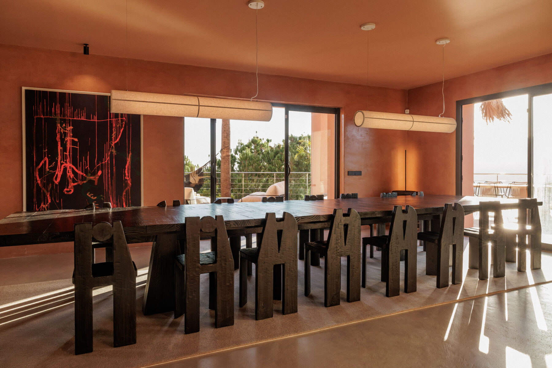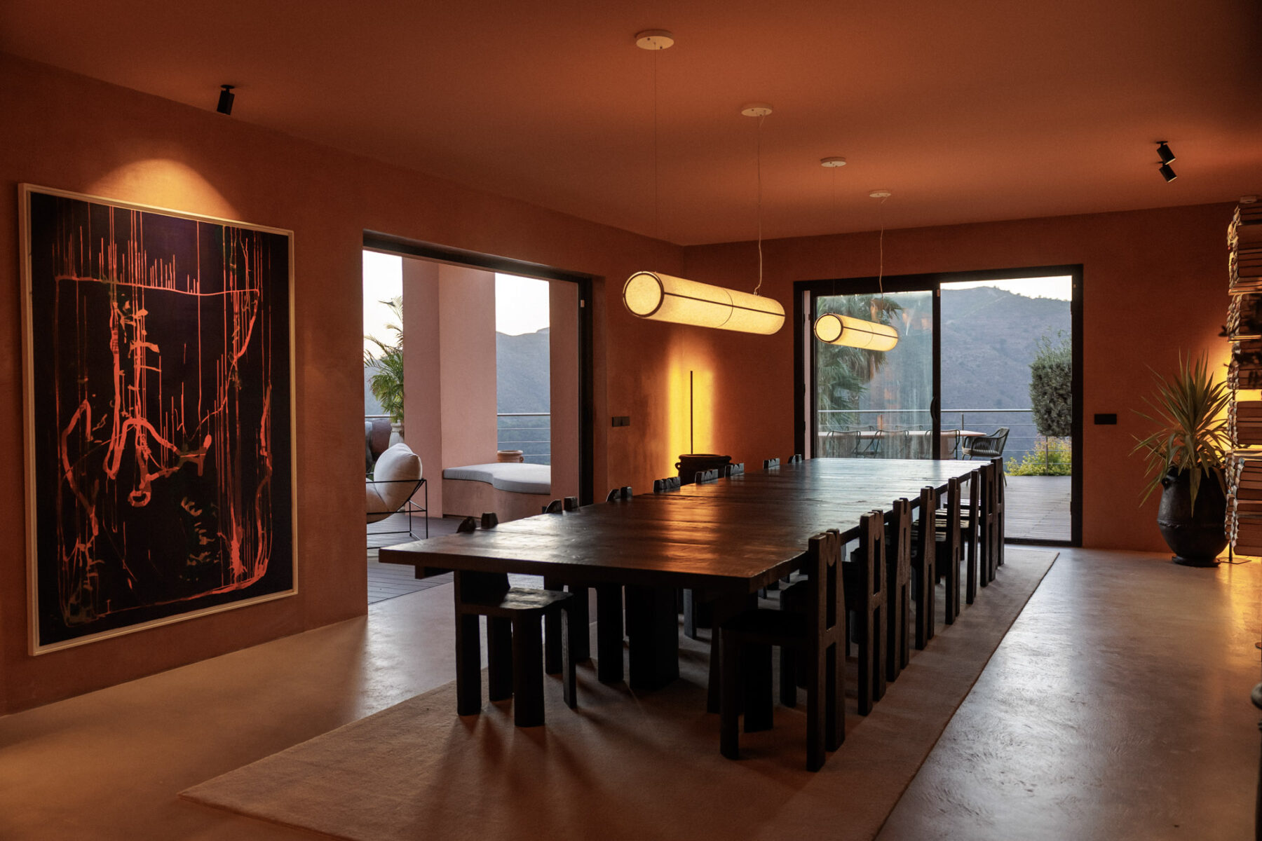 The main dining area features a statement dark wood table seating 20 guests, positioned to take in views across the terrace and surrounding countryside.