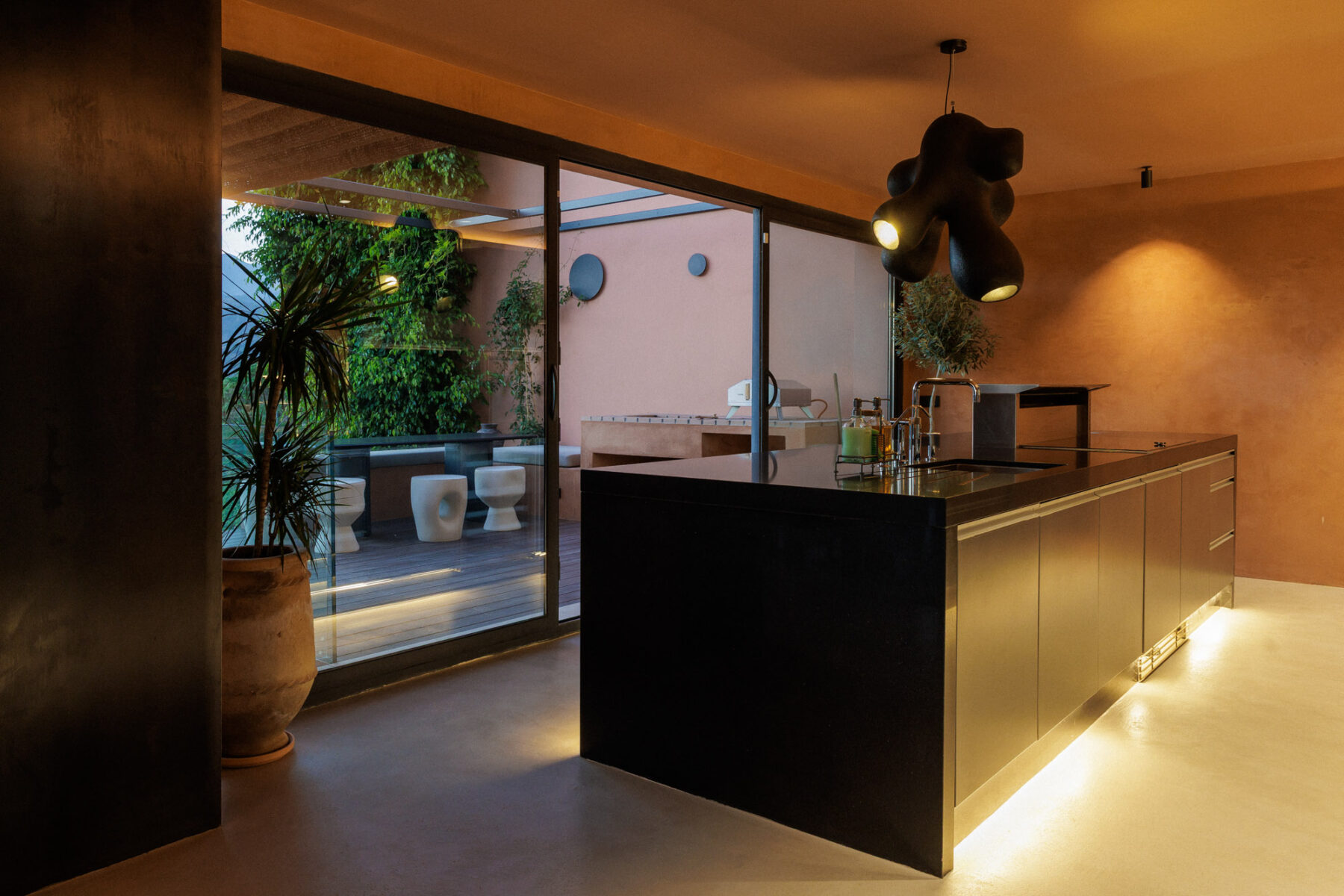 Atmosphere is central to the design. Bespoke lighting has been thoughtfully integrated throughout the house, with discreet sensors softly illuminating staircases and bathrooms. On the lower ground floor, a striking lounge area features sculptural planting and artificial olive trees that evoke the feeling of an enchanted indoor garden.